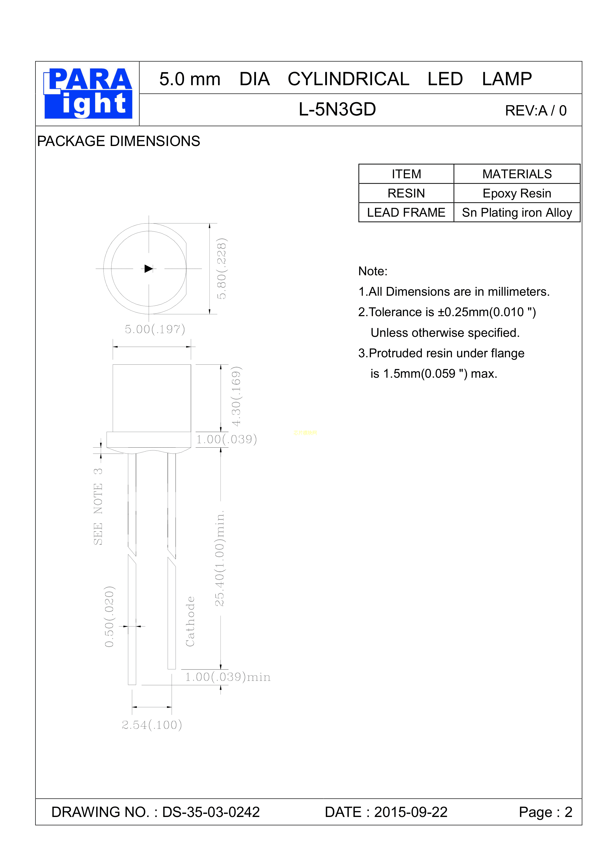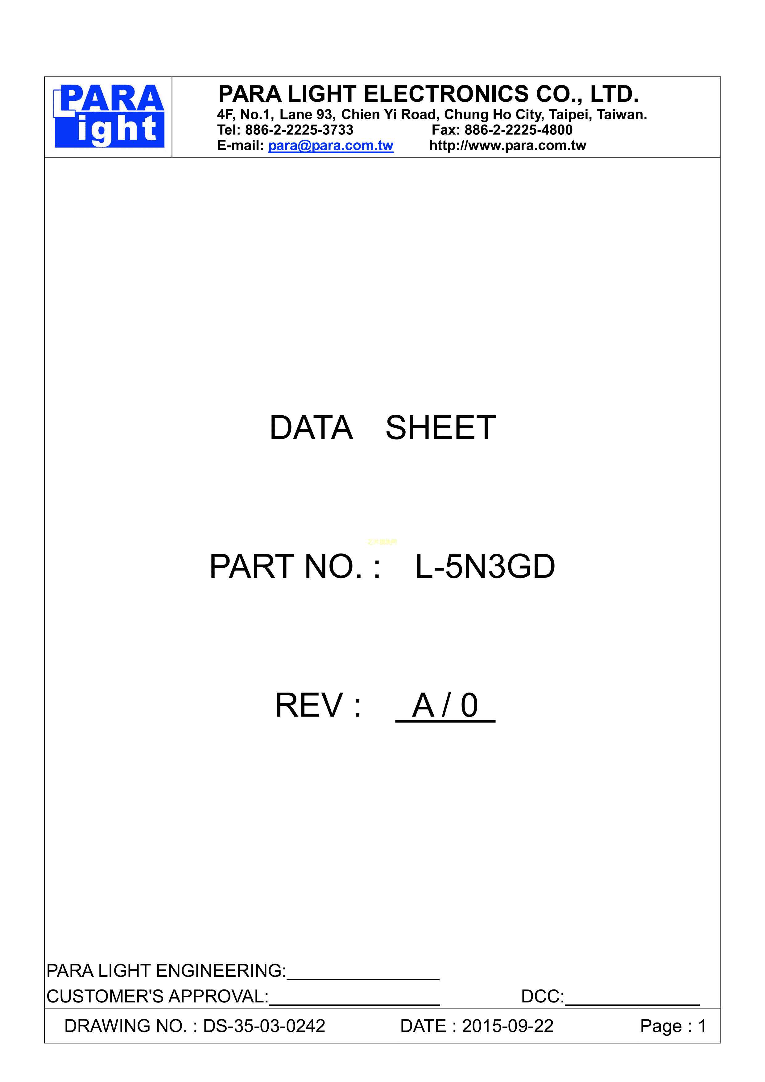 L-5N3GD数据手册插件φ5mm封装PARALIGHT(台湾光鼎)PDF规格书,中英文下载