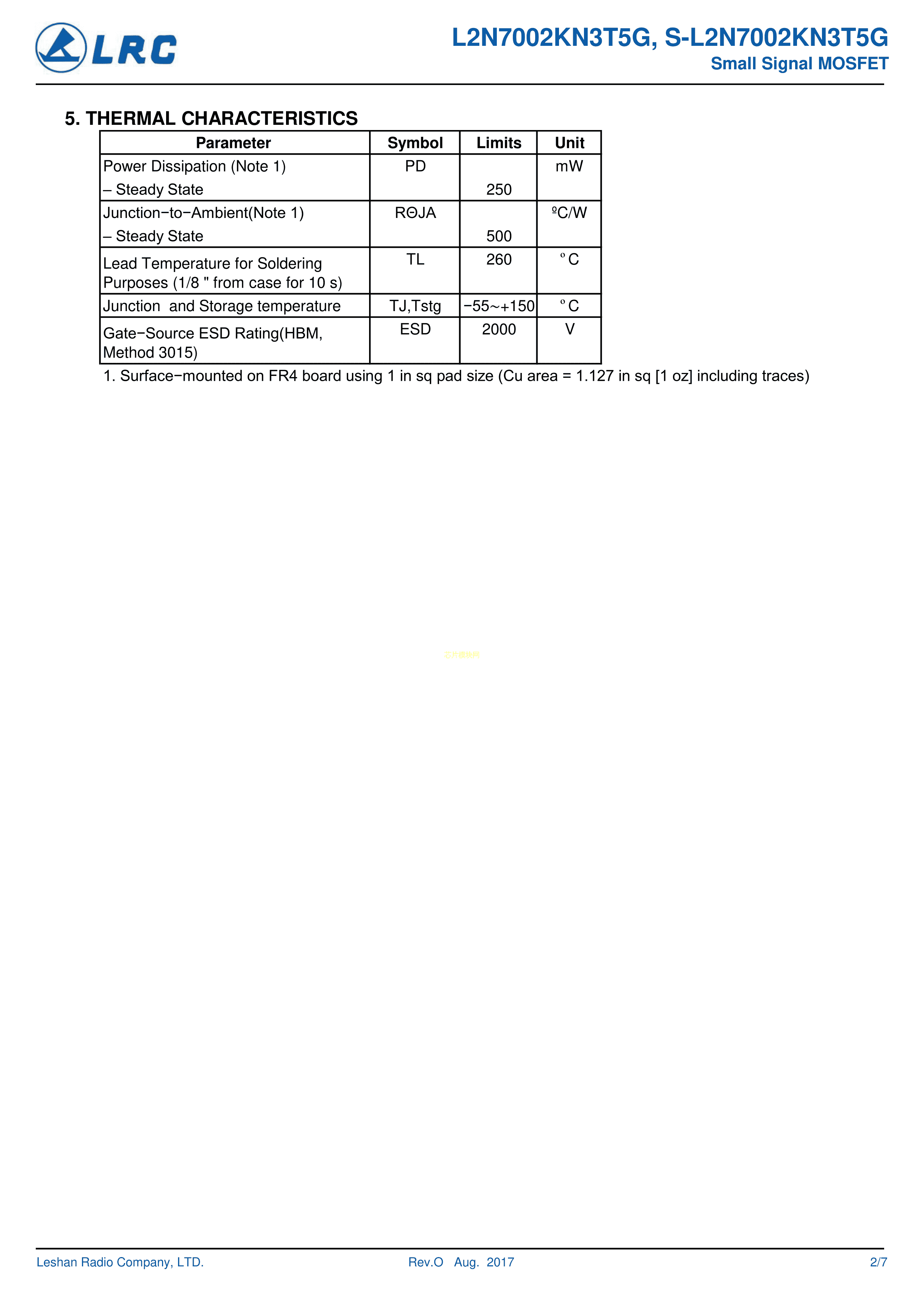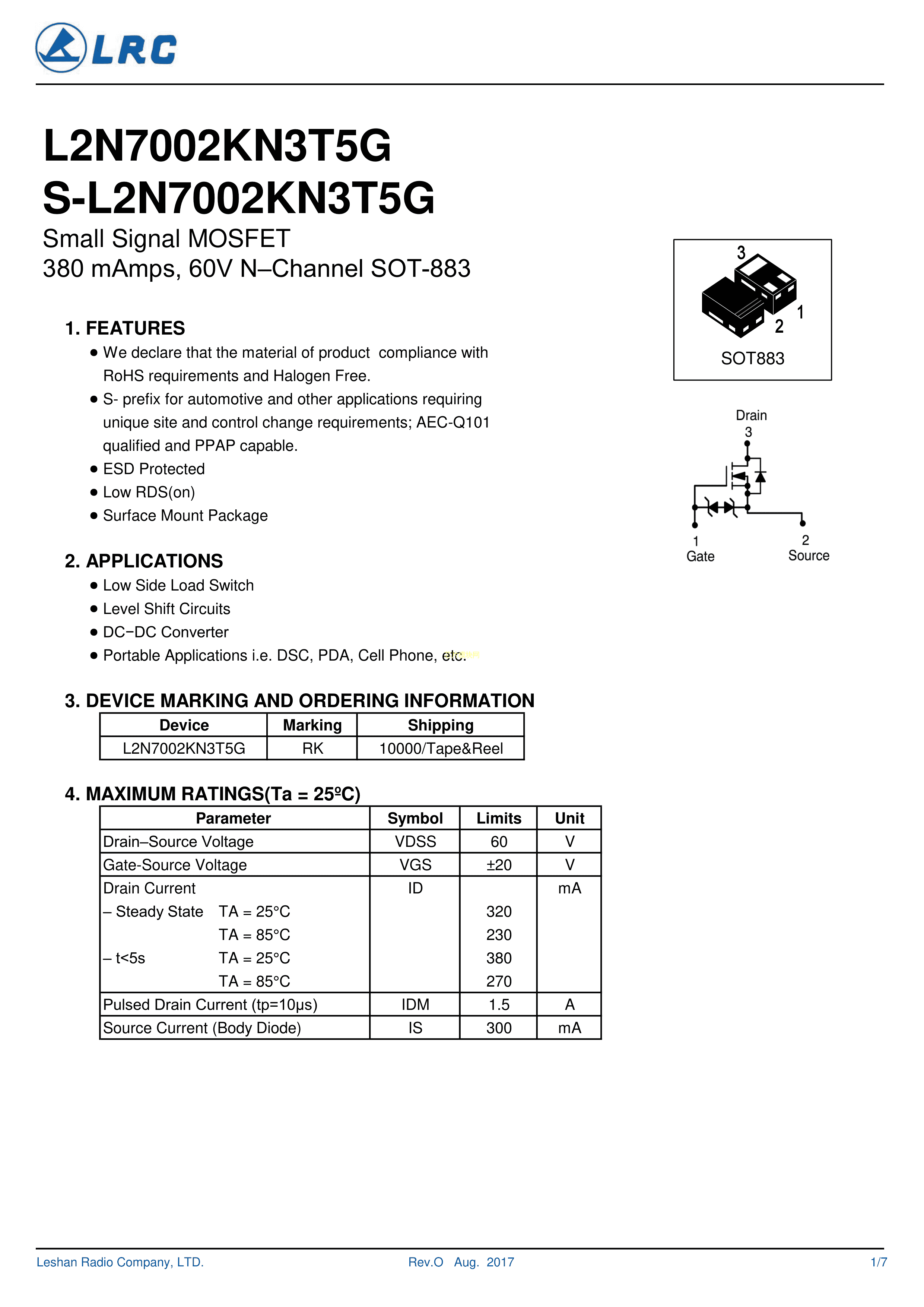 L2N7002KN3T5G-OP数据手册SOT-883封装LRC(乐山无线电)PDF规格书,中英文下