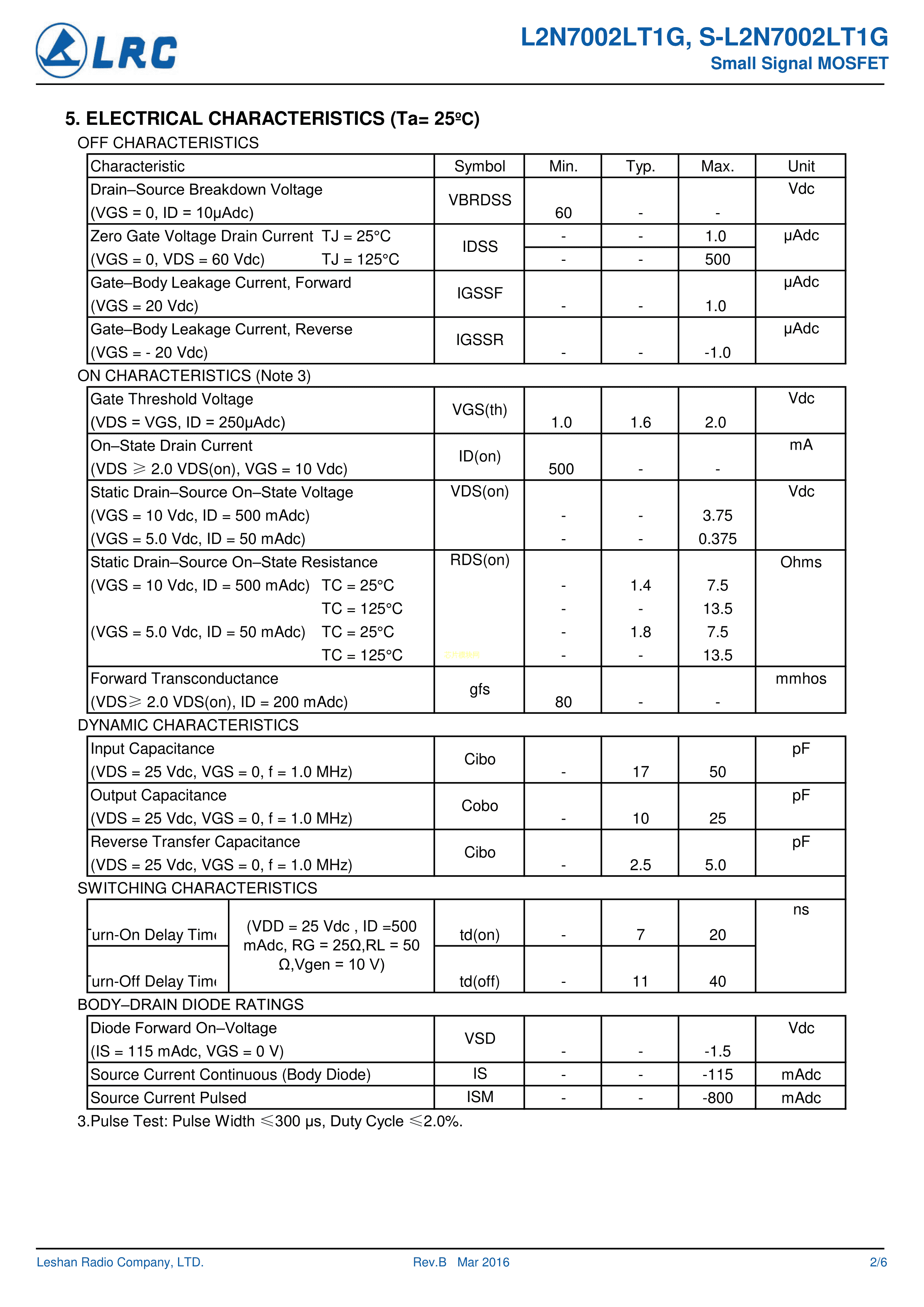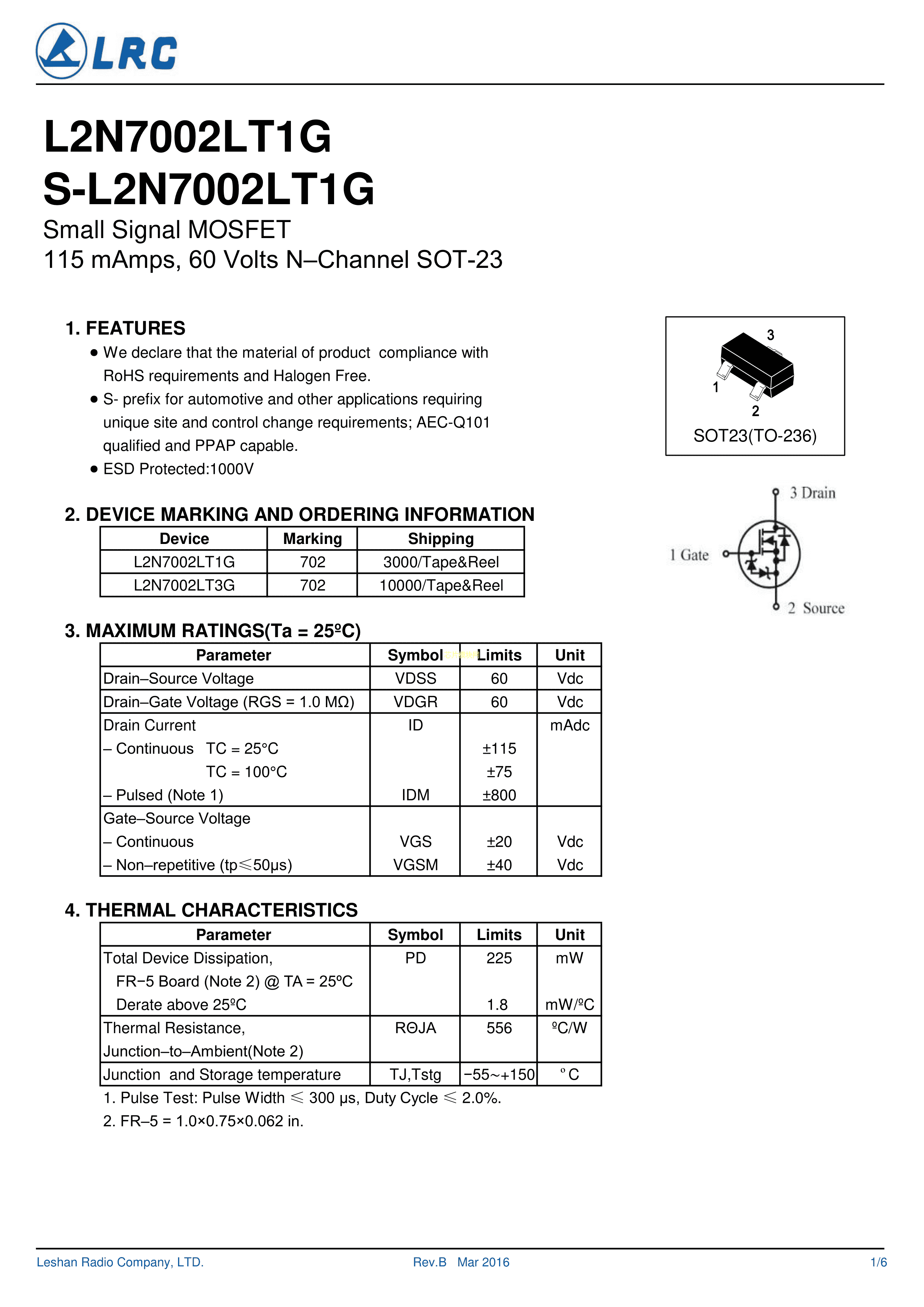 L2N7002LT1G数据手册SOT-23(SOT-23-3)封装LRC(乐山无线电)PDF规格书,