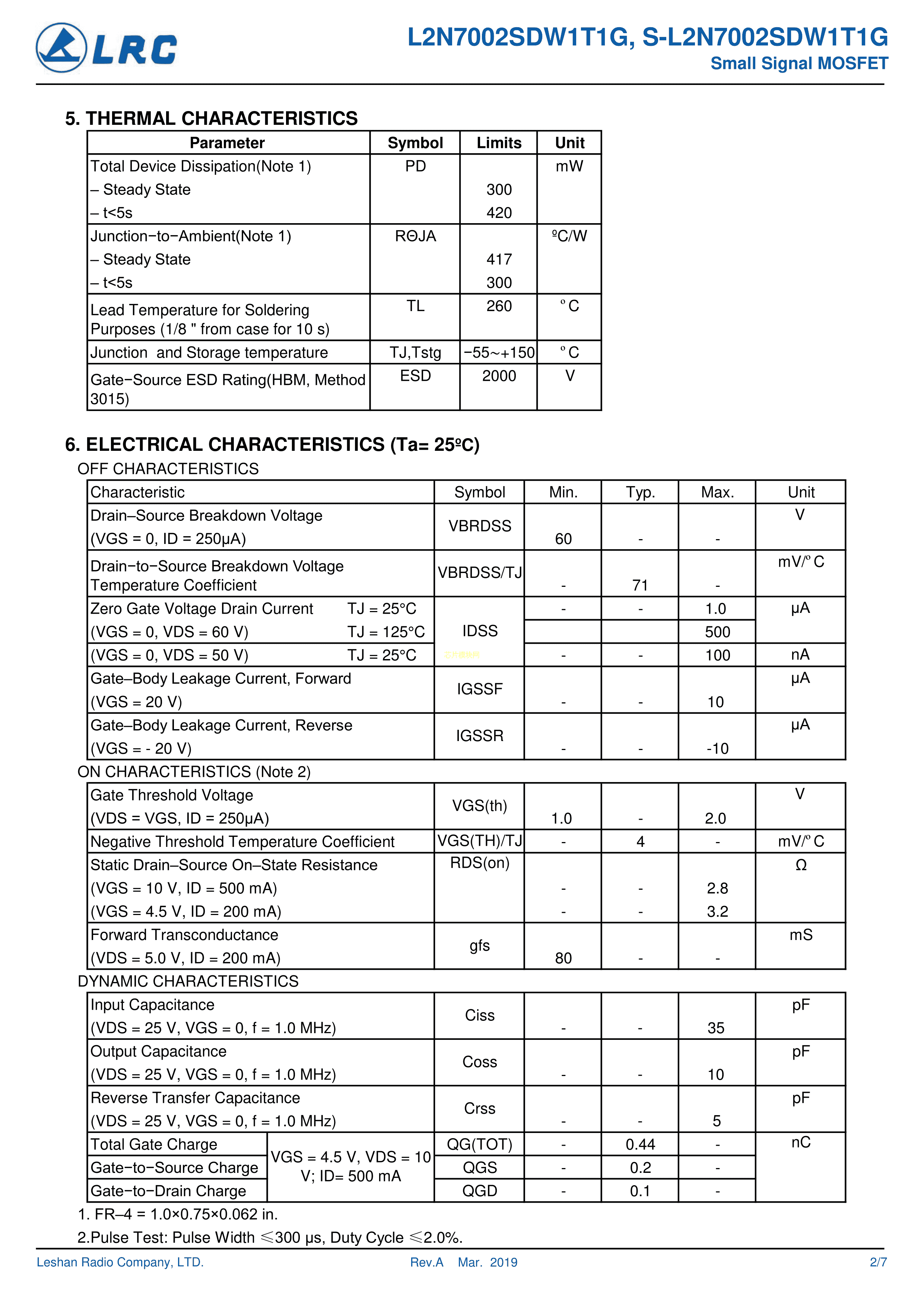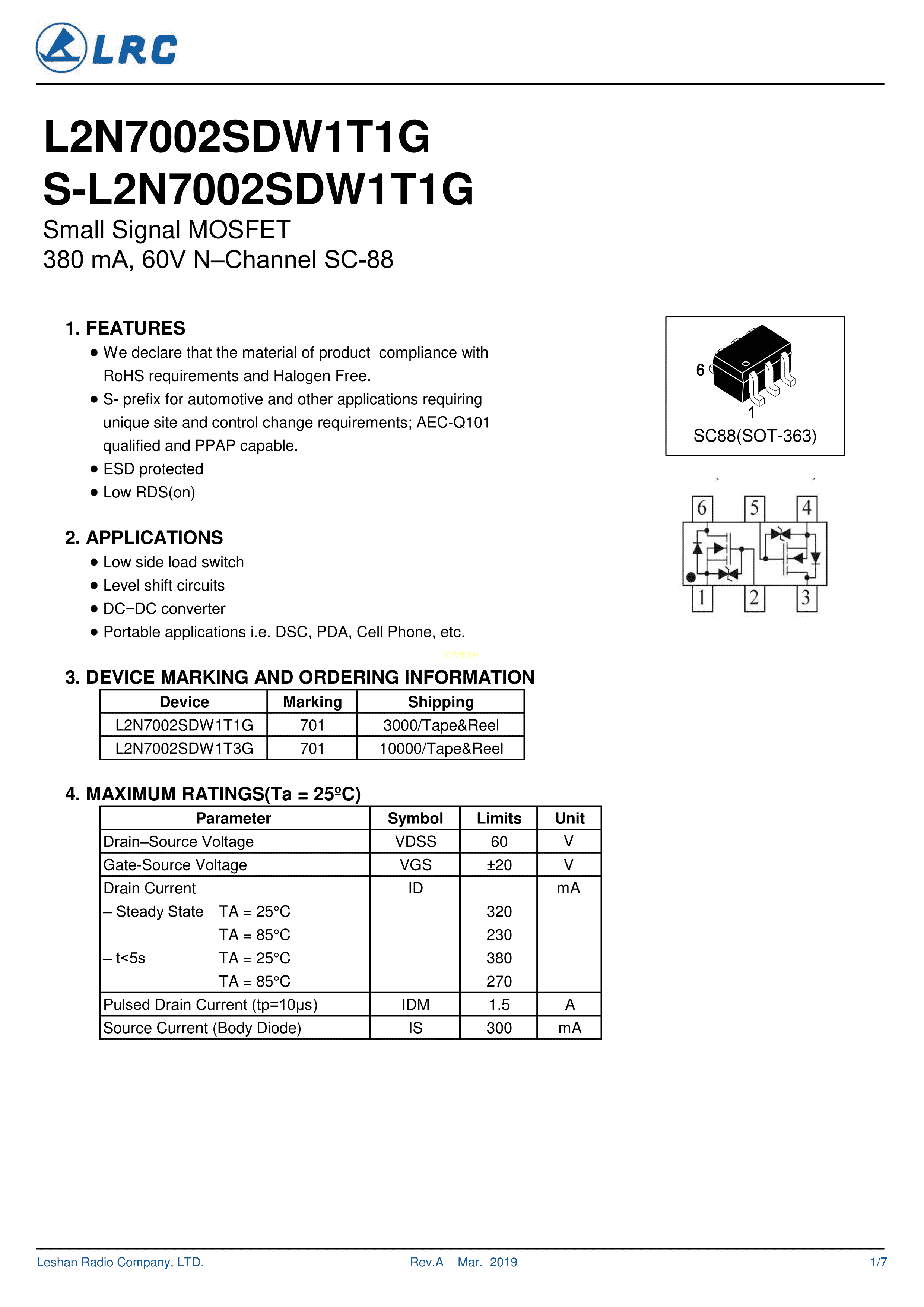 L2N7002SDW1T1G数据手册SC-88封装LRC(乐山无线电)PDF规格书,中英文下载