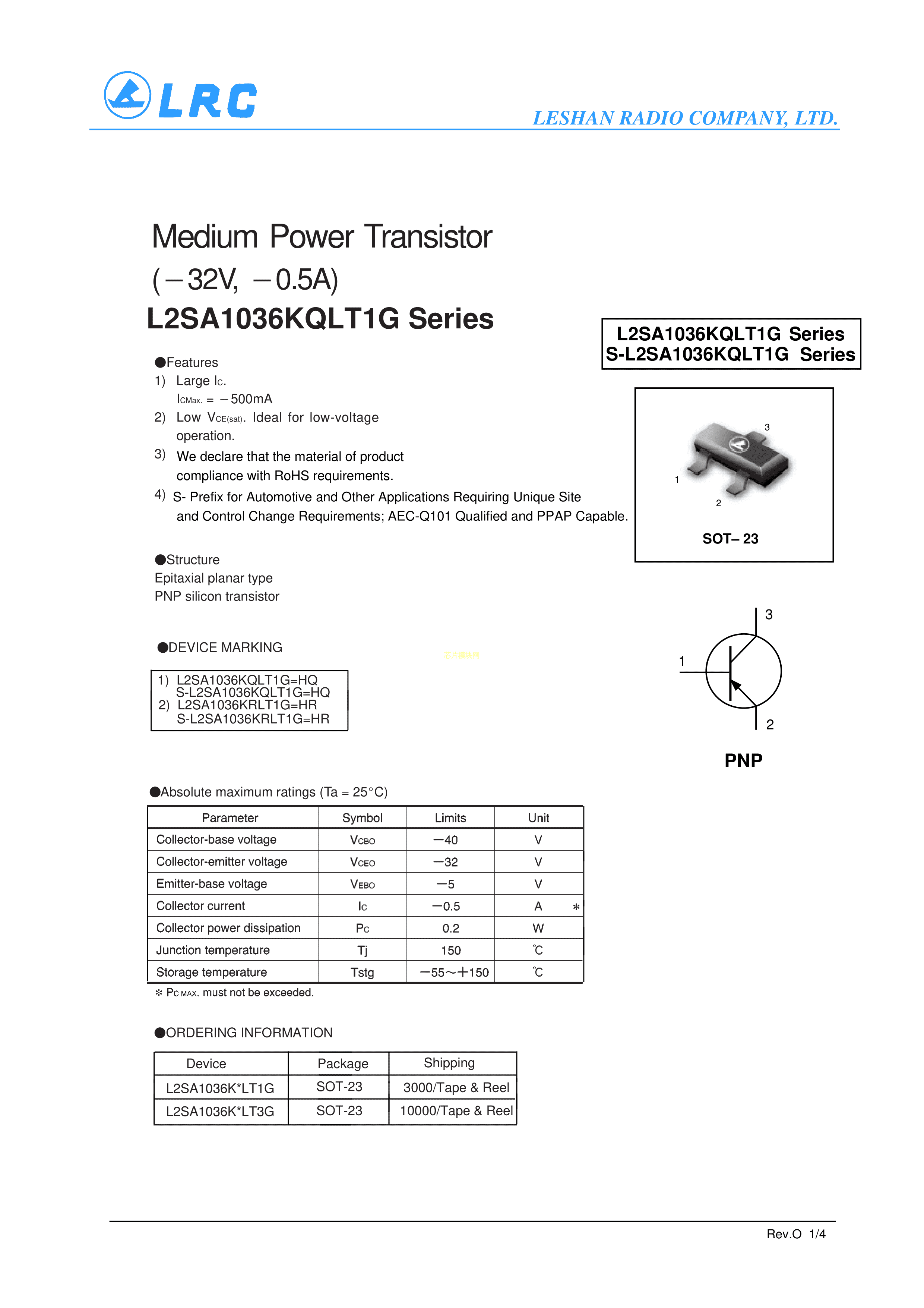 L2SA1036KRLT1G数据手册SOT-23封装LRC(乐山无线电)PDF规格书,中英文下载