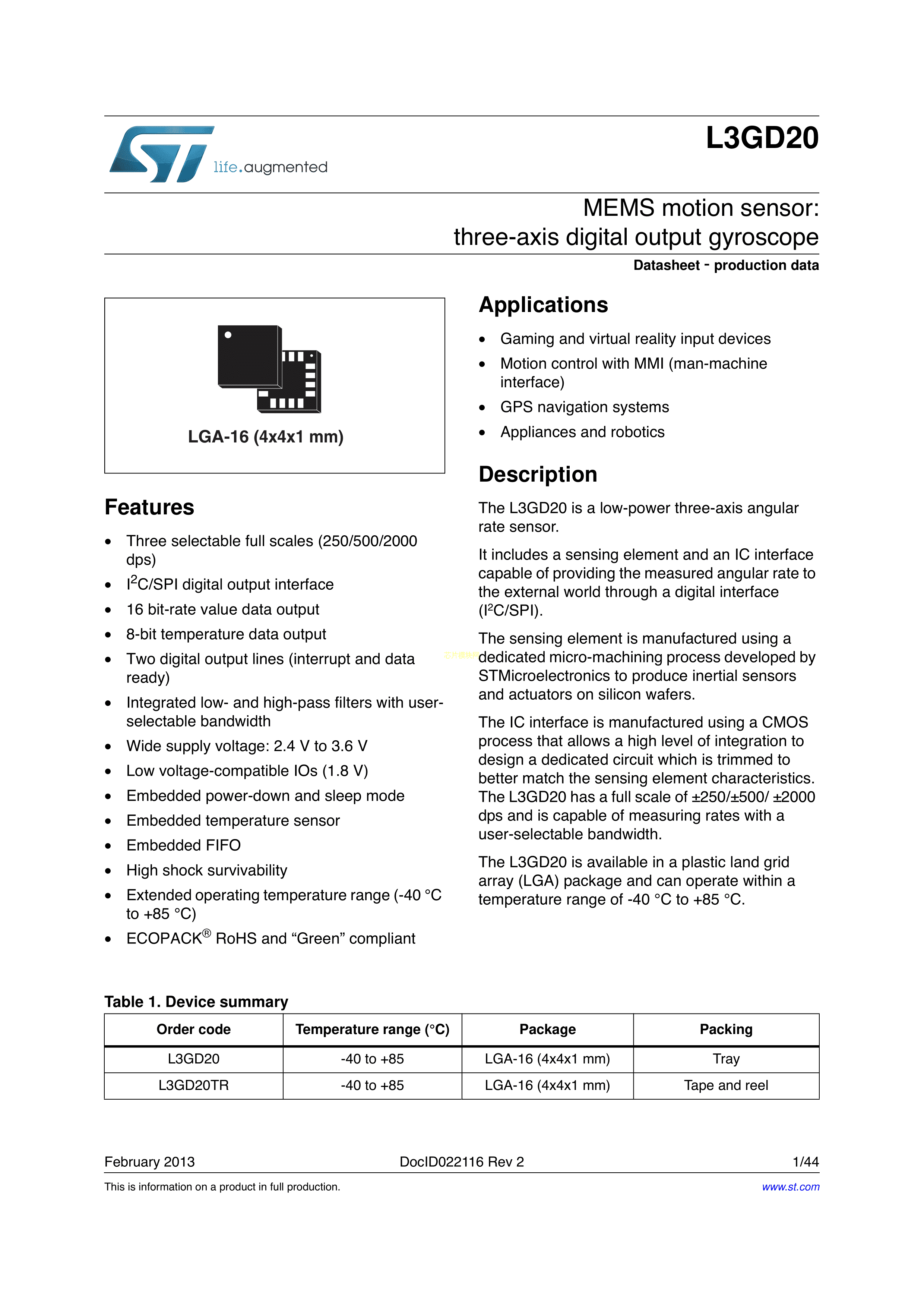 L3GD20数据手册LGA封装ST(意法半导体)PDF规格书,中英文下载