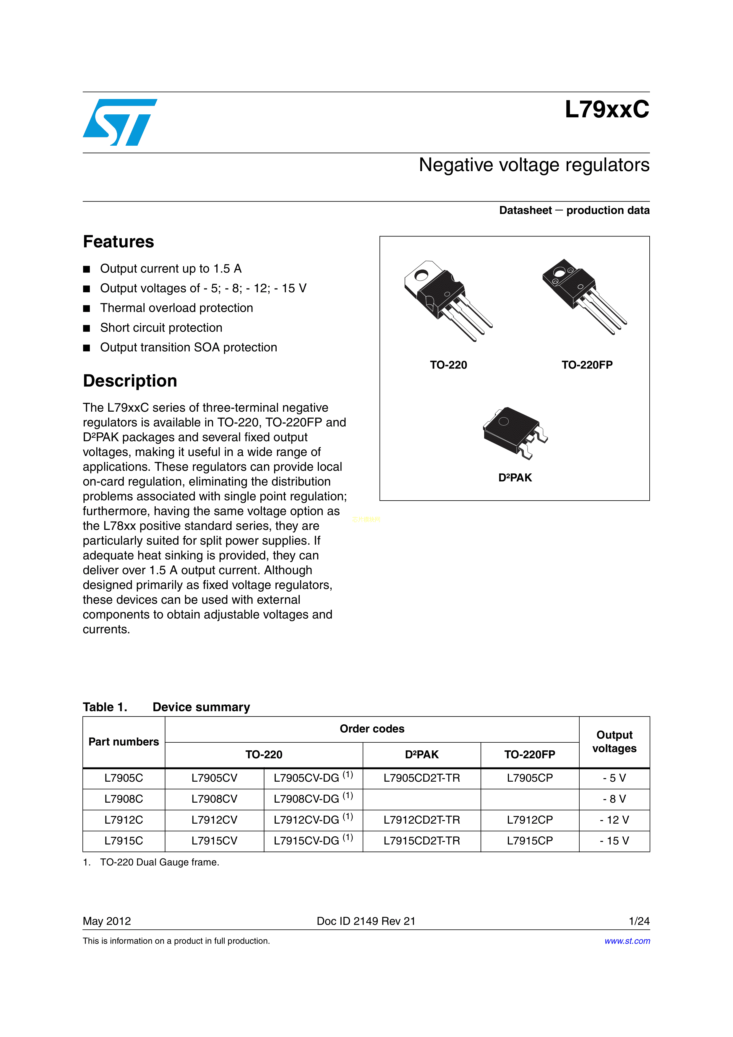 L7912CV-DG数据手册TO-220(TO-220-3)封装ST(意法半导体)PDF规格书,中英文下载