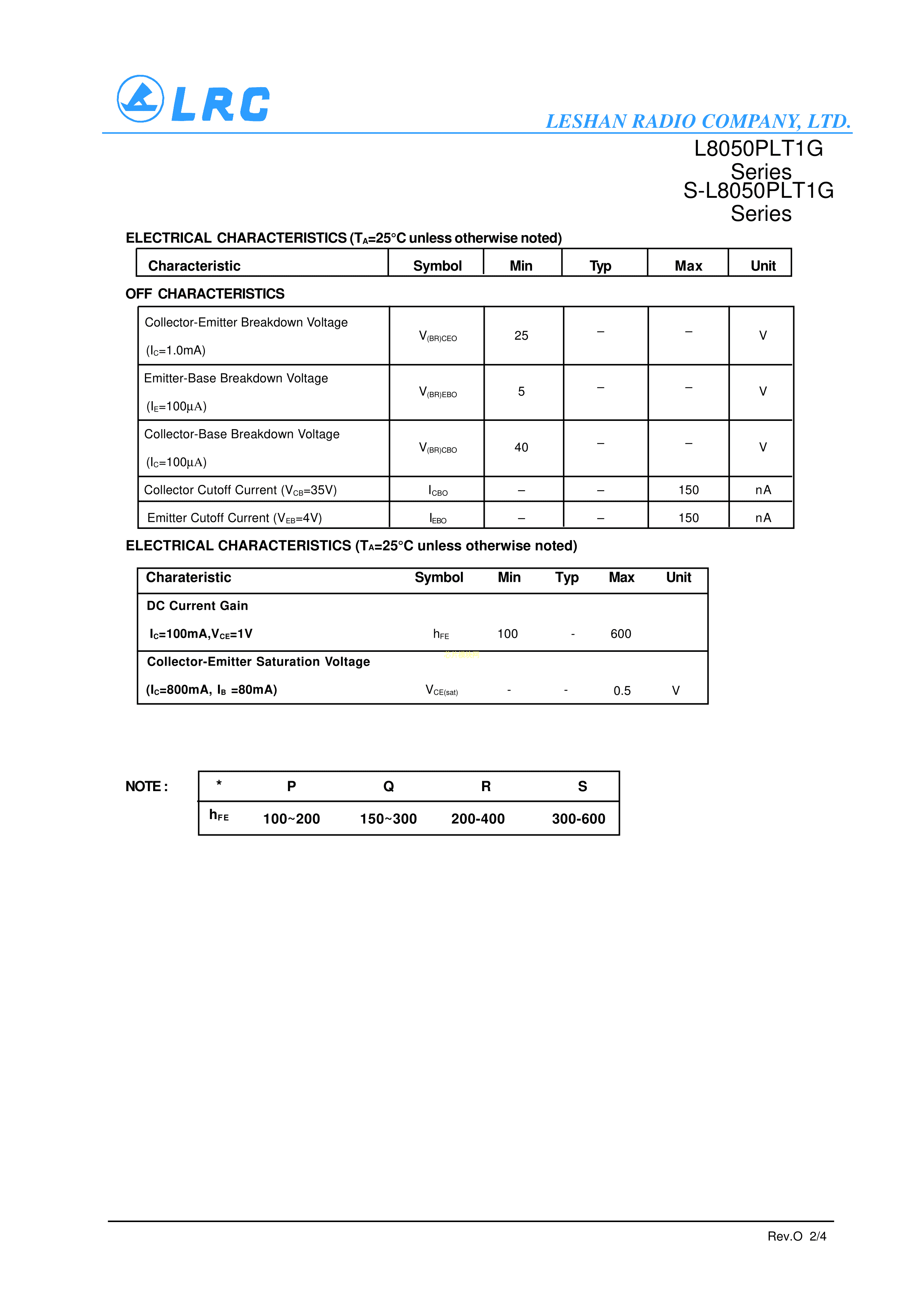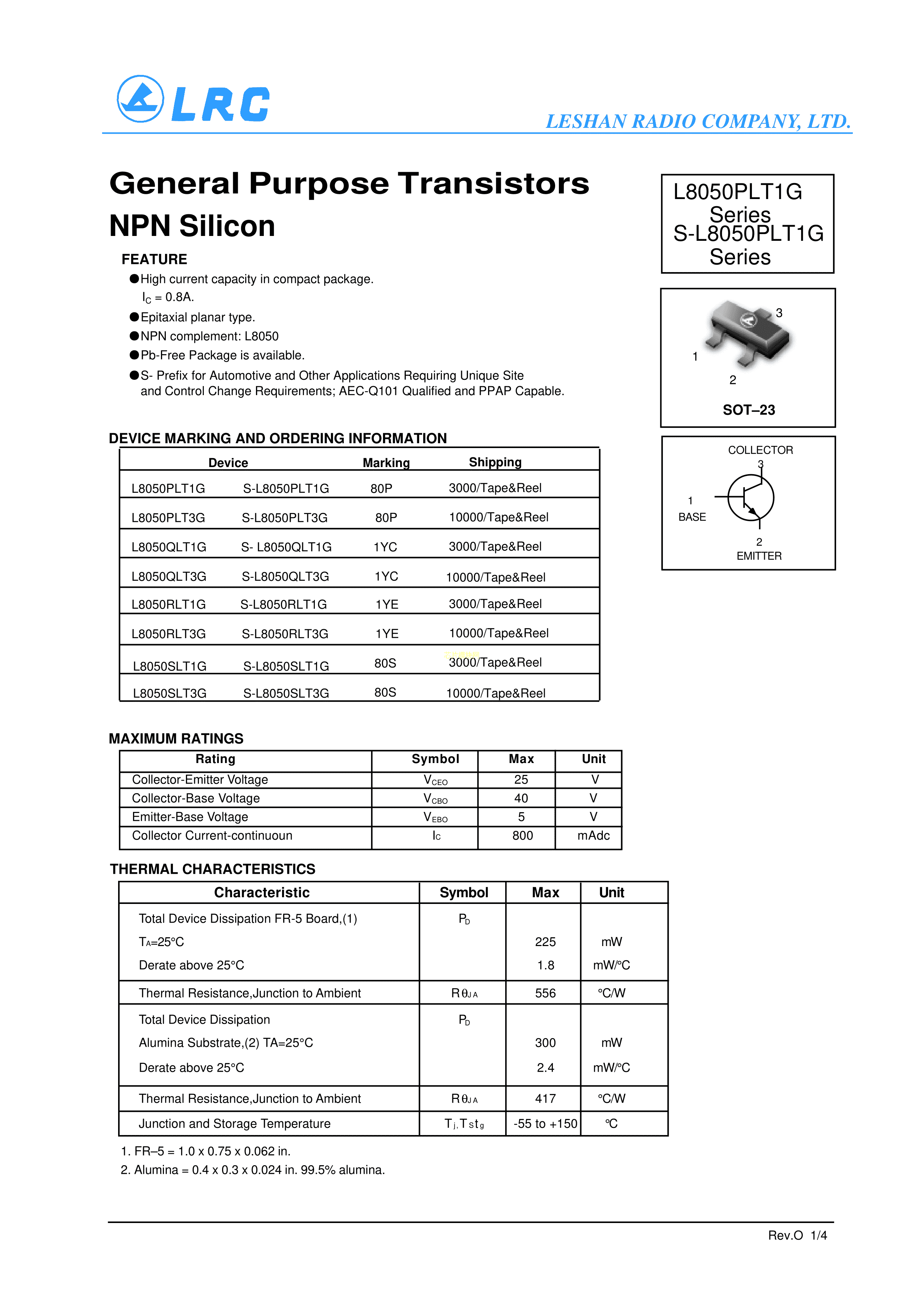 L8050PLT1G数据手册SOT-23封装LRC(乐山无线电)PDF规格书,中英文下载