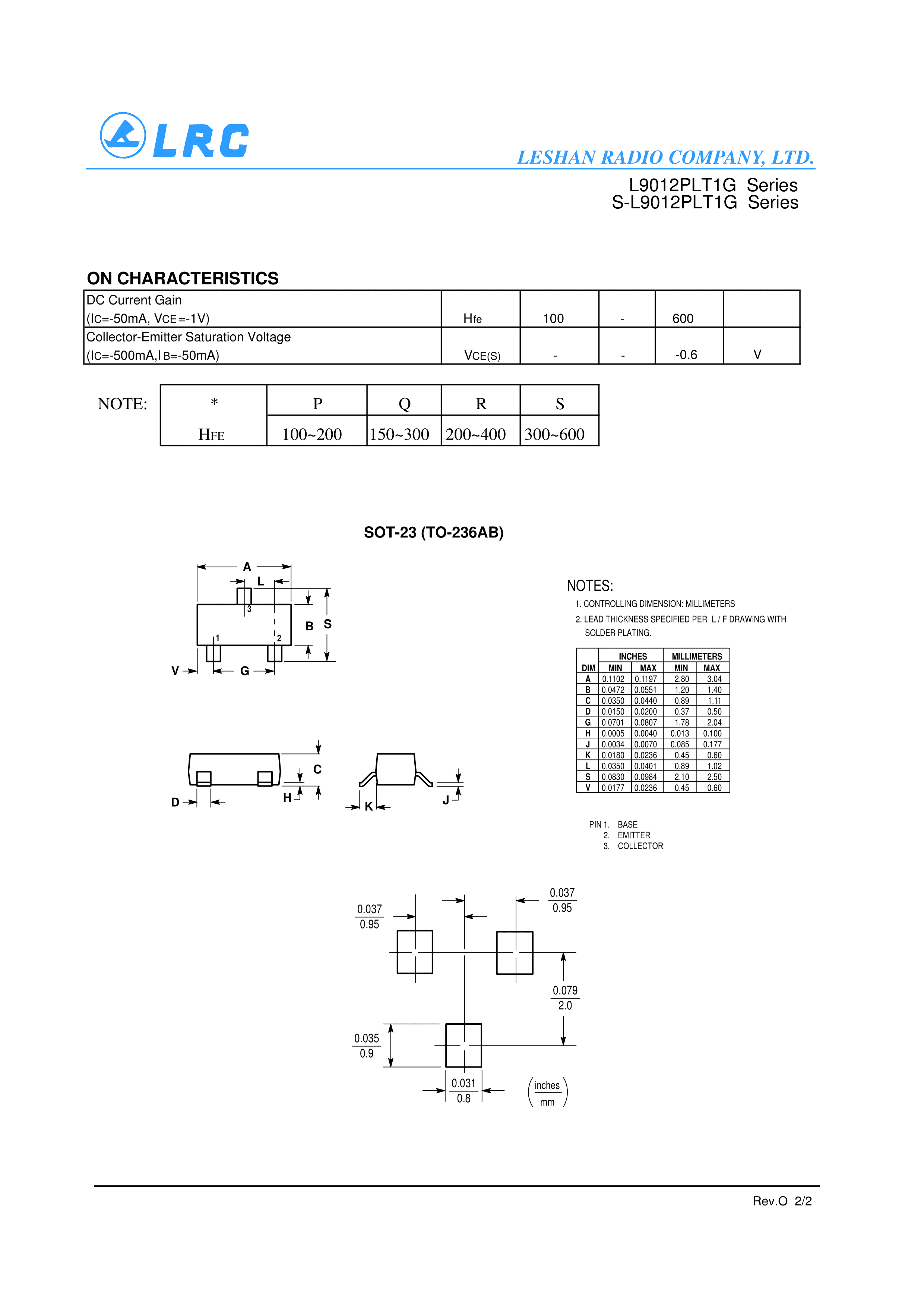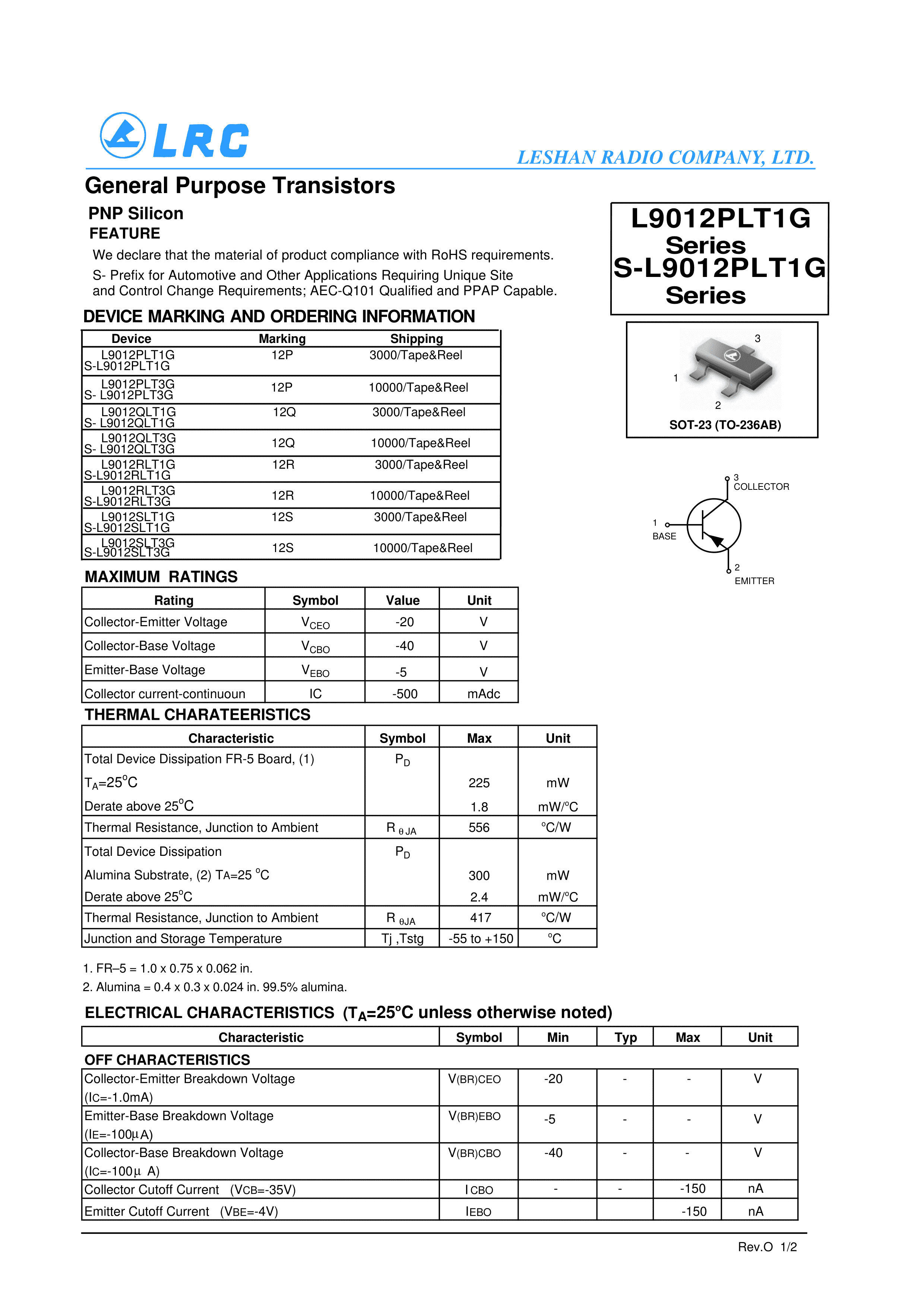 L9012QLT1G数据手册SOT-23(SOT-23-3)封装LRC(乐山无线电)PDF规格书,中