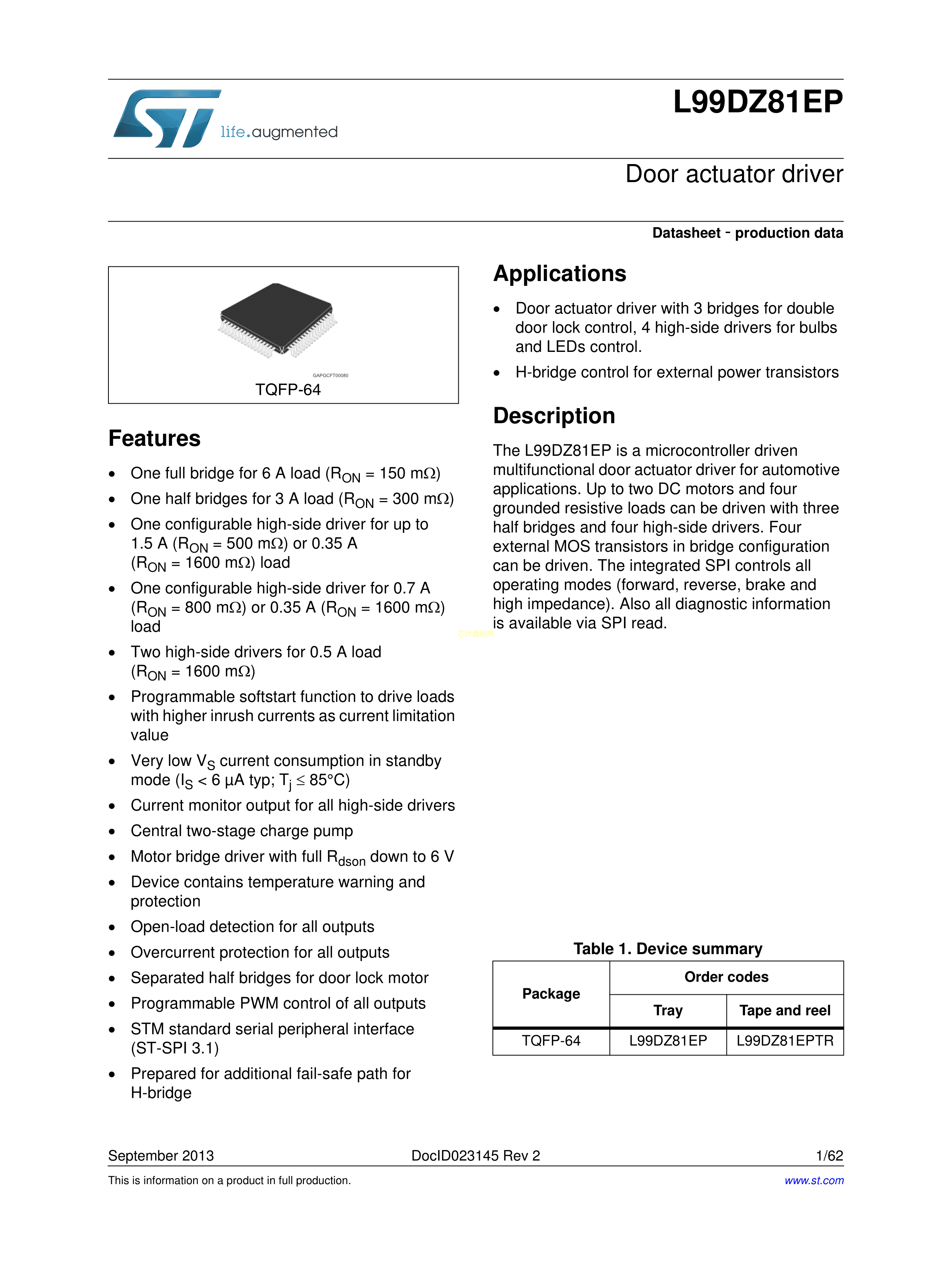 L99DZ81EP数据手册TQFP-64(10x10)封装ST(意法半导体)PDF规格书,中英文下载