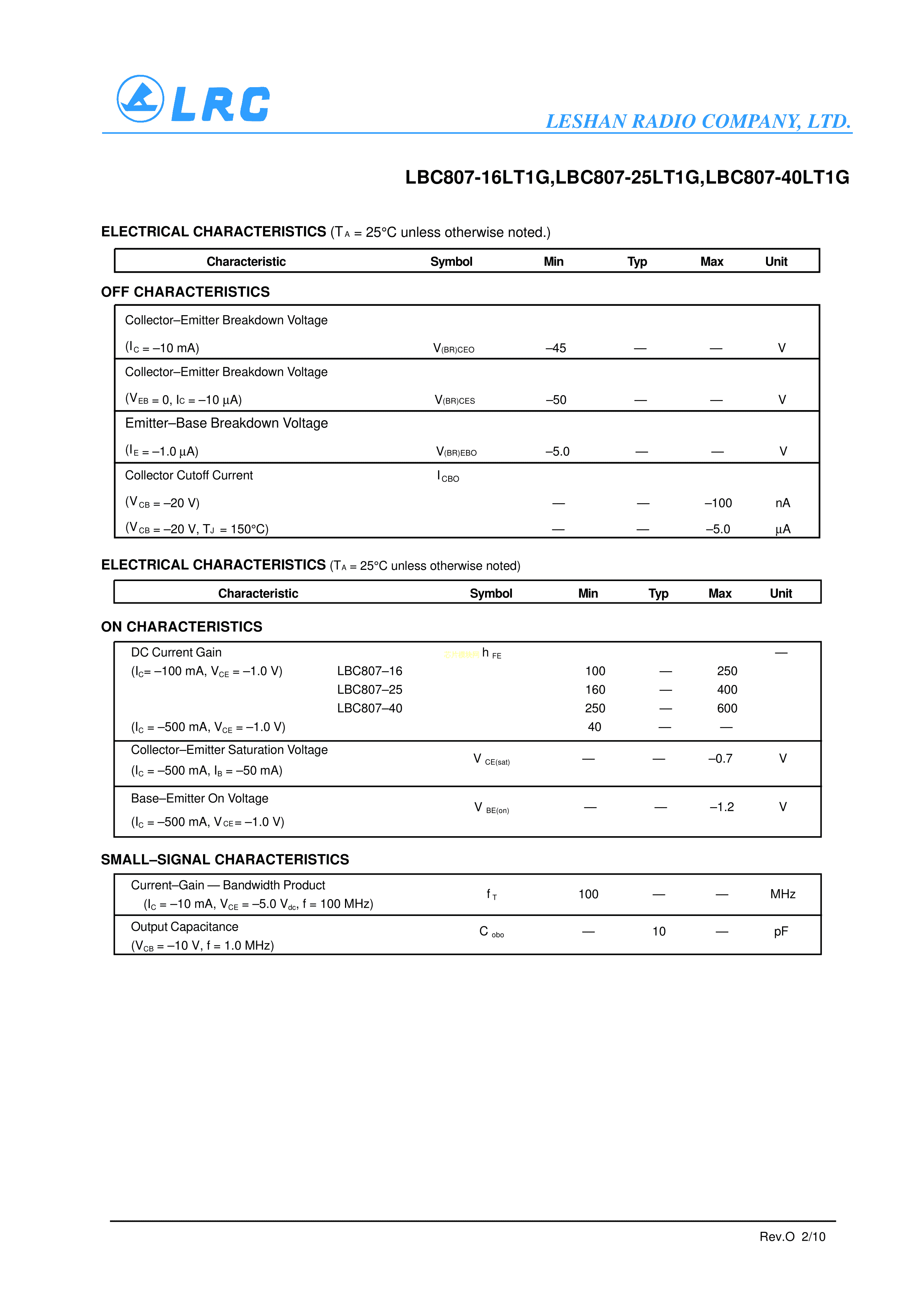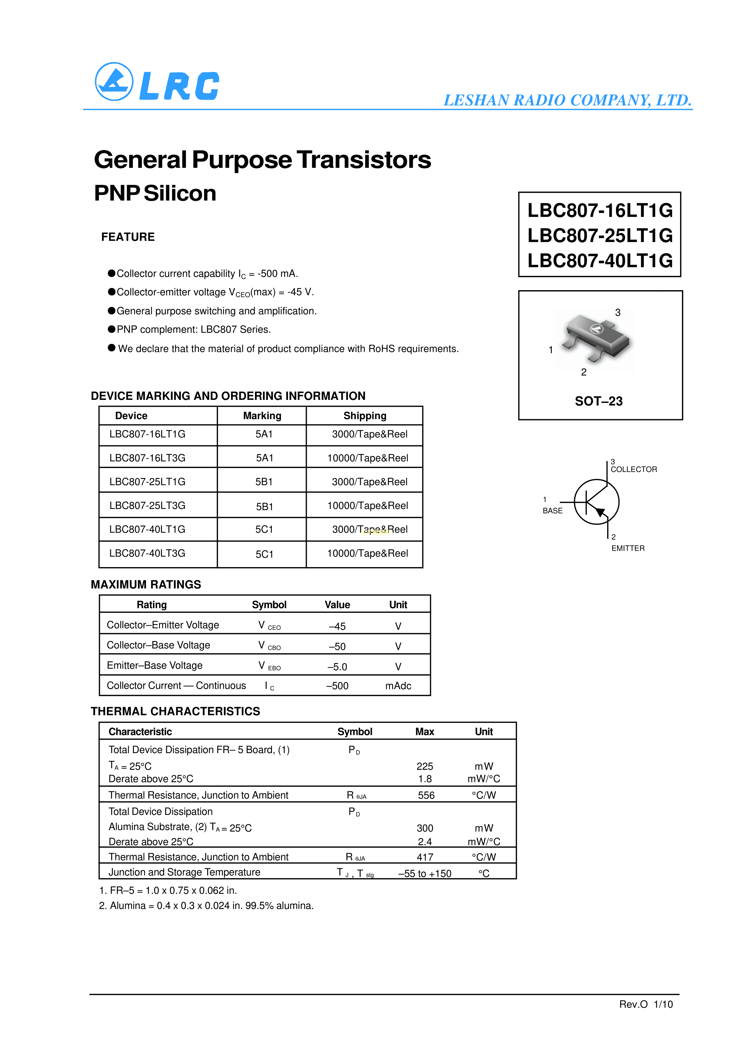 LBC807-25LT1G数据手册SOT-23(SOT-23-3)封装LRC(乐山无线电)PDF规格