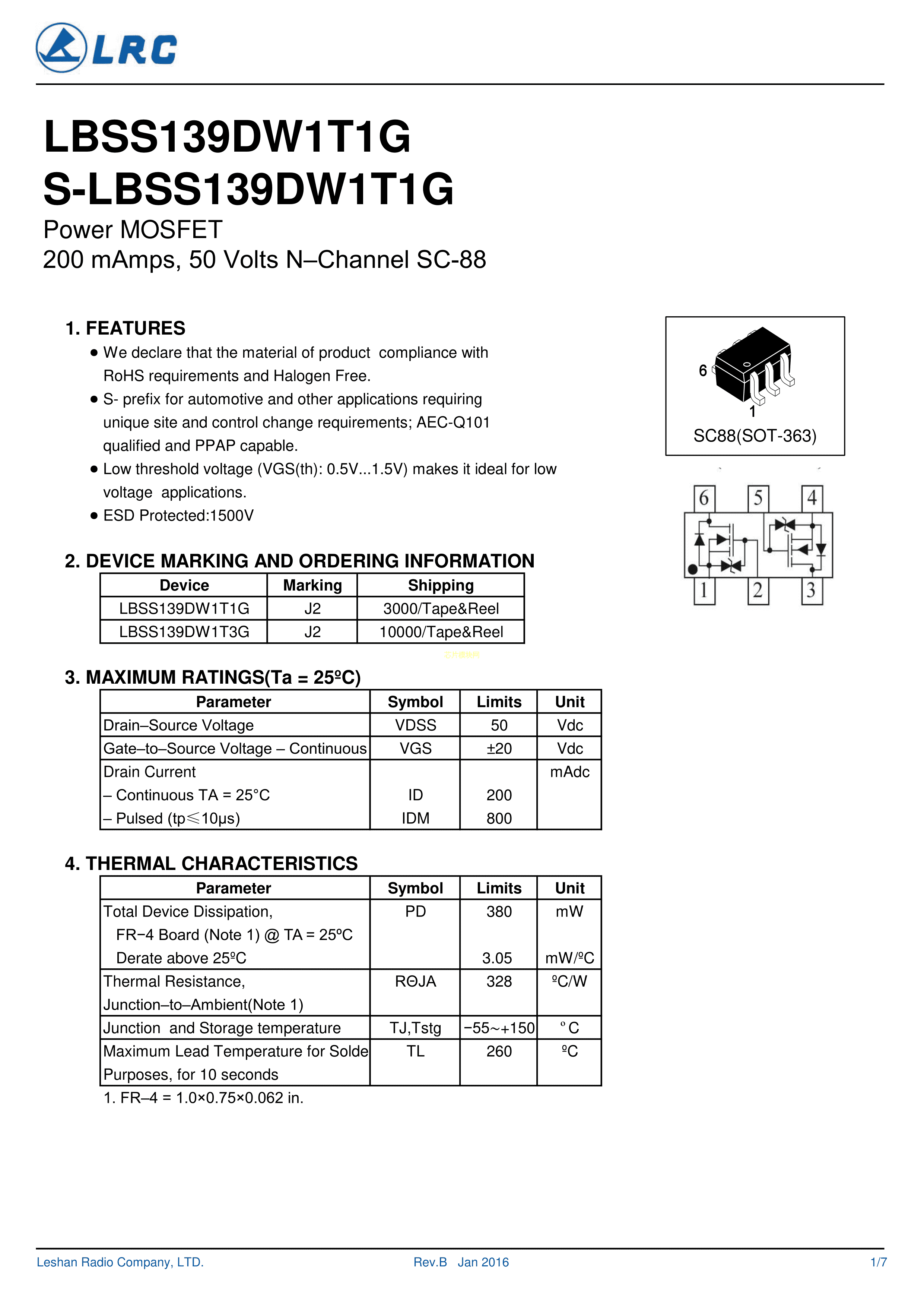 LBSS139DW1T1G数据手册SC-88封装LRC(乐山无线电)PDF规格书,中英文下载