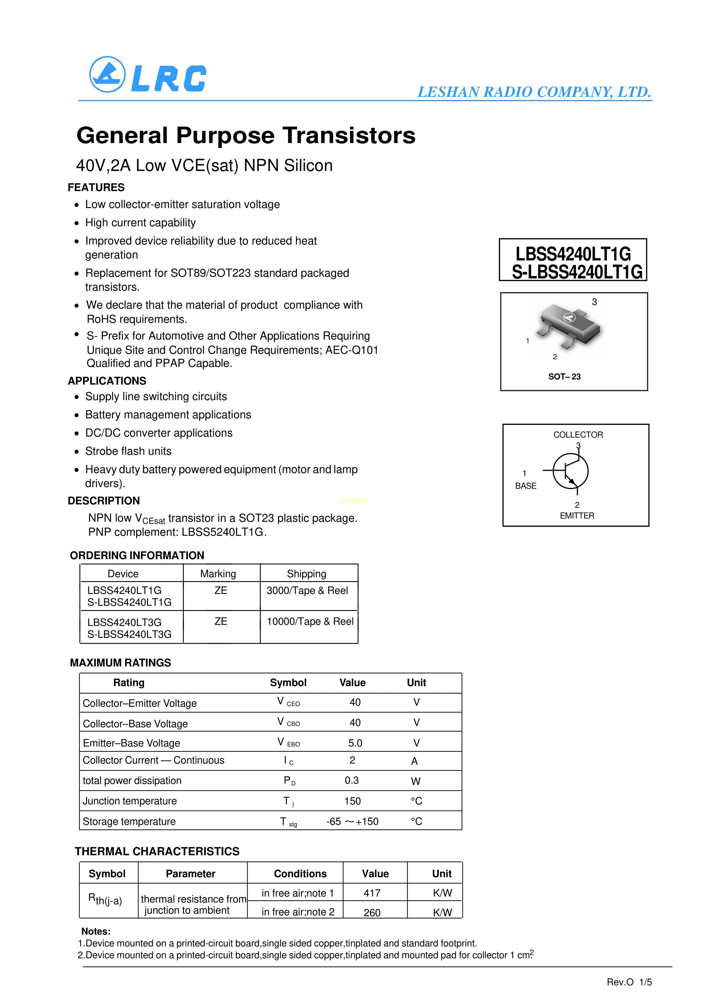 LBSS4240LT1G数据手册SOT-23(SOT-23-3)封装LRC(乐山无线电)PDF规格书