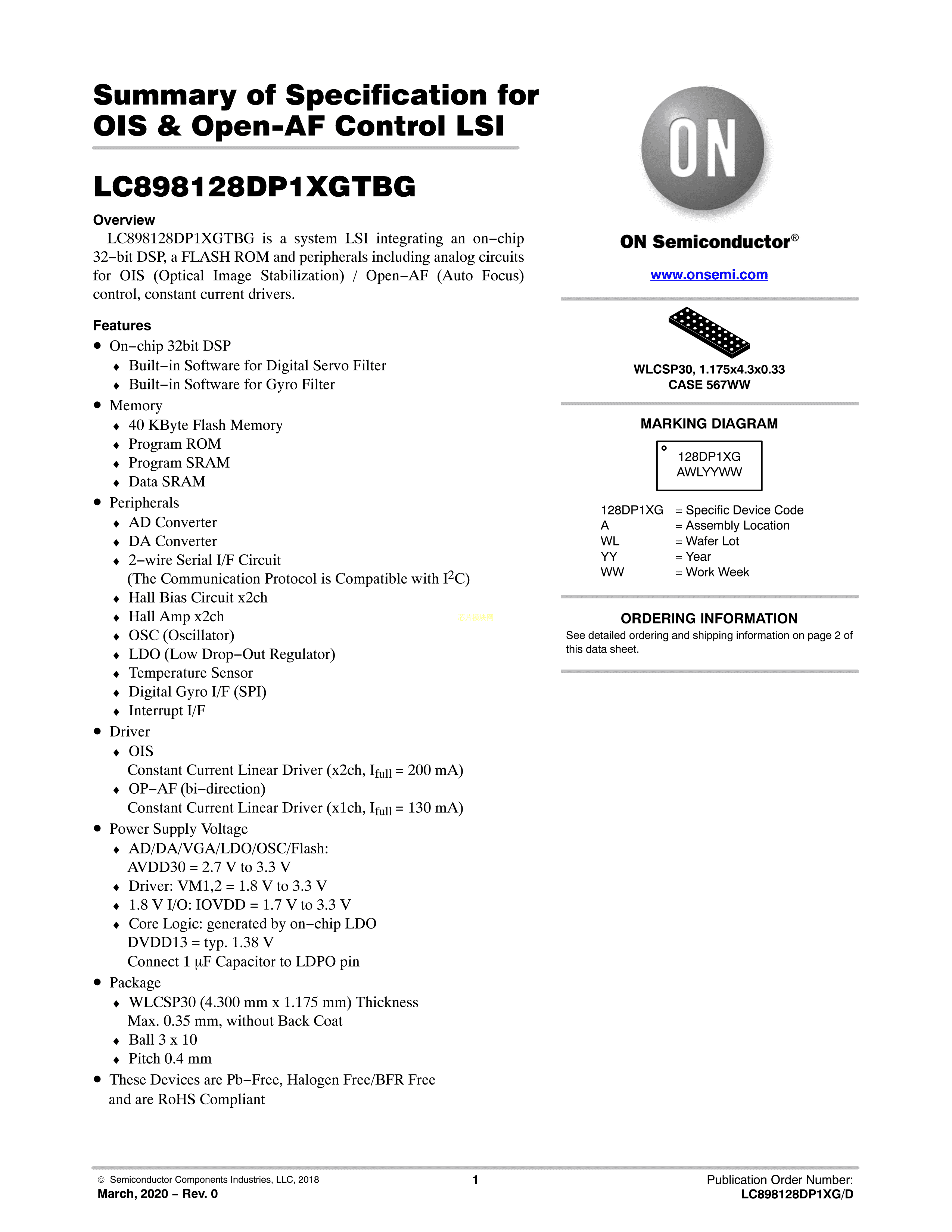 LC898128DP1XGTBG数据手册WLCSP-30封装onsemi(安森美)PDF规格书,中英文下载