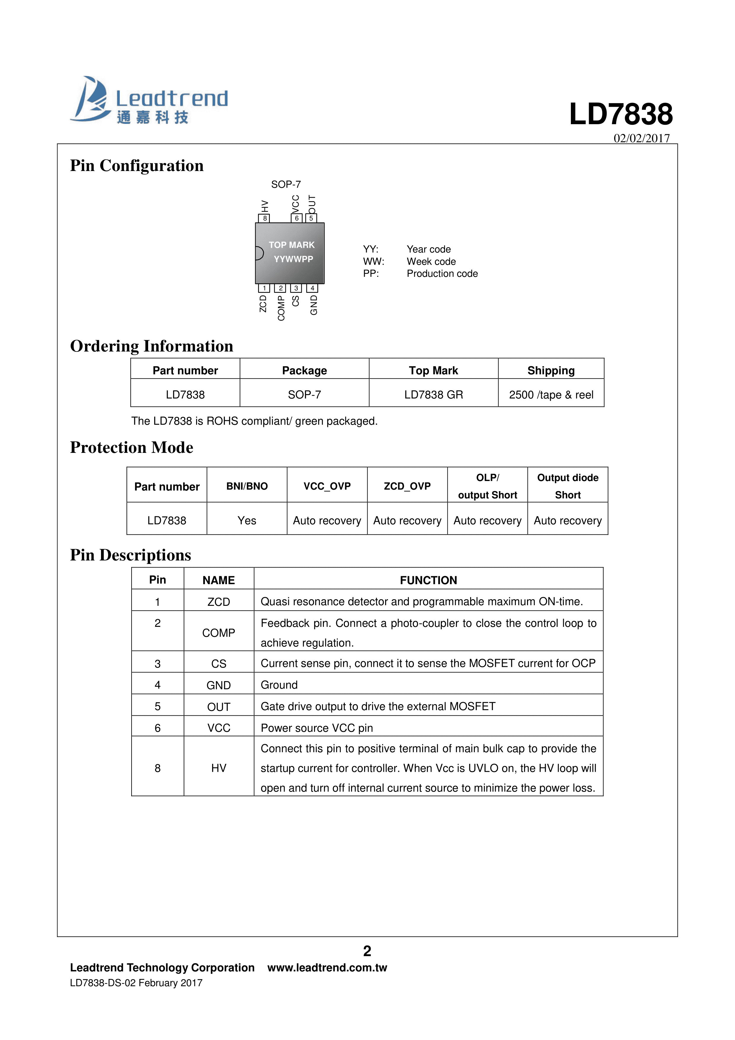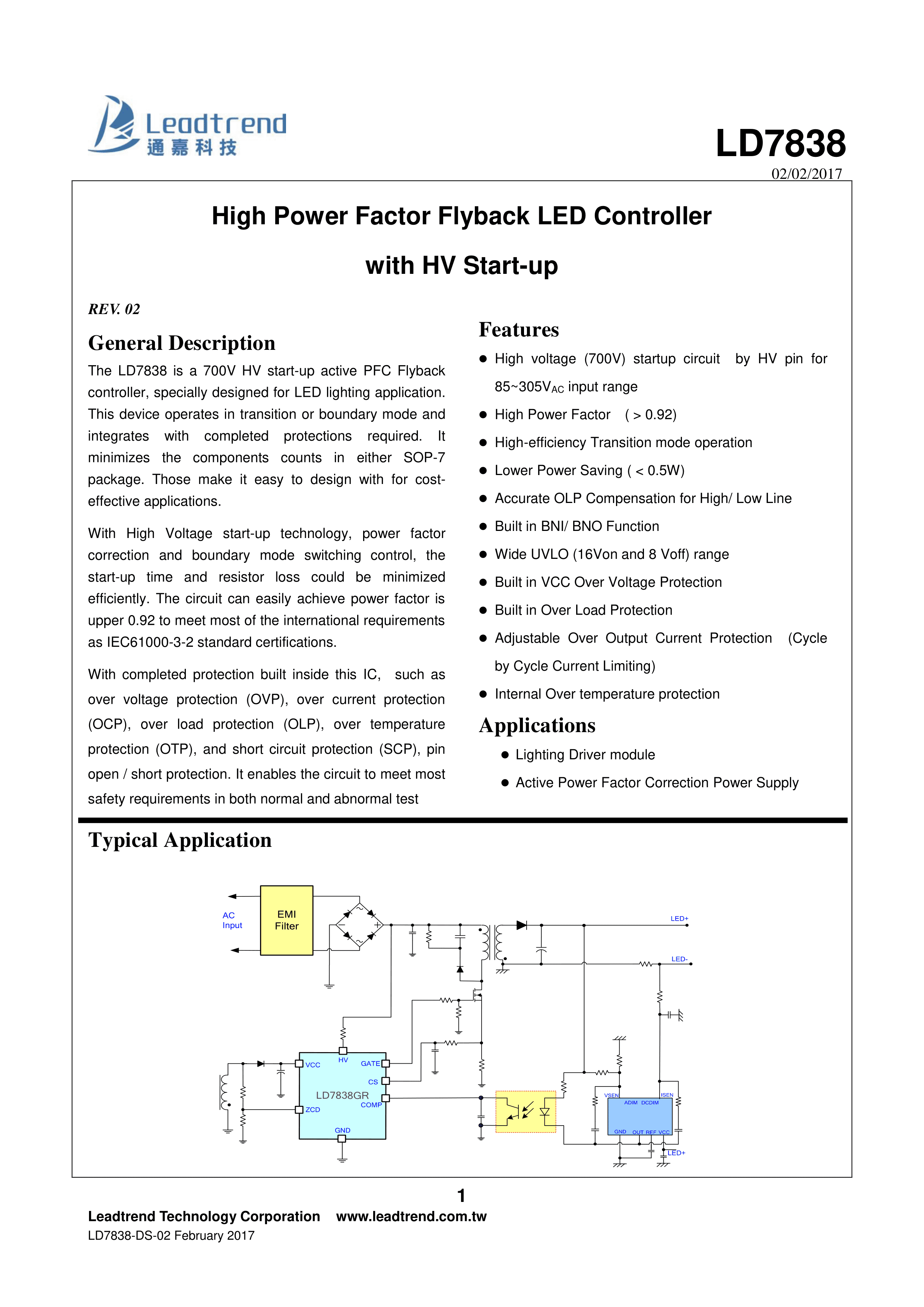LD7838GR数据手册SOP-7封装Leadtrend(通嘉科技)PDF规格书,中英文下载