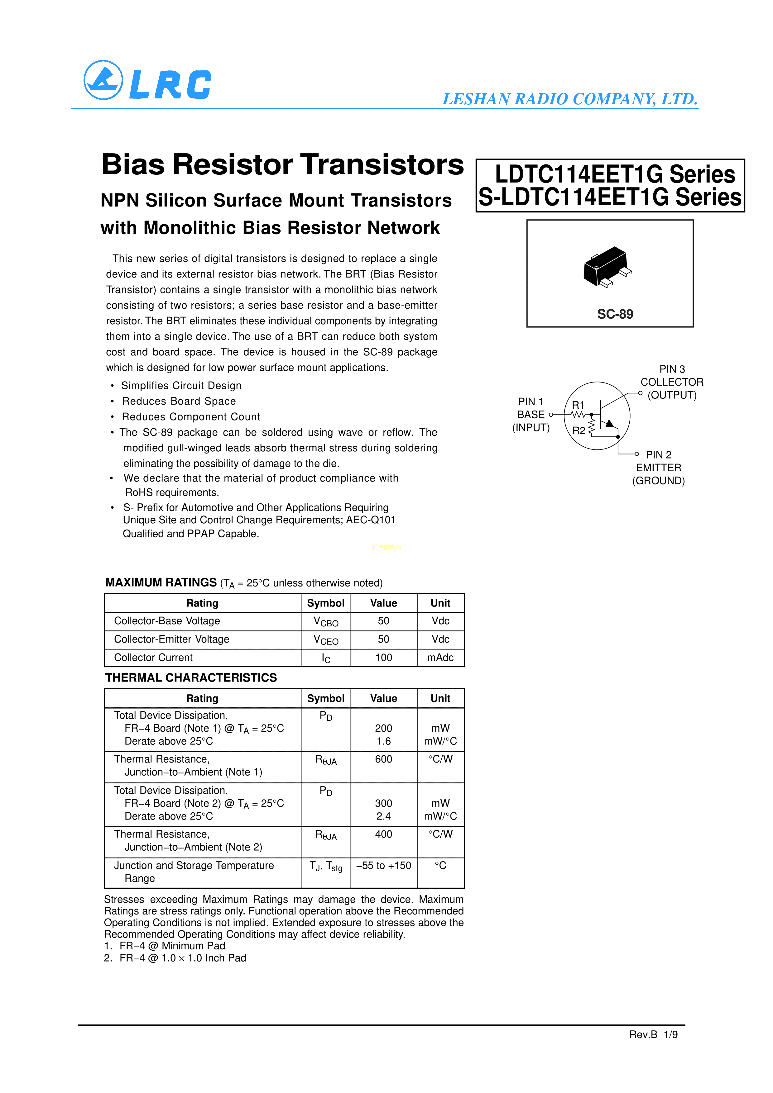 LDTC114YET1G数据手册SC-89封装LRC(乐山无线电)PDF规格书,中英文下载