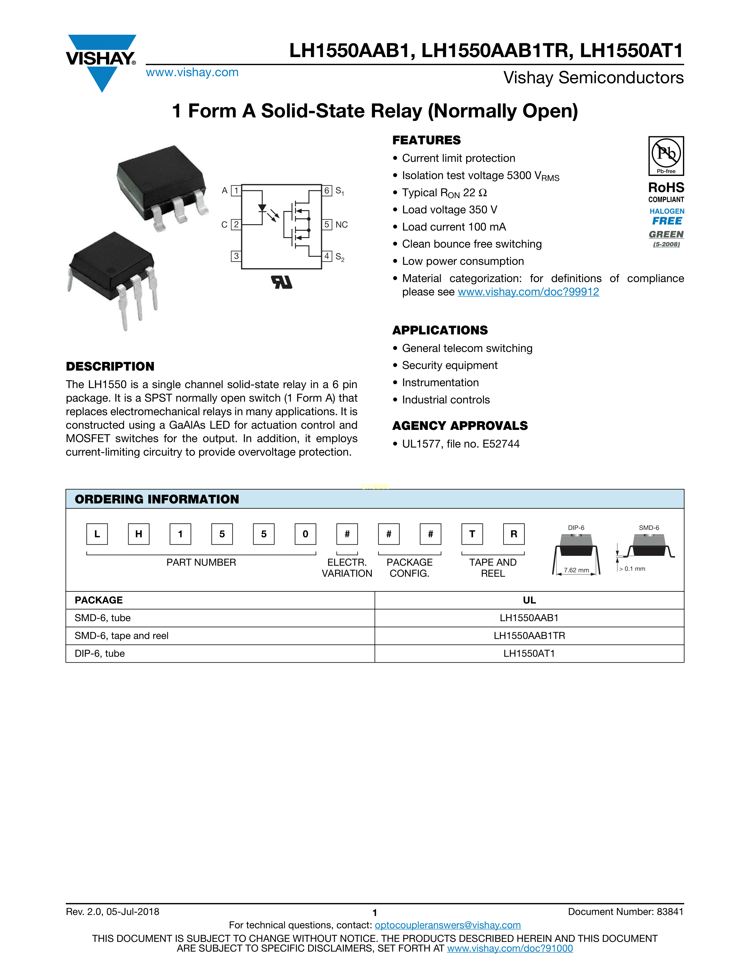 LH1550AT1数据手册DIP-6封装VISHAY(威世)PDF规格书,中英文下载