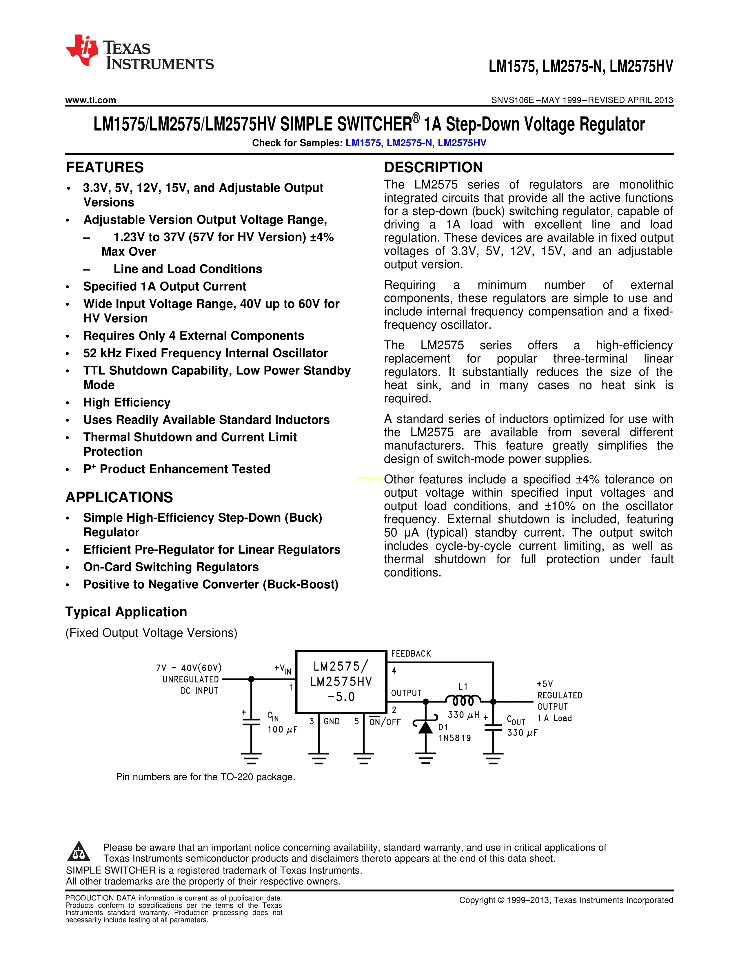 LM2575HVSX-5.0-NOPB数据手册TO-263-5封装TI(德州仪器)PDF规格书,中英