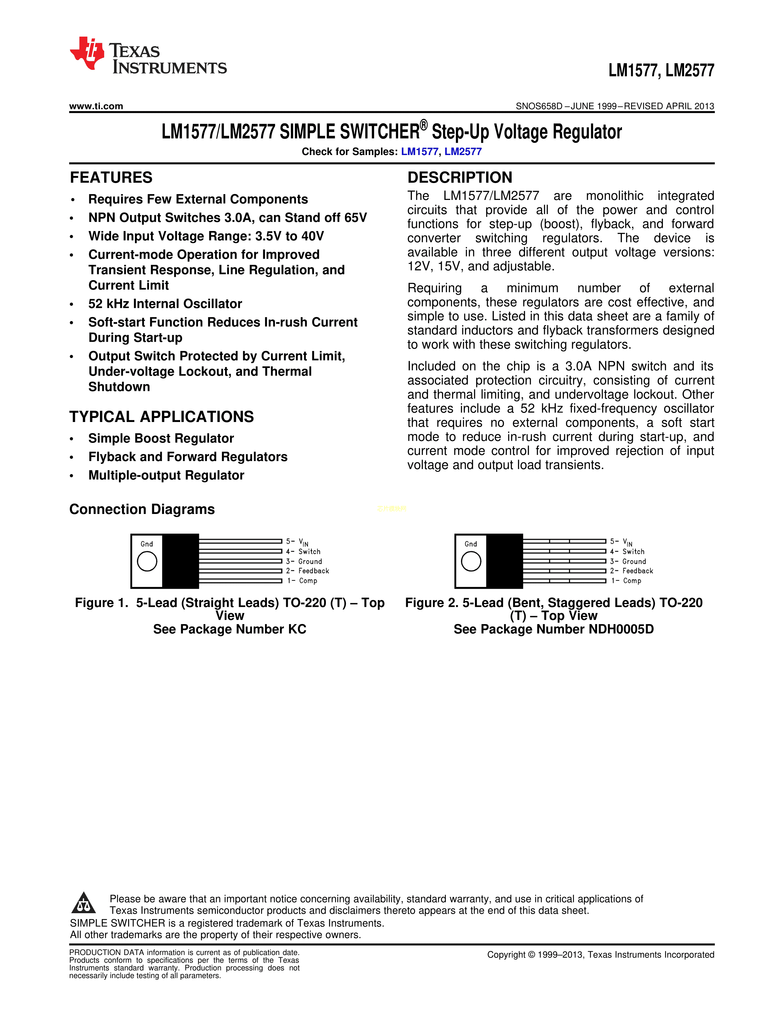 LM2577SX-ADJ-NOPB数据手册TO-263-5封装TI(德州仪器)PDF规格书,中英文下载