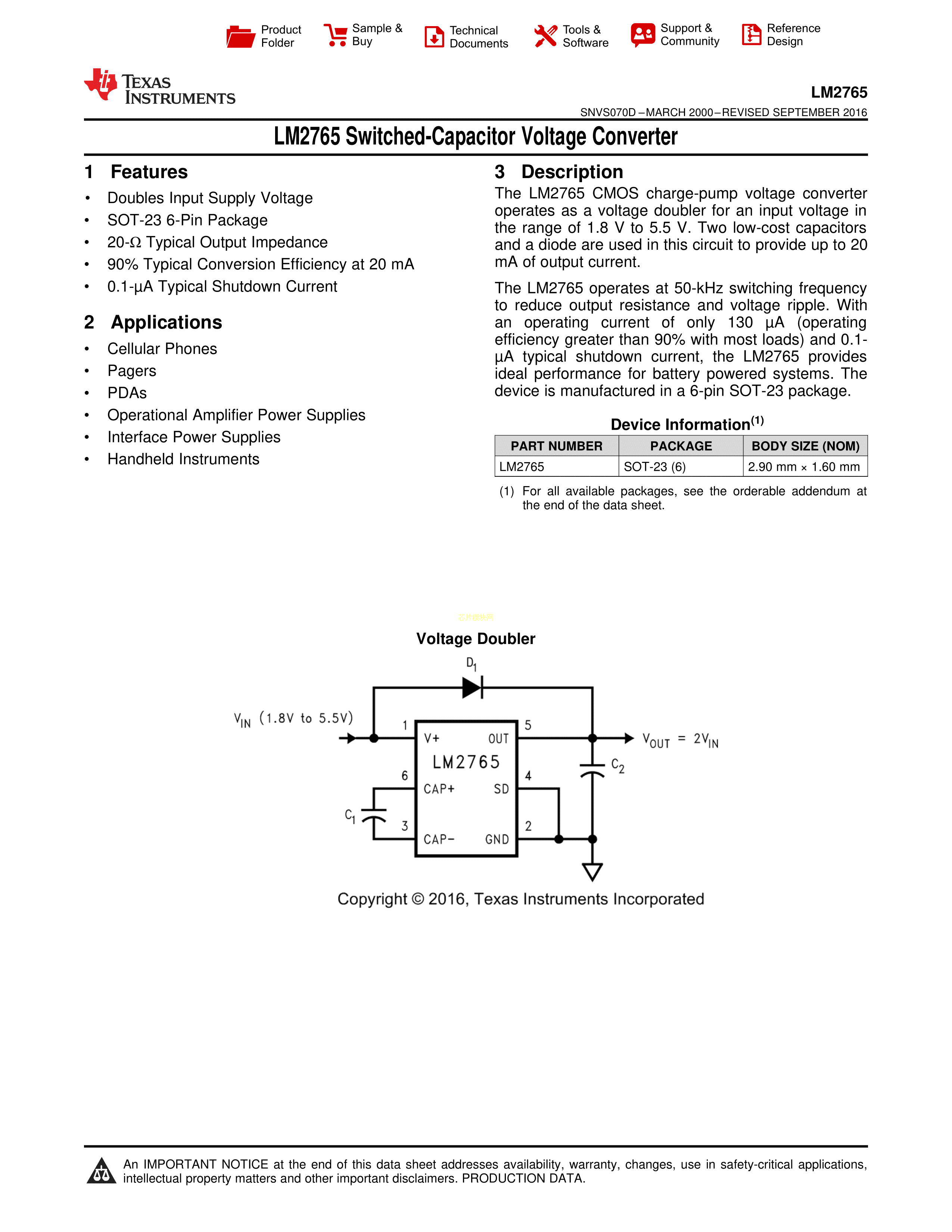 LM2765M6X-NOPB数据手册SOT-23-6封装TI(德州仪器)PDF规格书,中英文下载