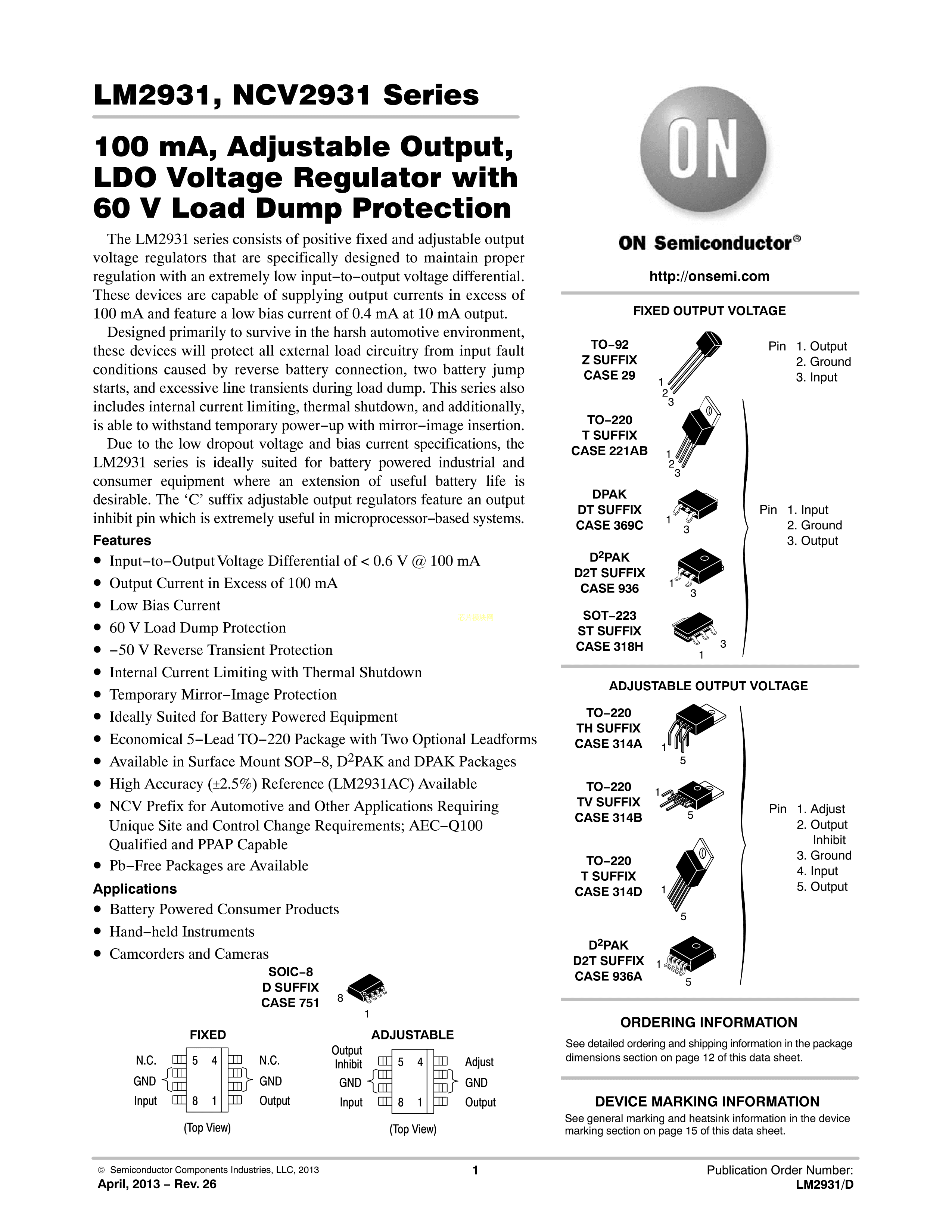 LM2931AZ-5.0RAG数据手册TO-92-3封装onsemi(安森美)PDF规格书,中英文下