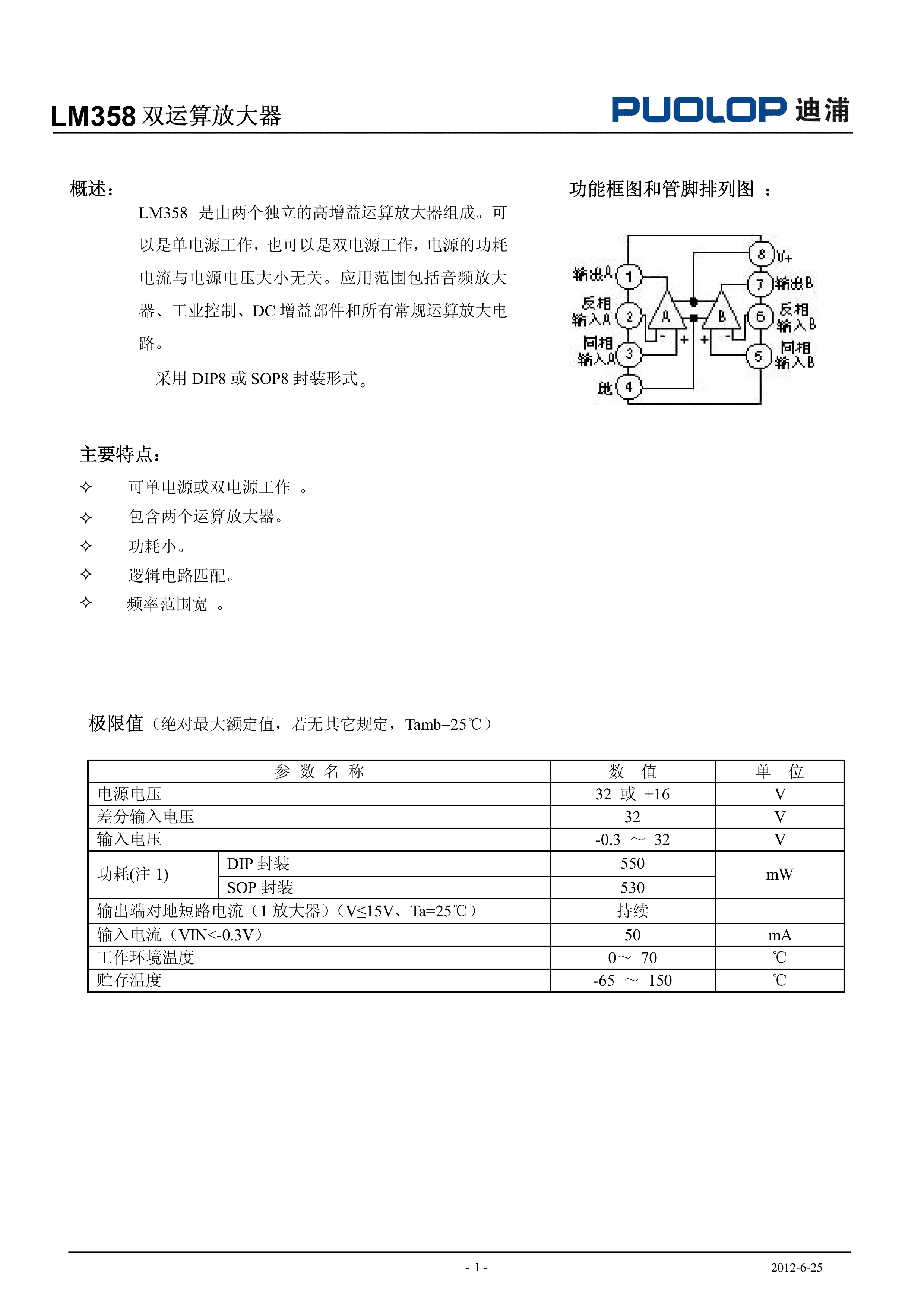LM358数据手册SOP-8封装PUOLOP(迪浦)PDF规格书,中英文下载