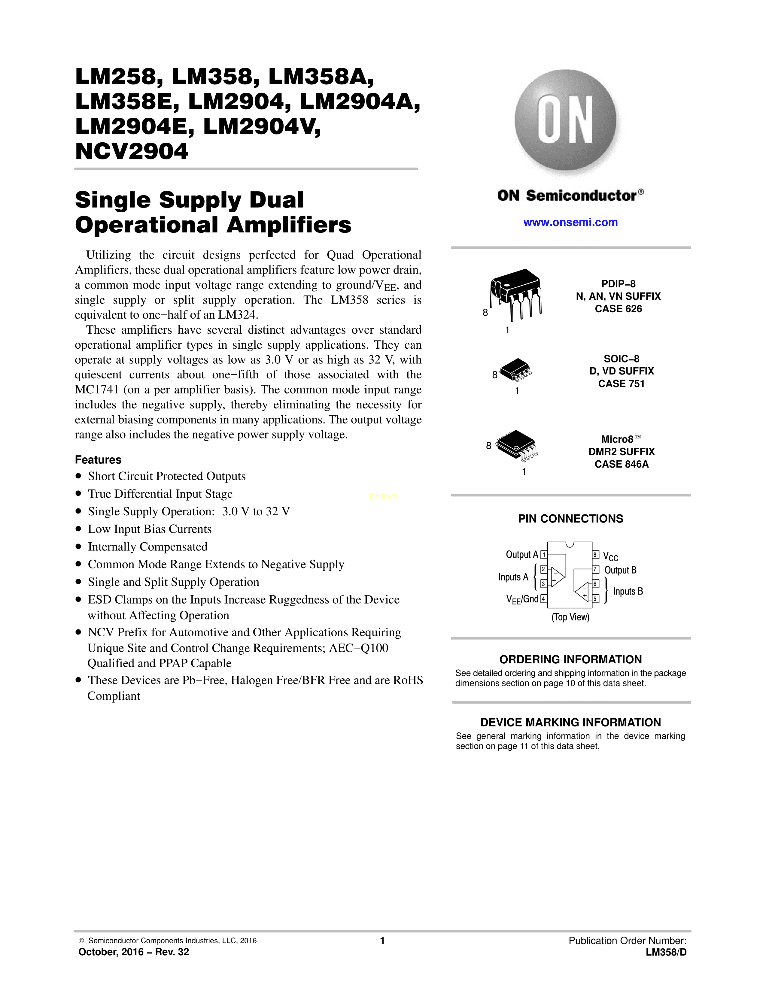 LM358EDR2G数据手册SOIC-8_150mil封装onsemi(安森美)PDF规格书,中英文