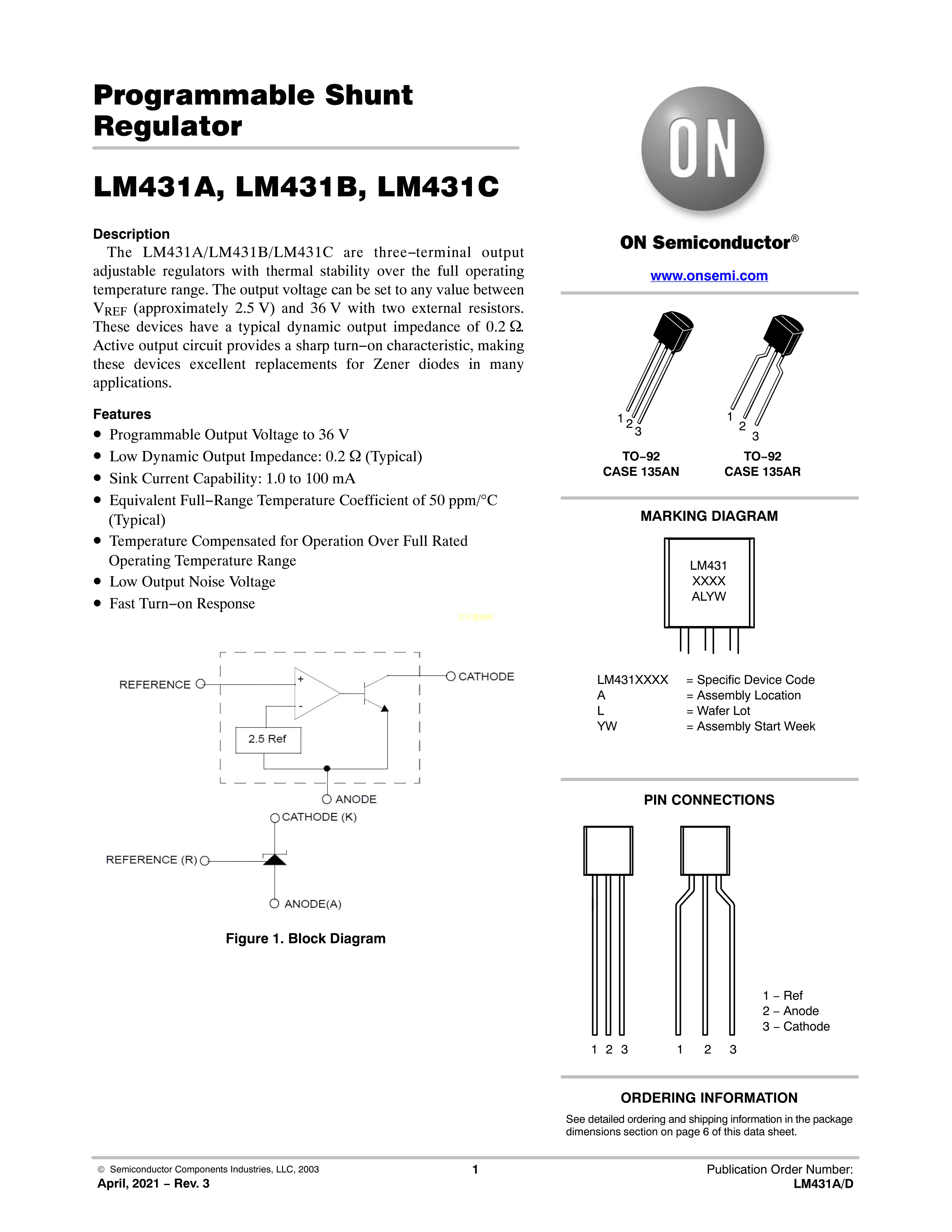 LM431AIZ数据手册TO-92封装onsemi(安森美)PDF规格书,中英文下载