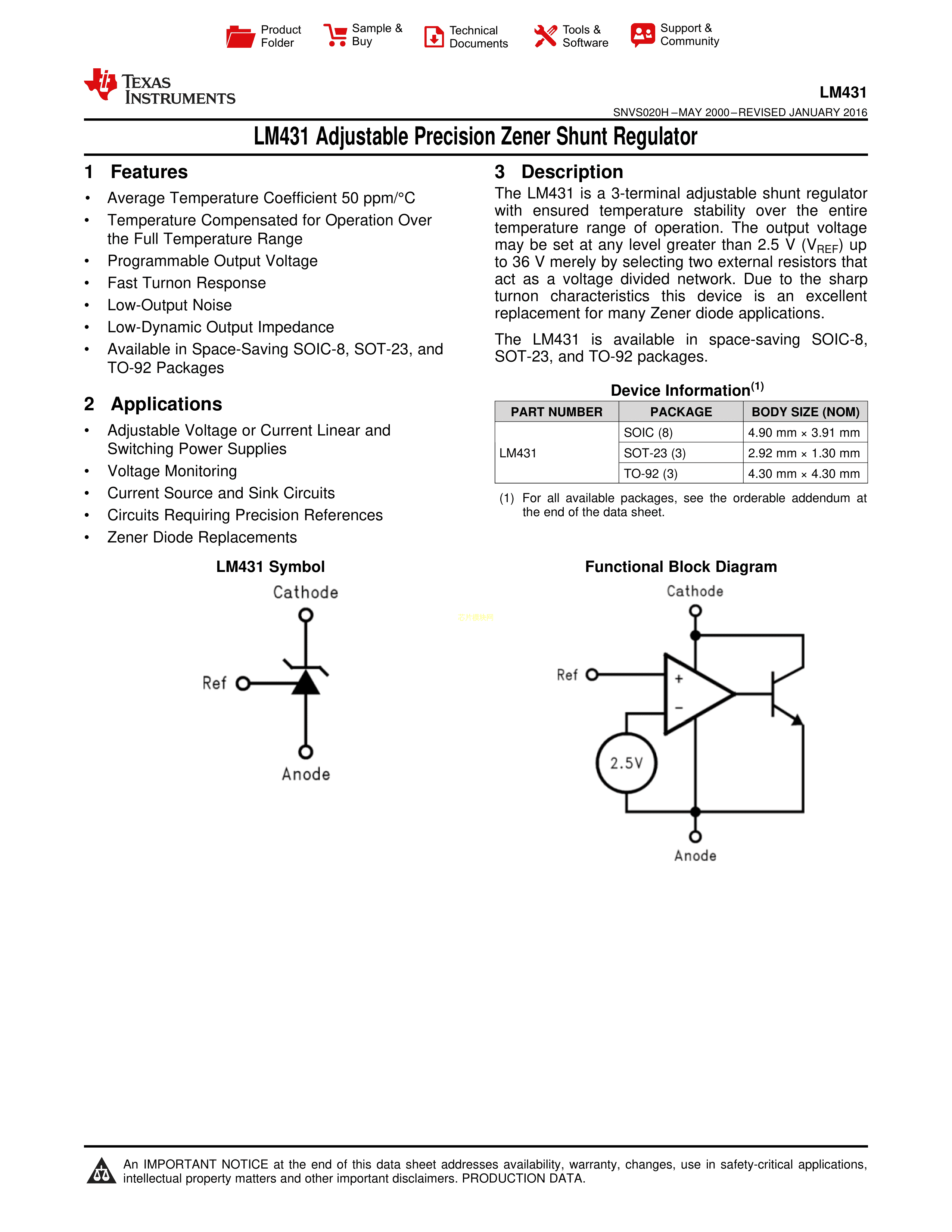 LM431CIZ-NOPB数据手册TO-92(TO-92-3)封装TI(德州仪器)PDF规格书,中英文下载