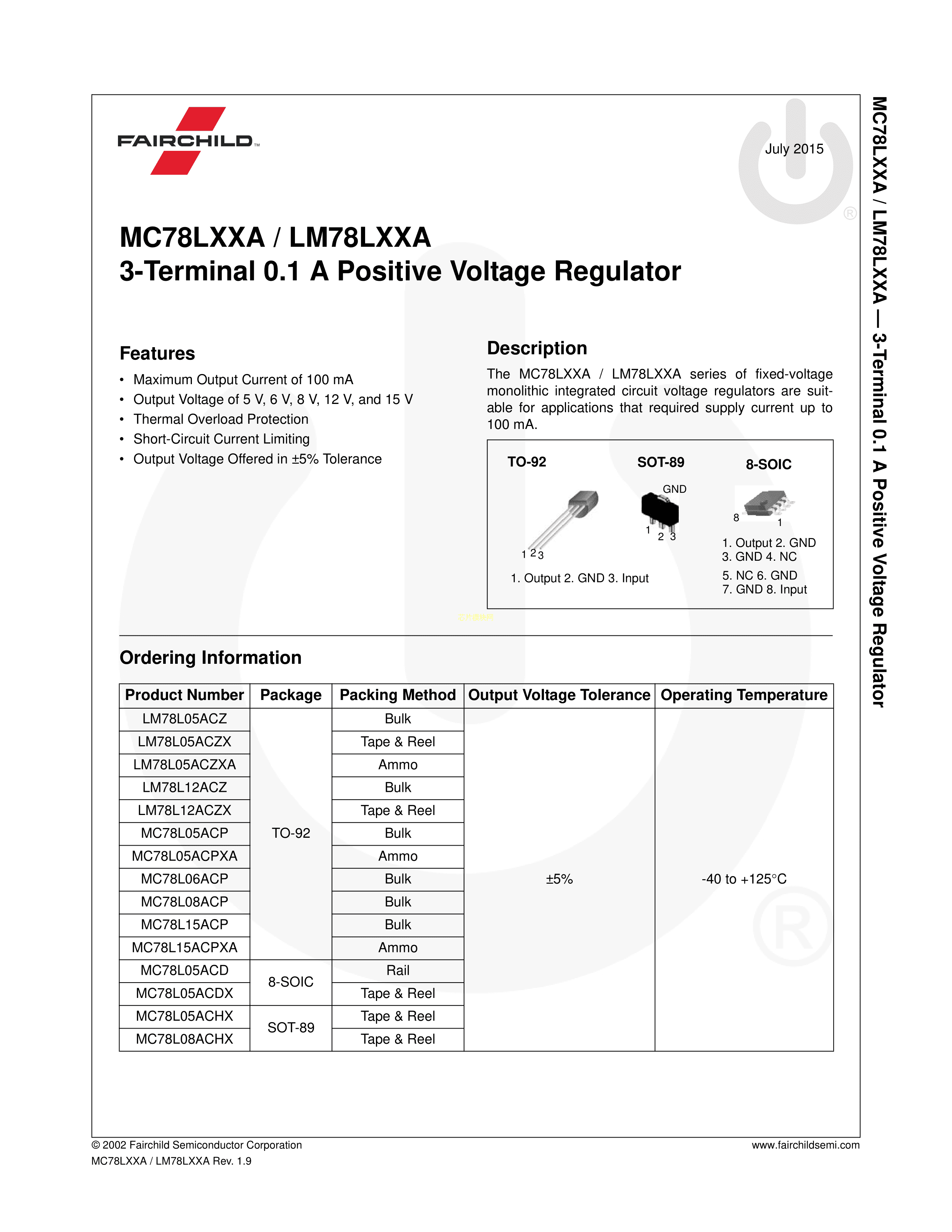 LM78L05ACZXA数据手册TO-92(TO-92-3)封装onsemi(安森美)PDF规格书,中英文下载