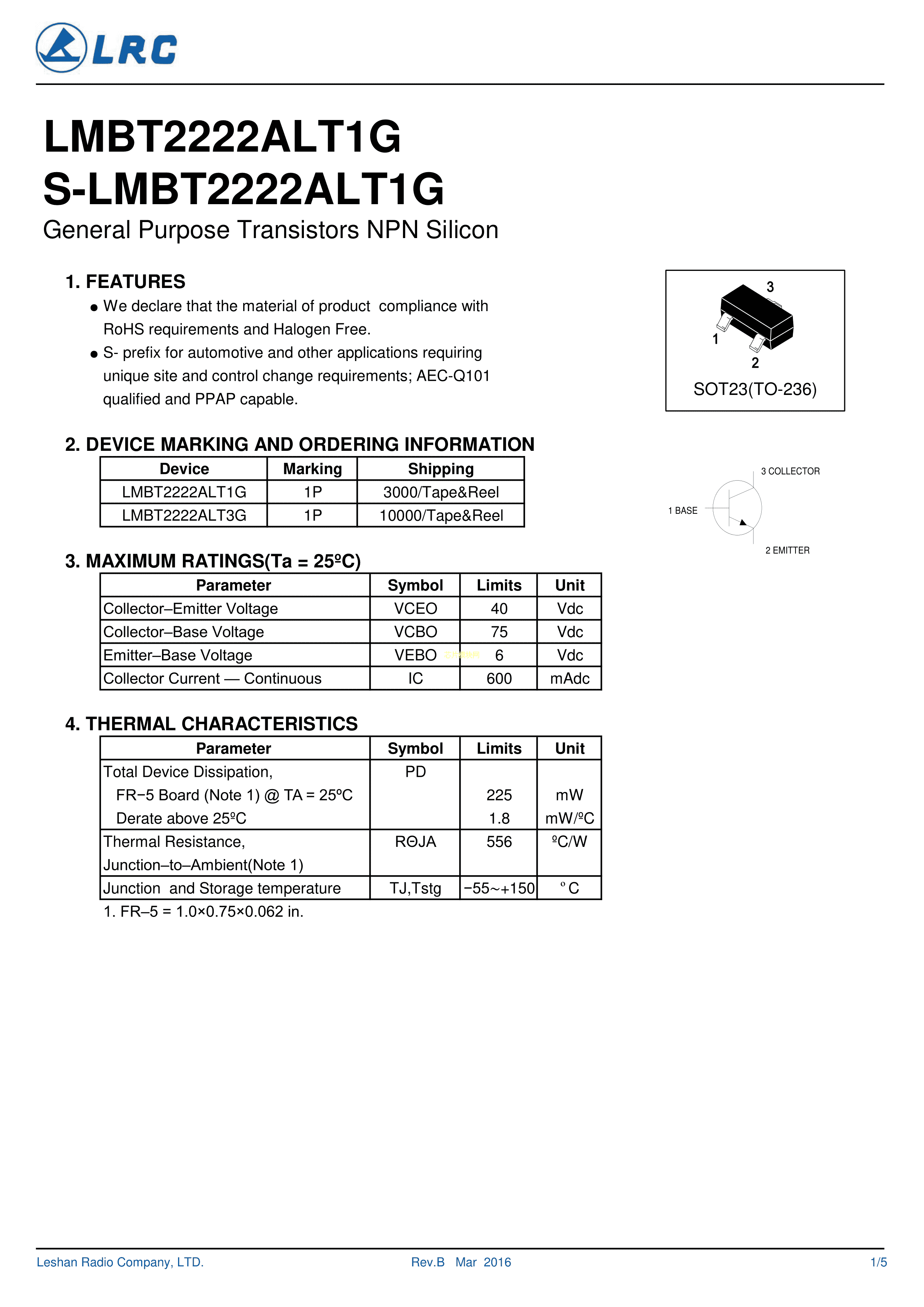 LMBT2222ALT1G数据手册SOT-23(SOT-23-3)封装LRC(乐山无线电)PDF规格