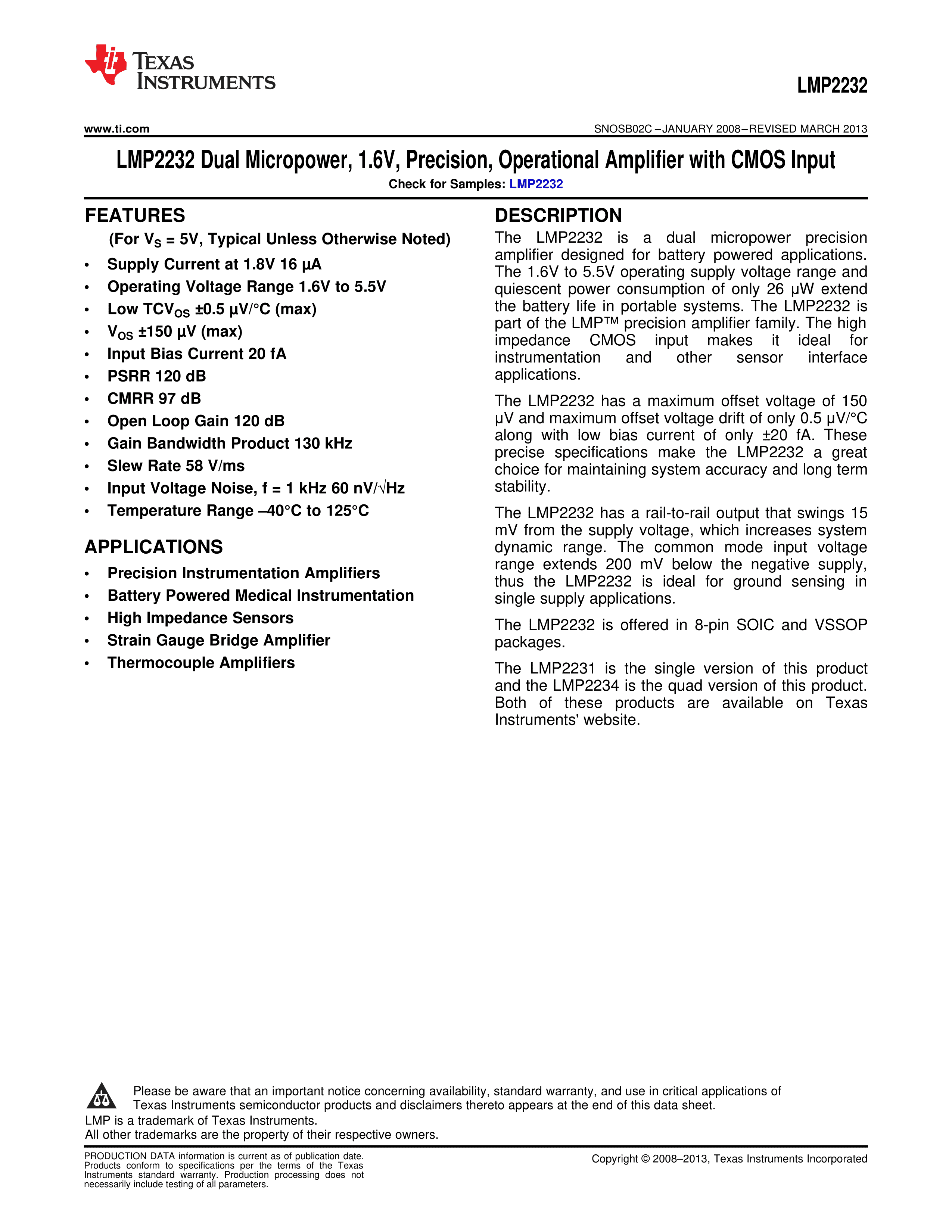 LMP2232AMM-NOPB数据手册VSSOP-8(3x3x0.65)封装TI(德州仪器)PDF规