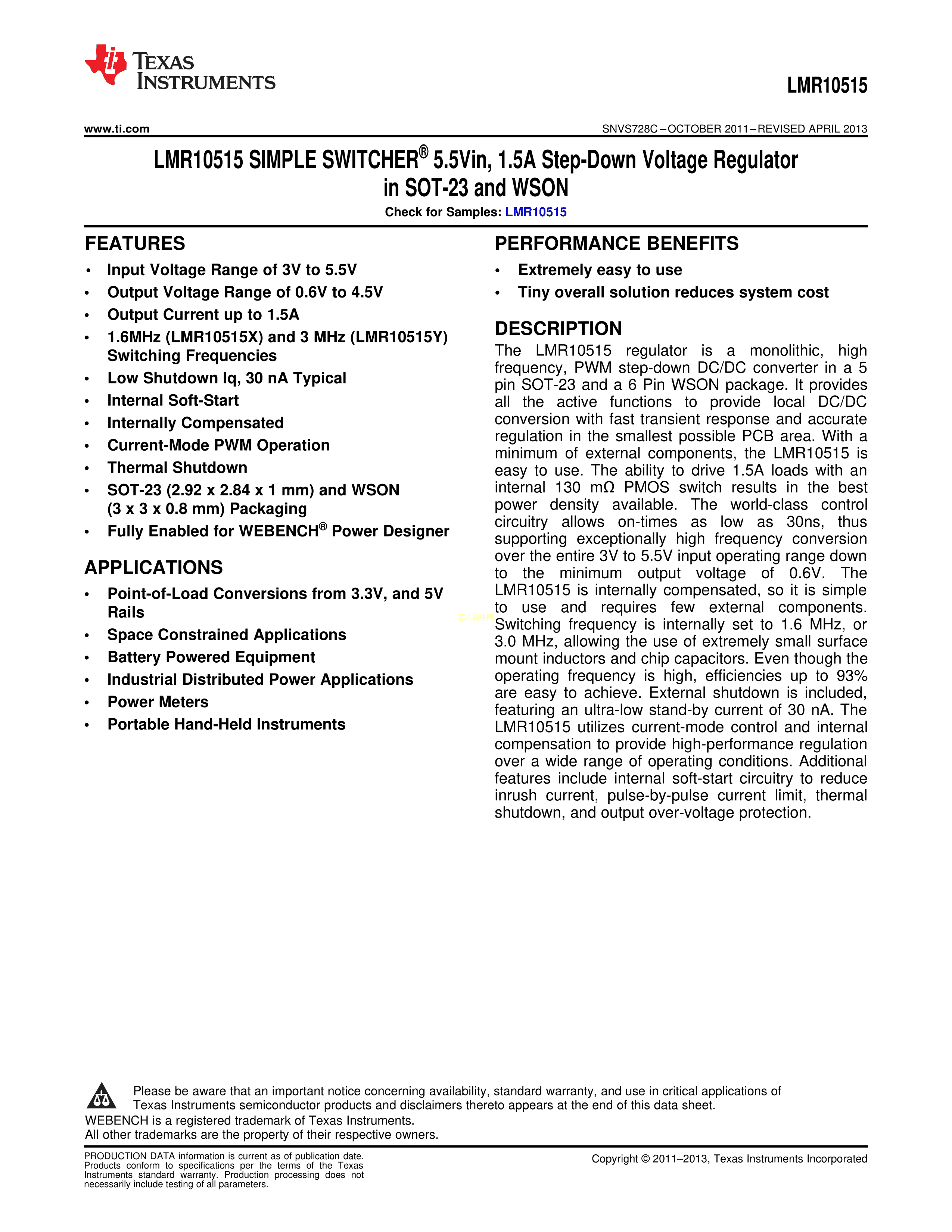 LMR10515XMF-NOPB数据手册SOT-23-5封装TI(德州仪器)PDF规格书,中英文下载