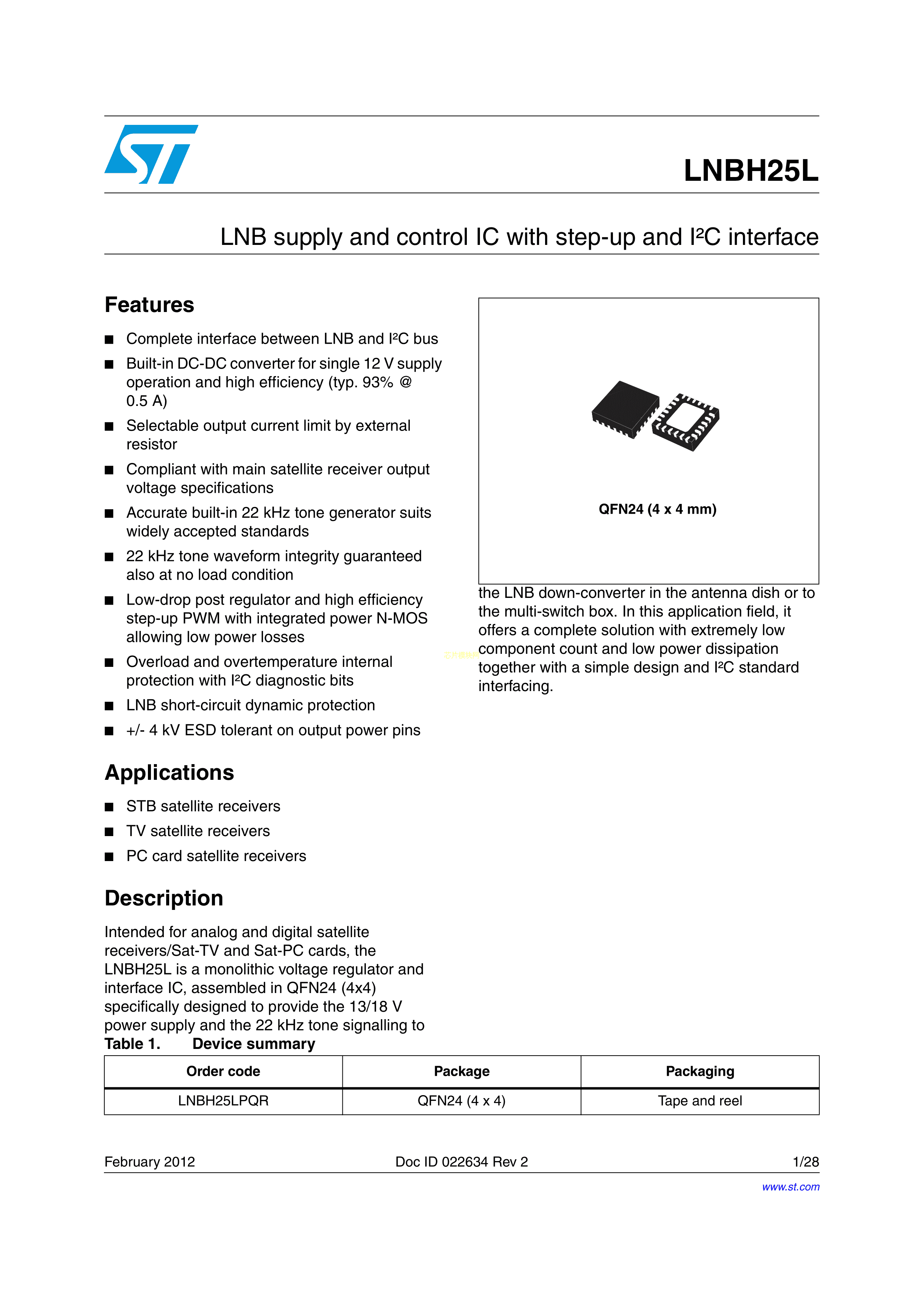 LNBH25LPQR数据手册QFN-24(4x4)封装ST(意法半导体)PDF规格书,中英文下载