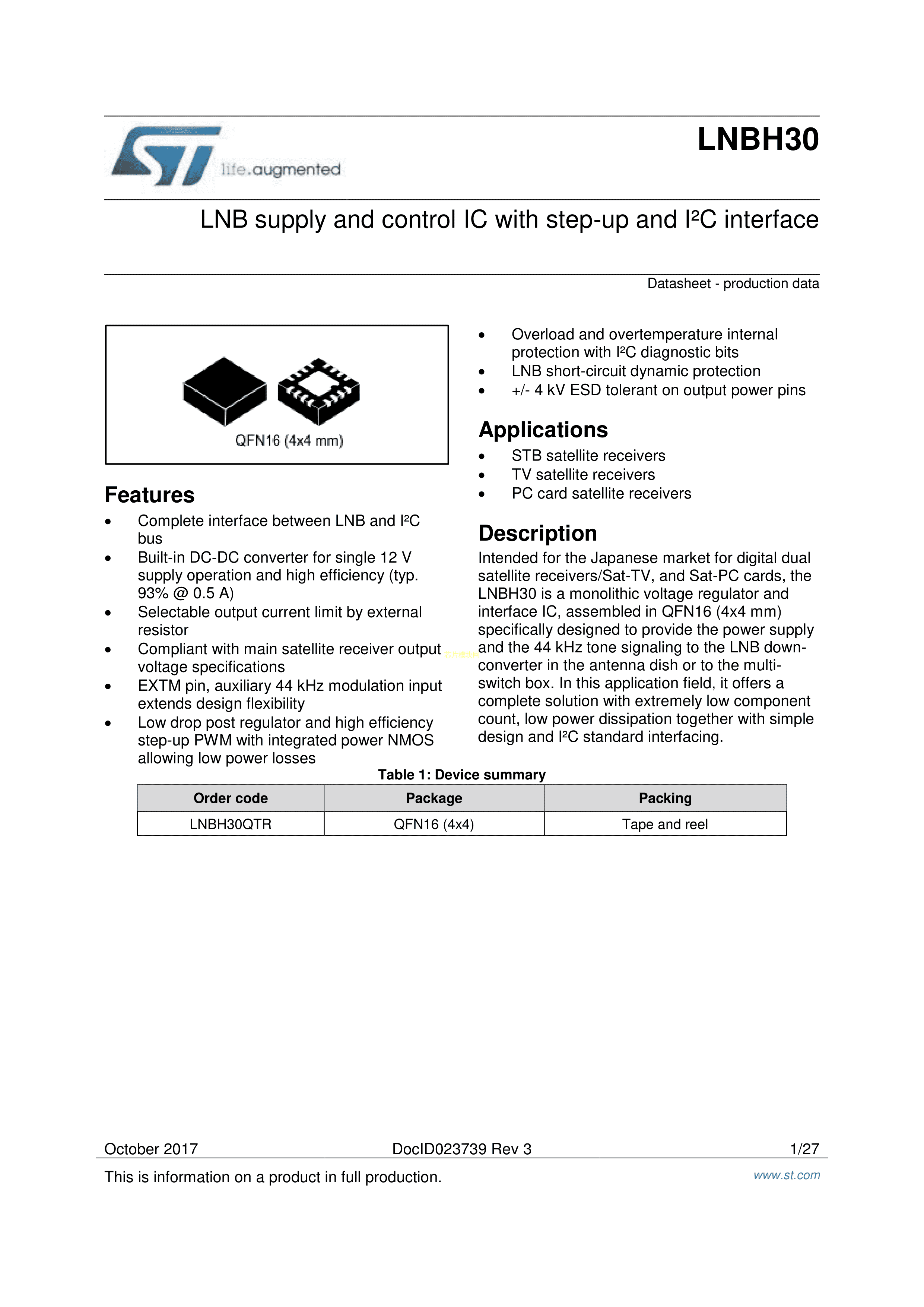 LNBH30QTR数据手册QFN-16(4x4)封装ST(意法半导体)PDF规格书,中英文下载