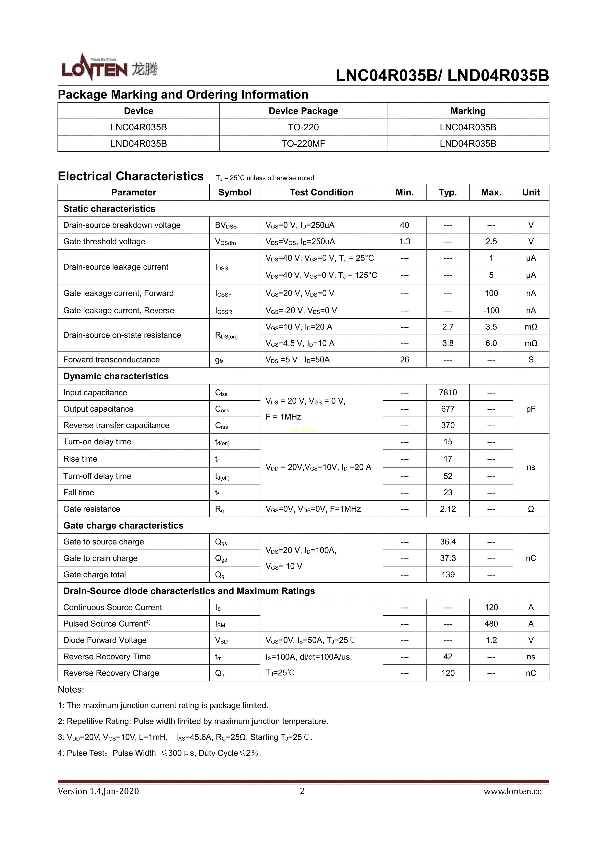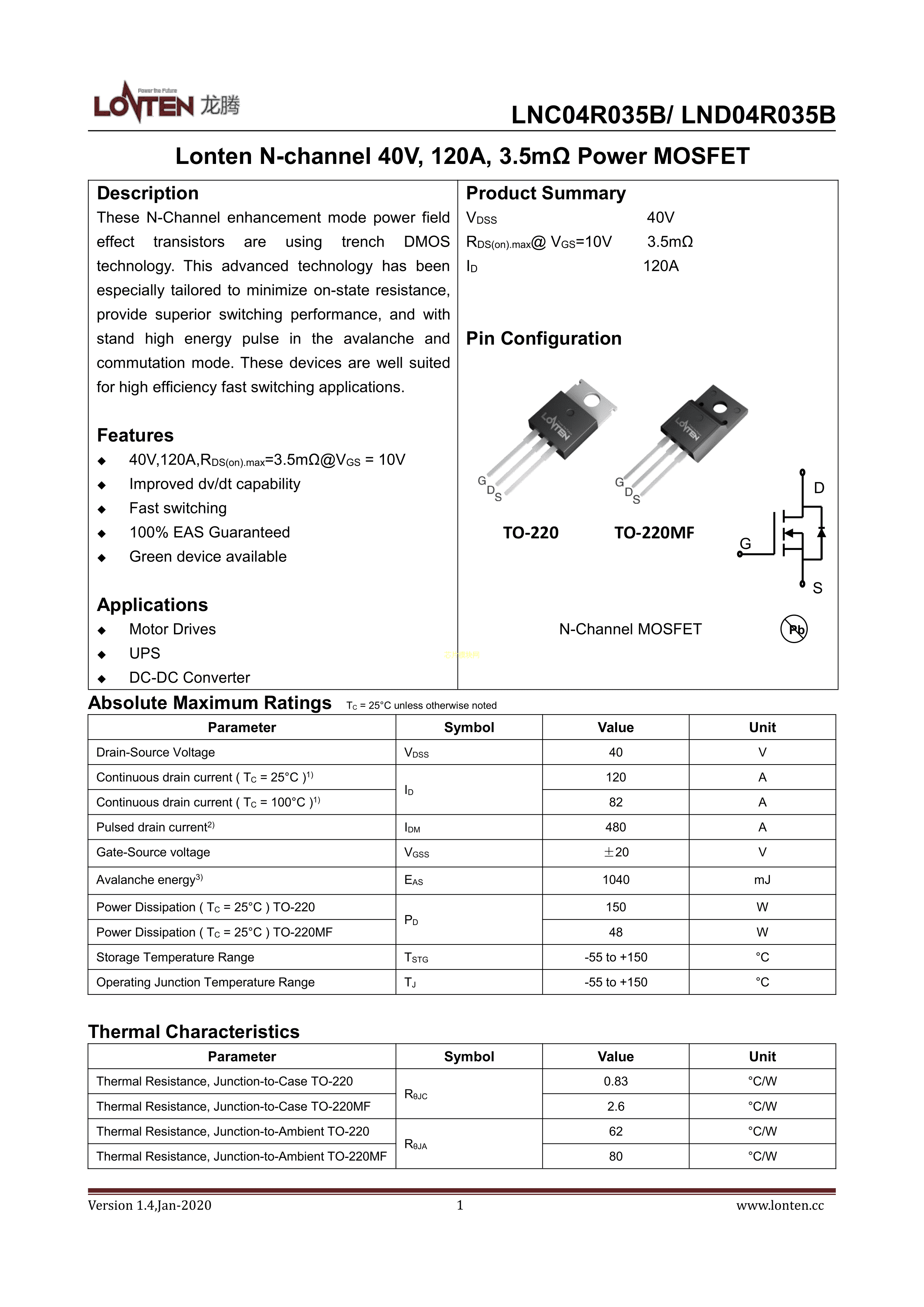 LNC04R035B数据手册TO-220封装LONTEN(龙腾半导体)PDF规格书,中英文下载