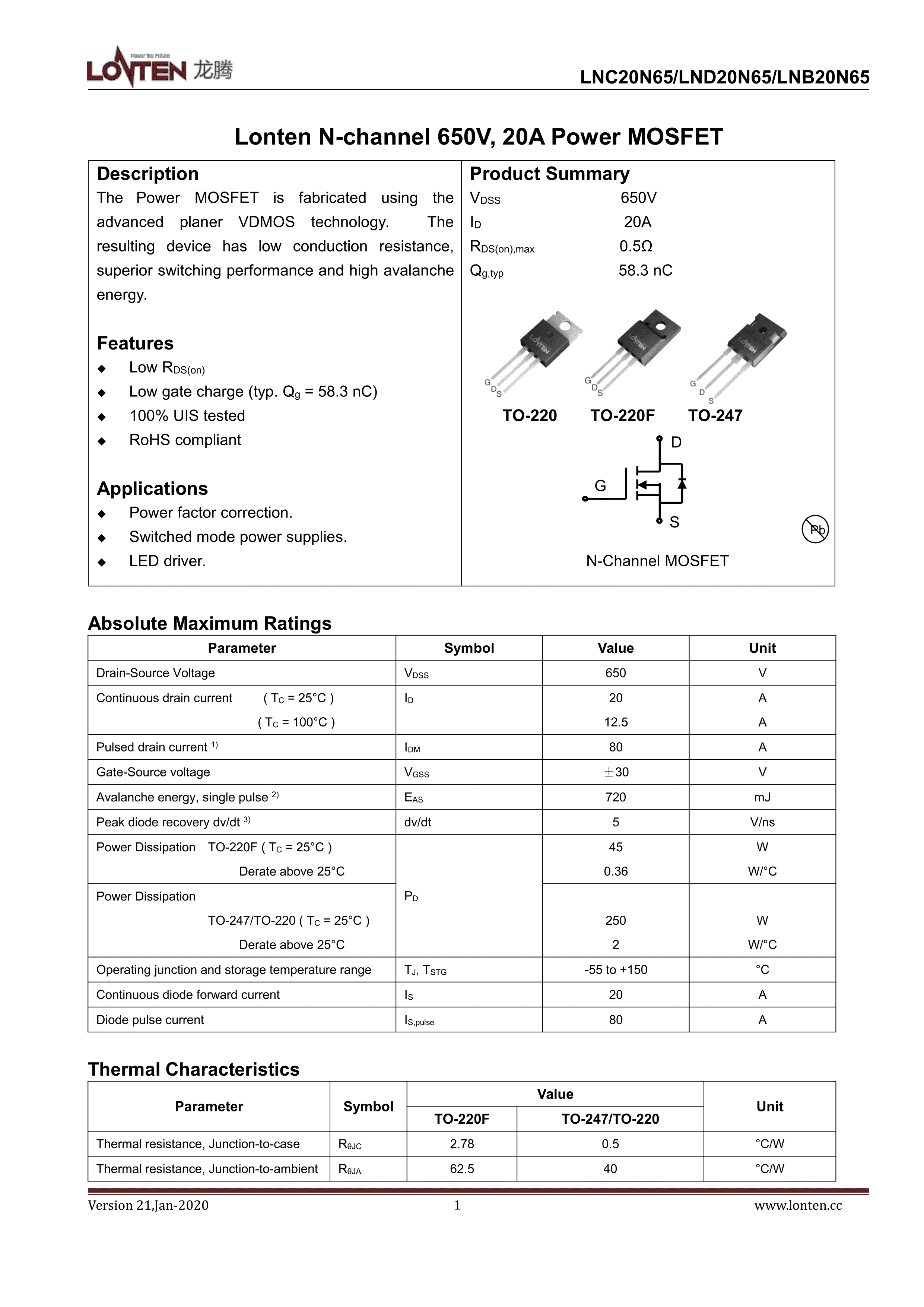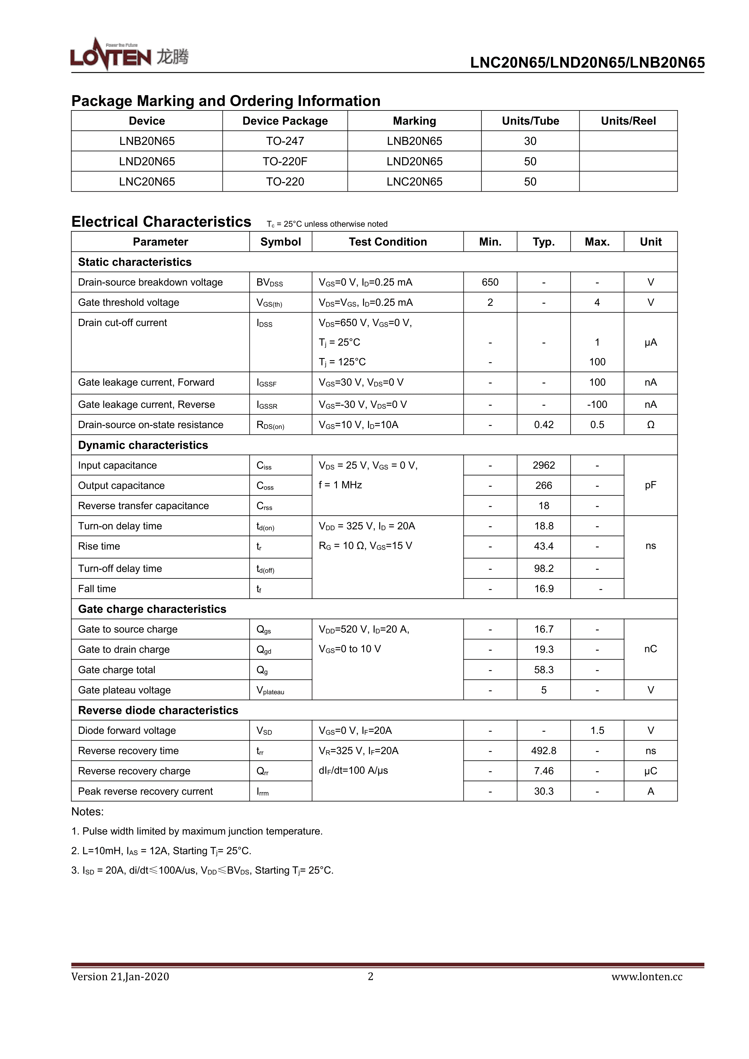 LNC20N65数据手册TO-220封装LONTEN(龙腾半导体)PDF规格书,中英文下载