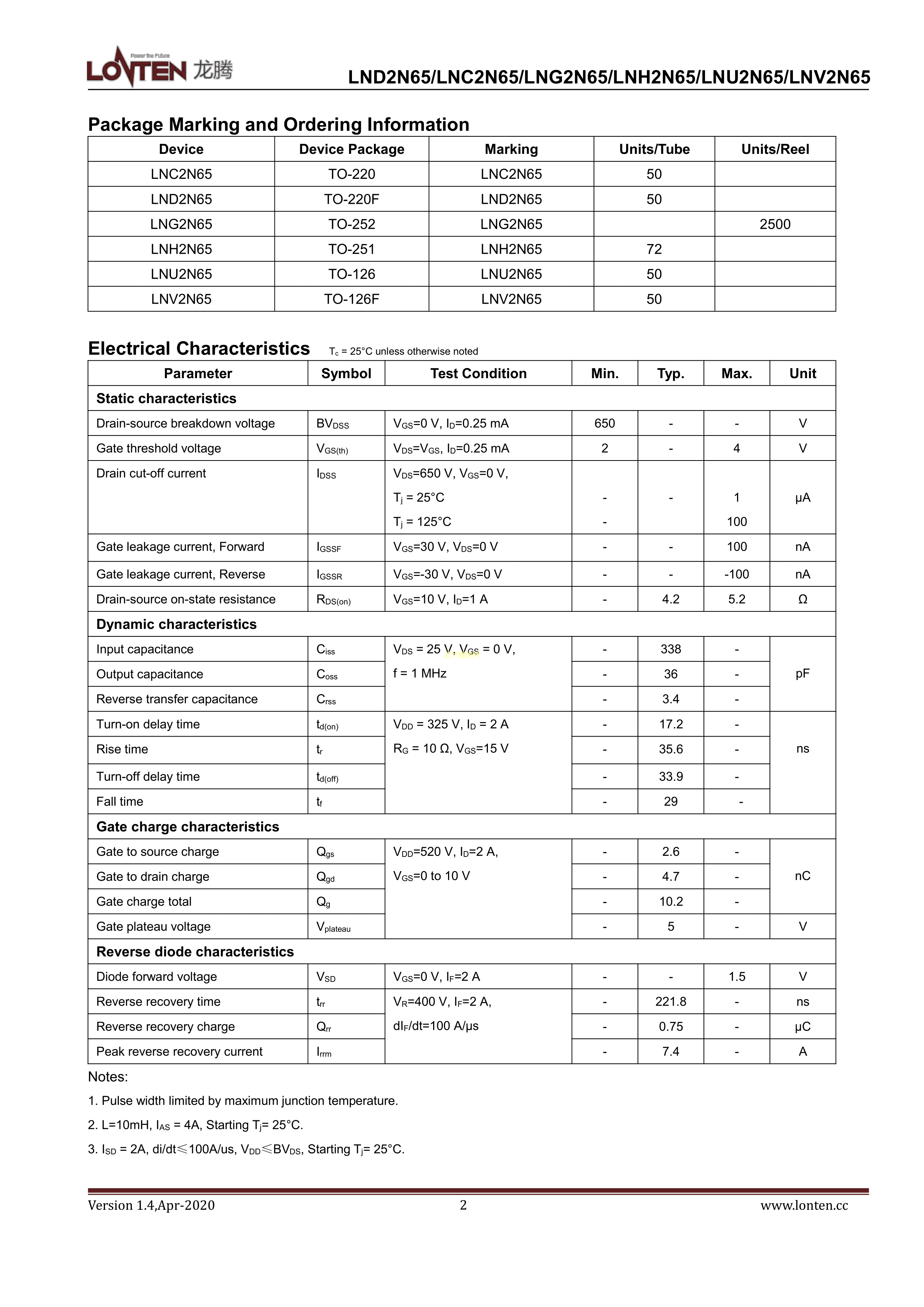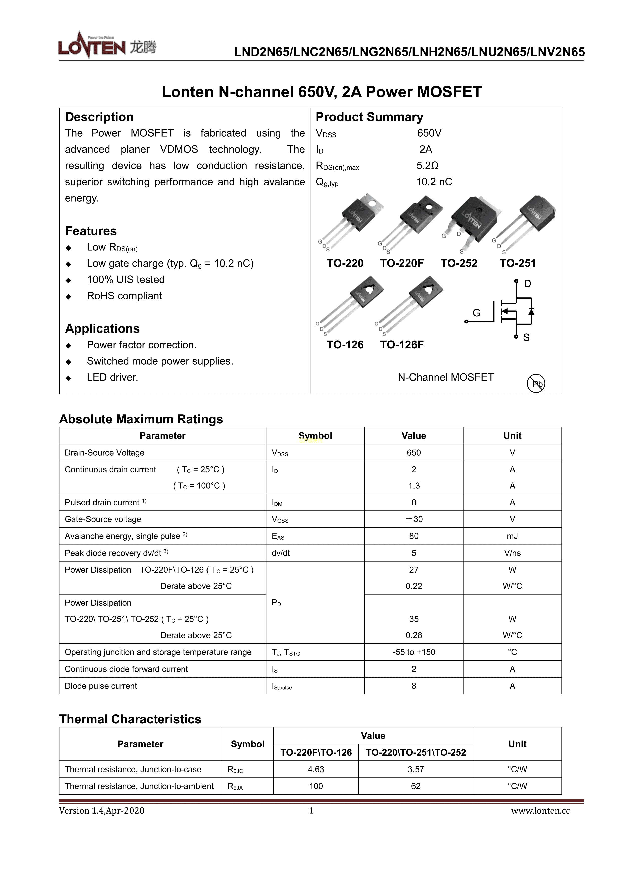 LNC2N65数据手册TO-220封装LONTEN(龙腾半导体)PDF规格书,中英文下载