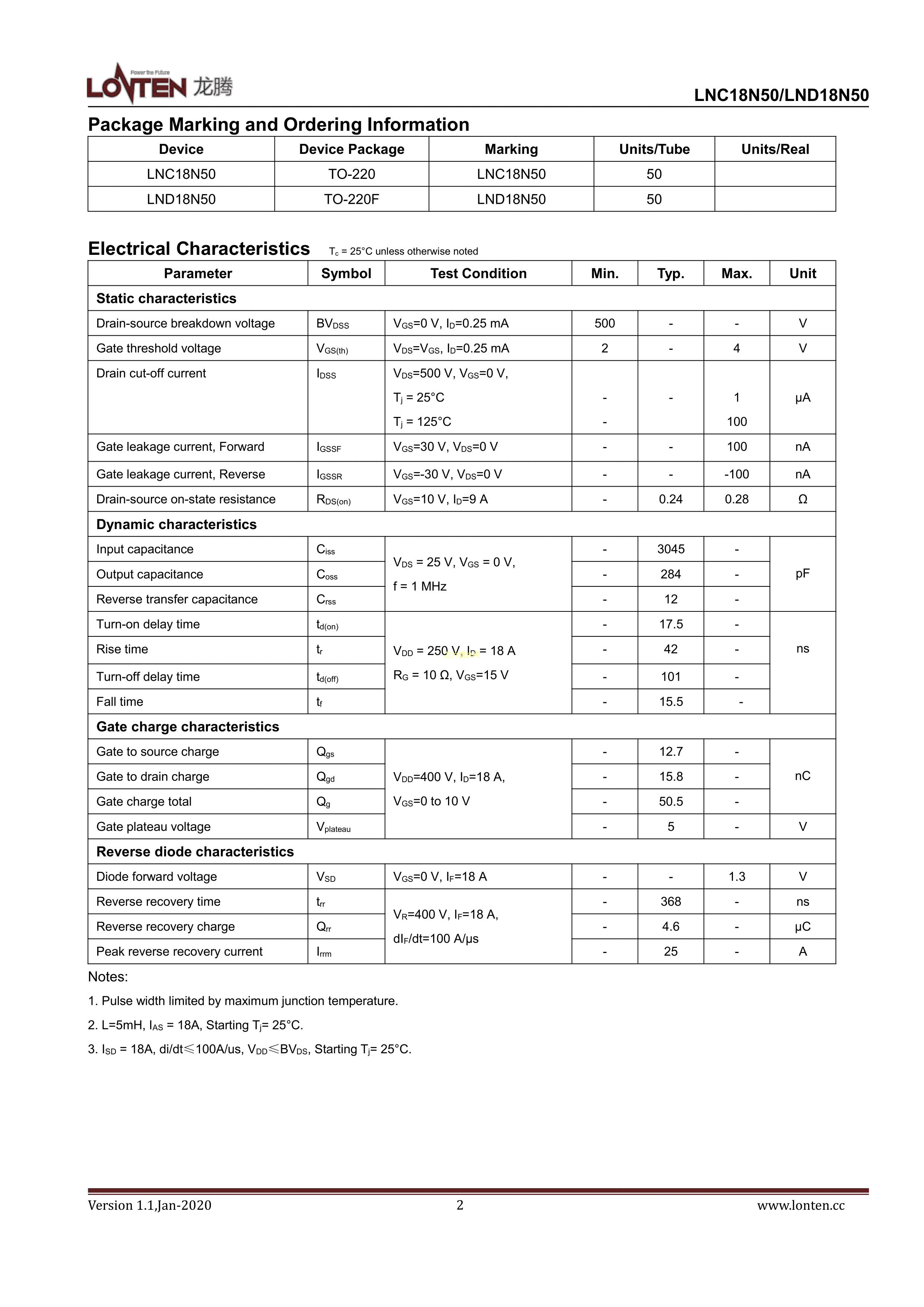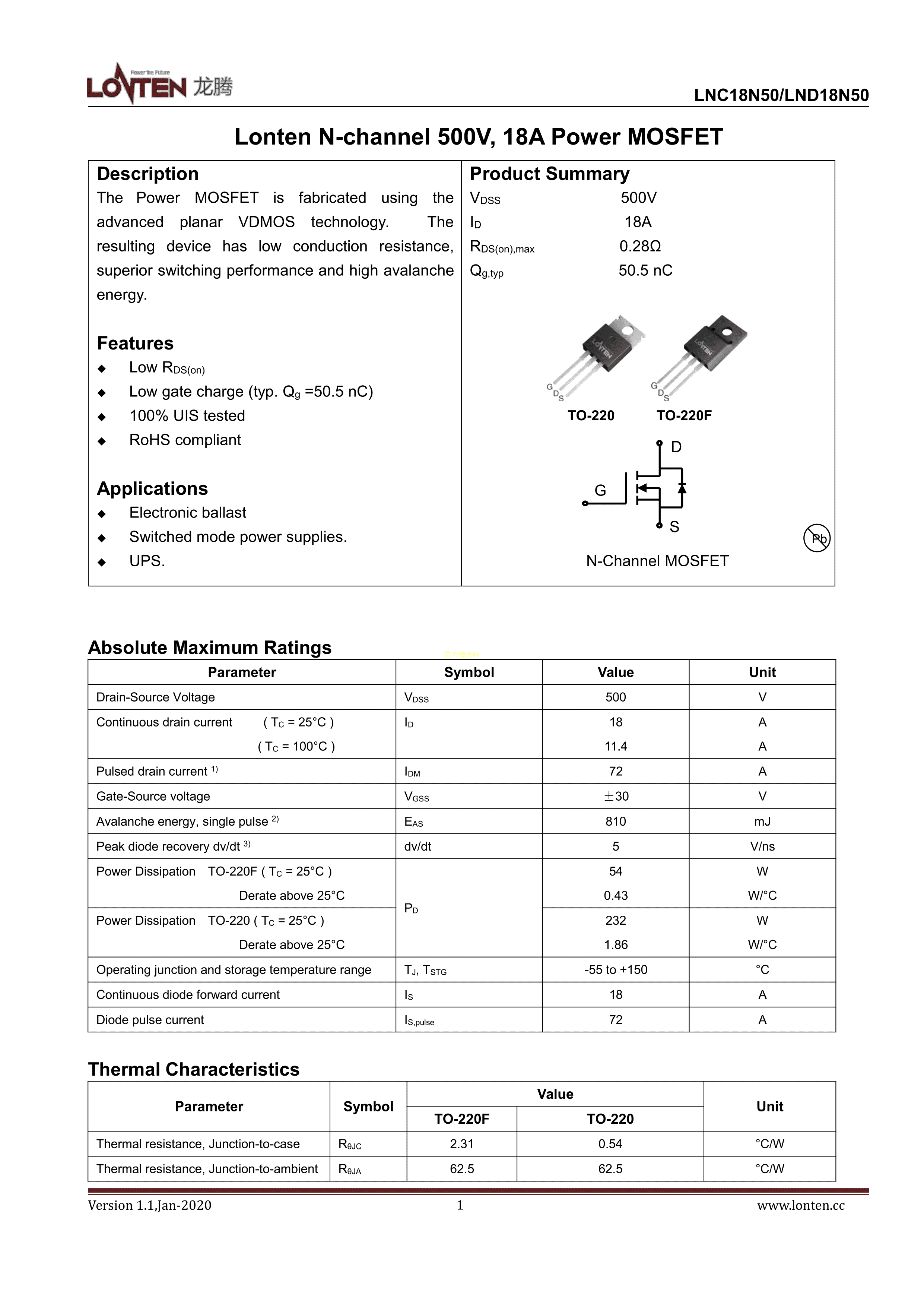 LND18N50数据手册TO-220F封装LONTEN(龙腾半导体)PDF规格书,中英文下载