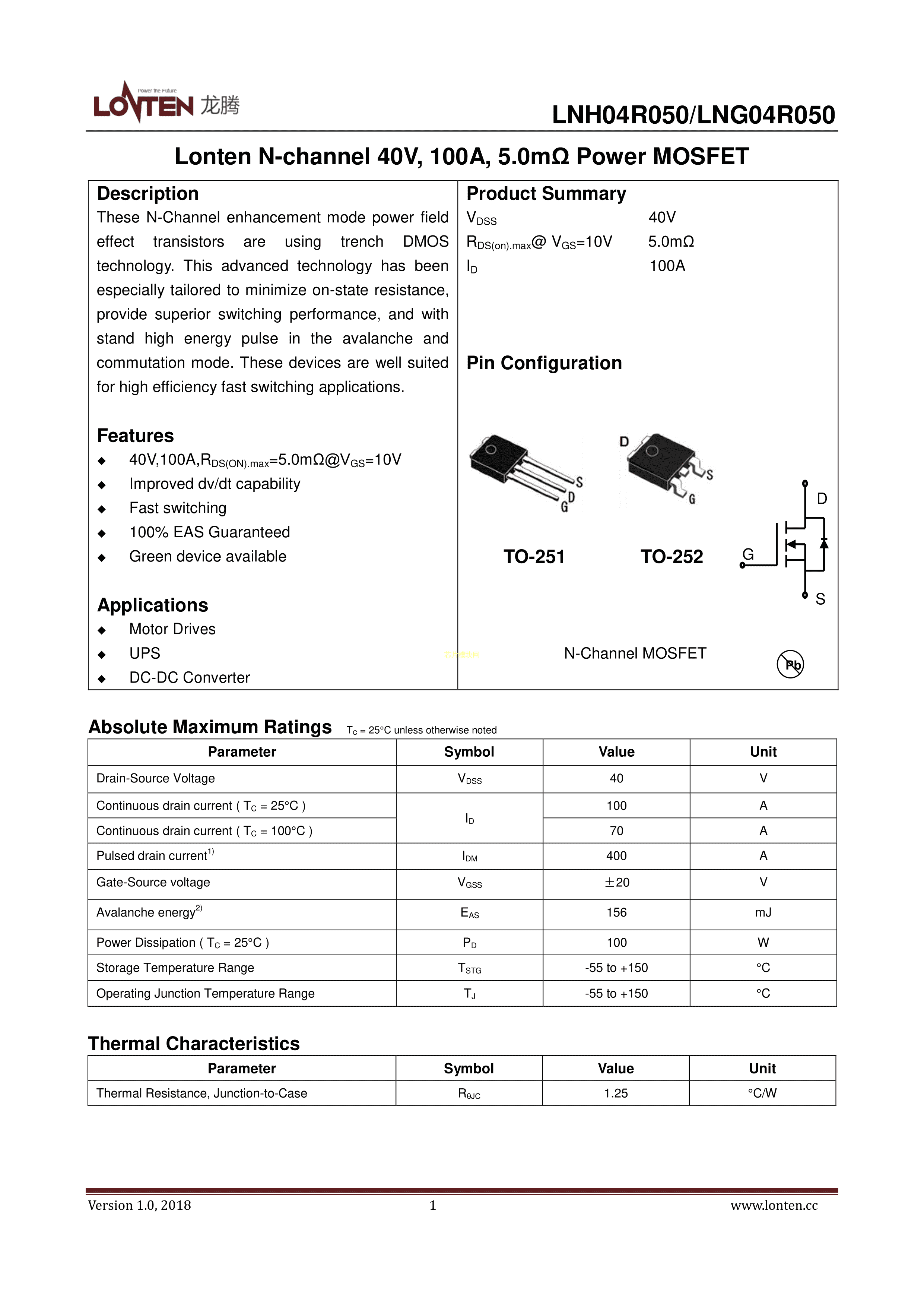 LNG04R050数据手册TO-252封装LONTEN(龙腾半导体)PDF规格书,中英文下载