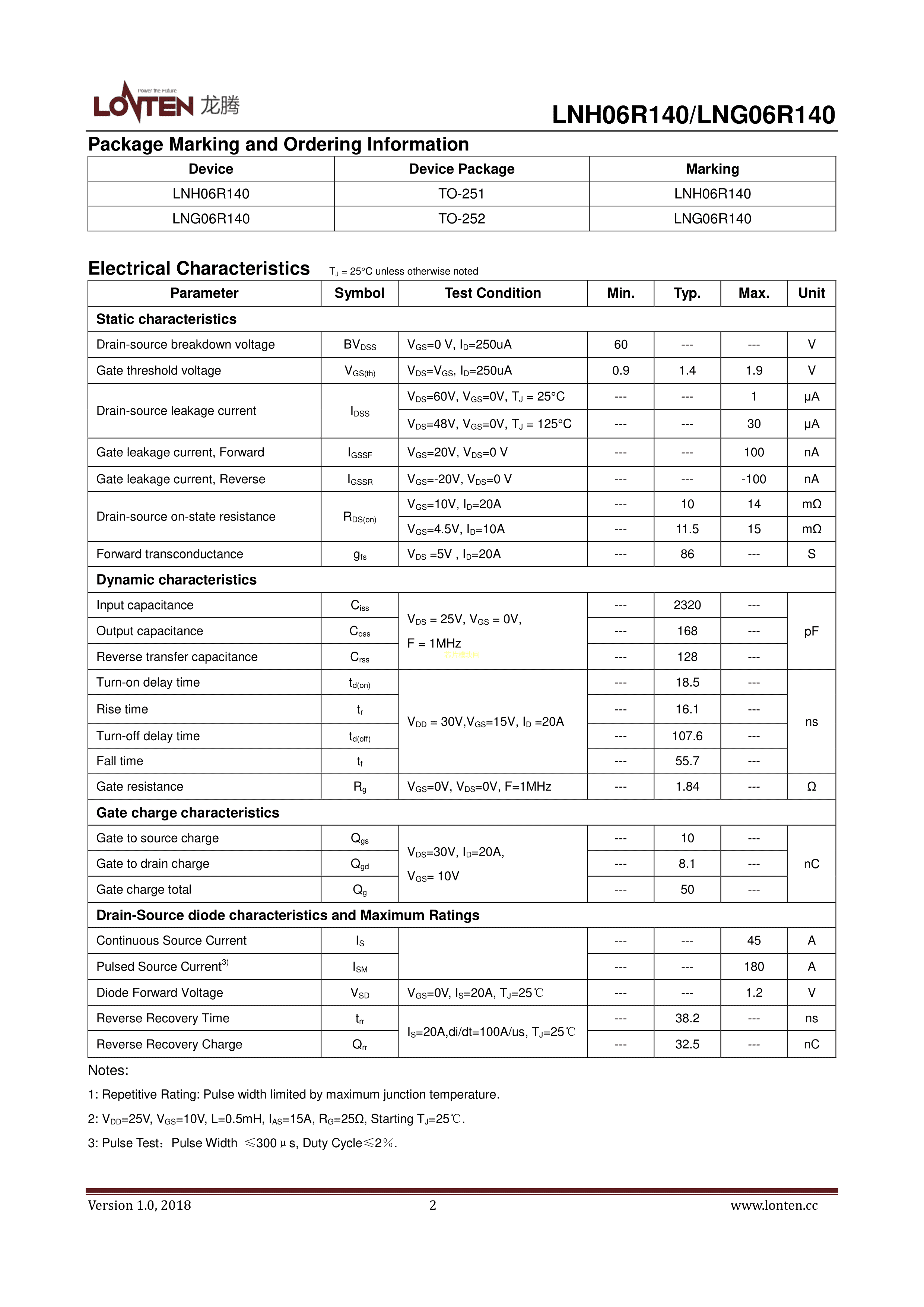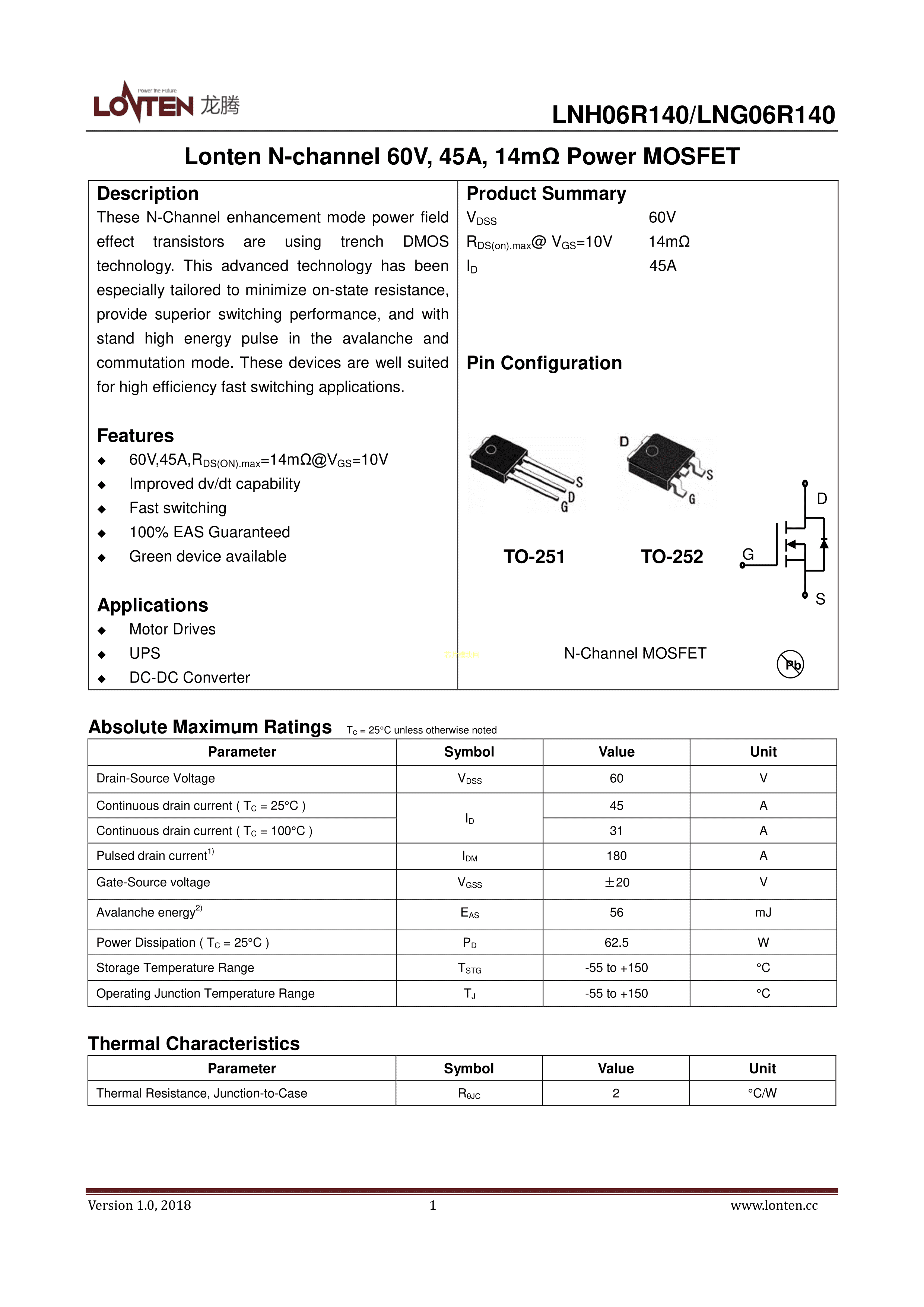 LNG06R140数据手册TO-252封装LONTEN(龙腾半导体)PDF规格书,中英文下载