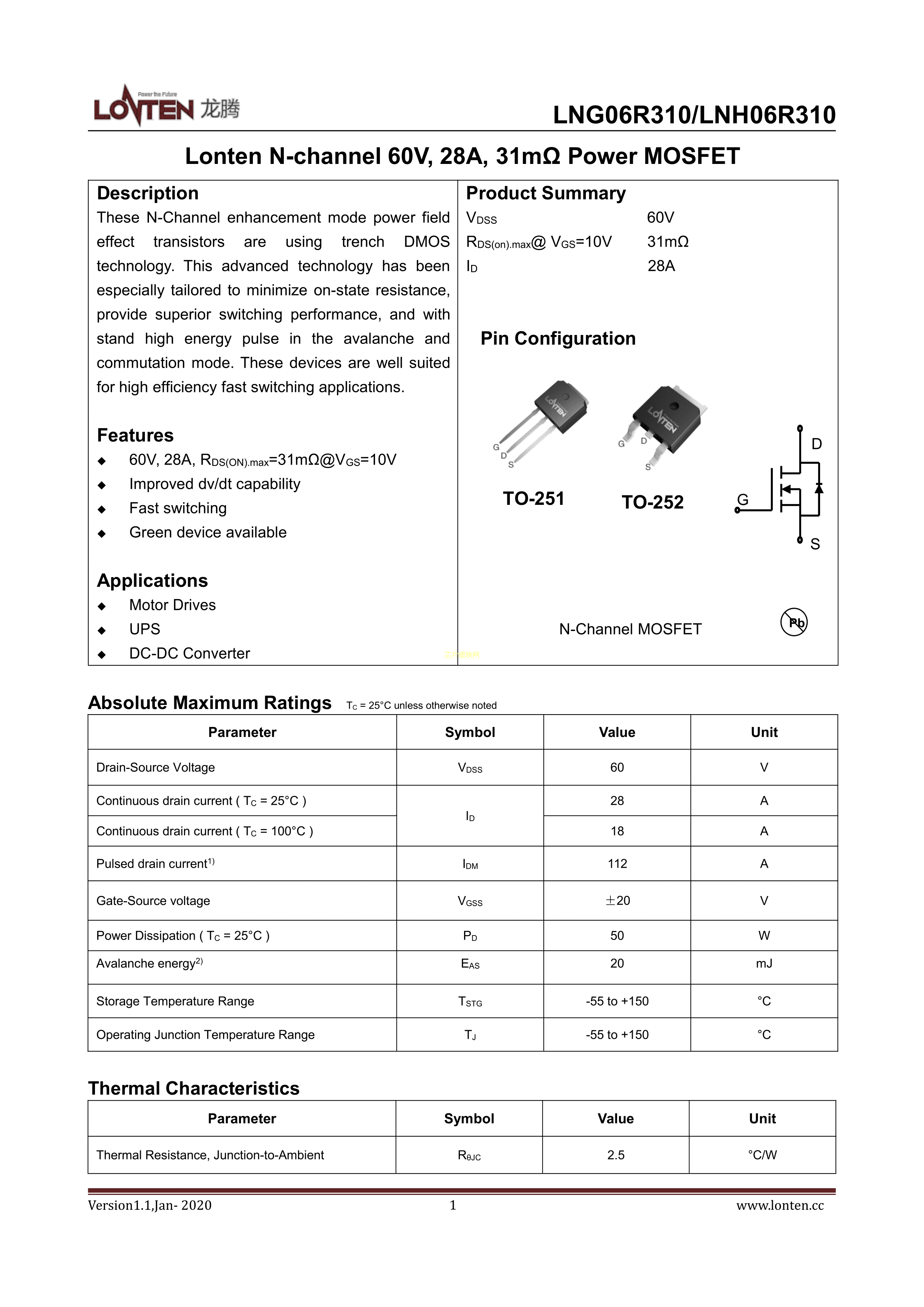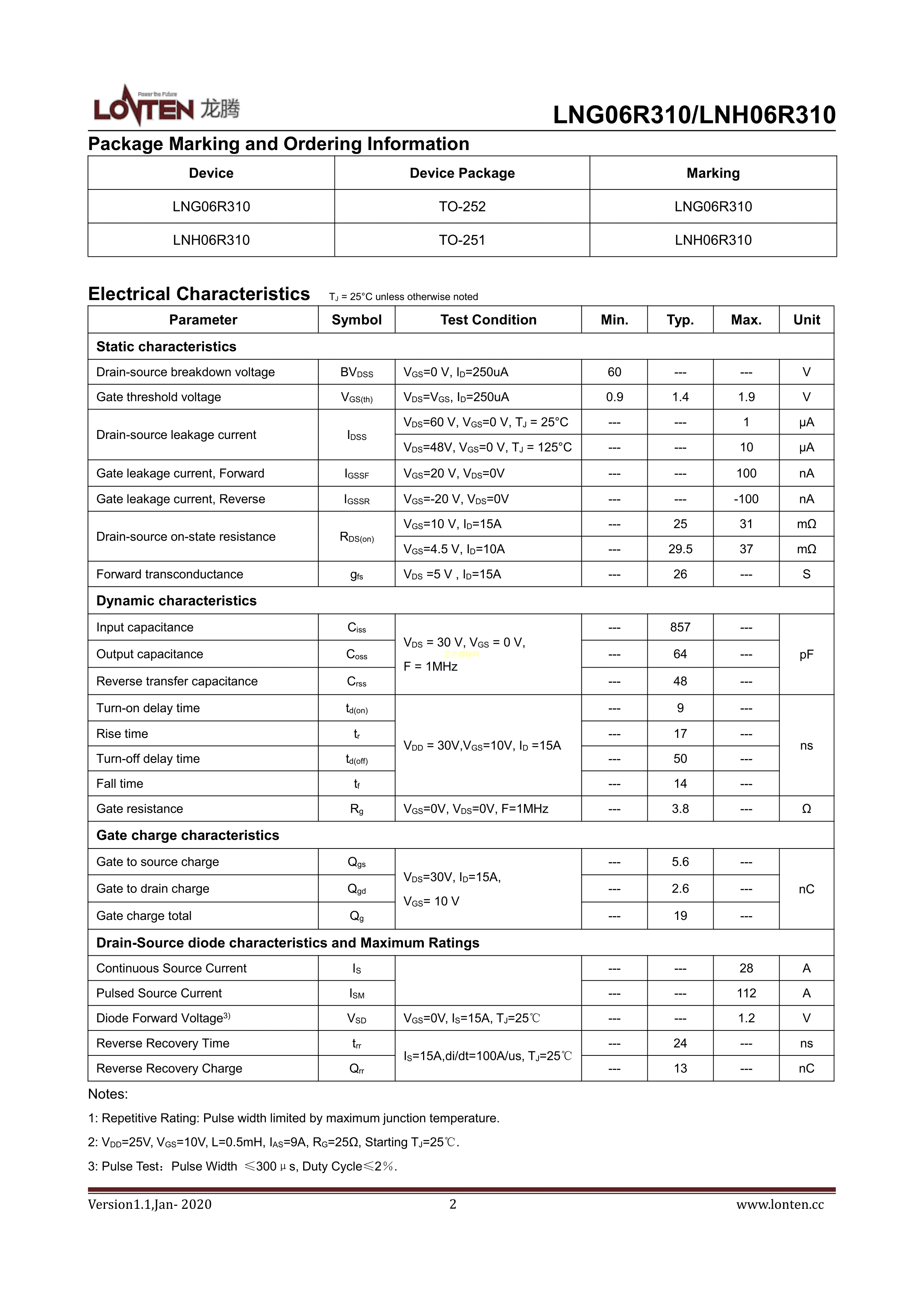LNG06R310数据手册TO-252封装LONTEN(龙腾半导体)PDF规格书,中英文下载