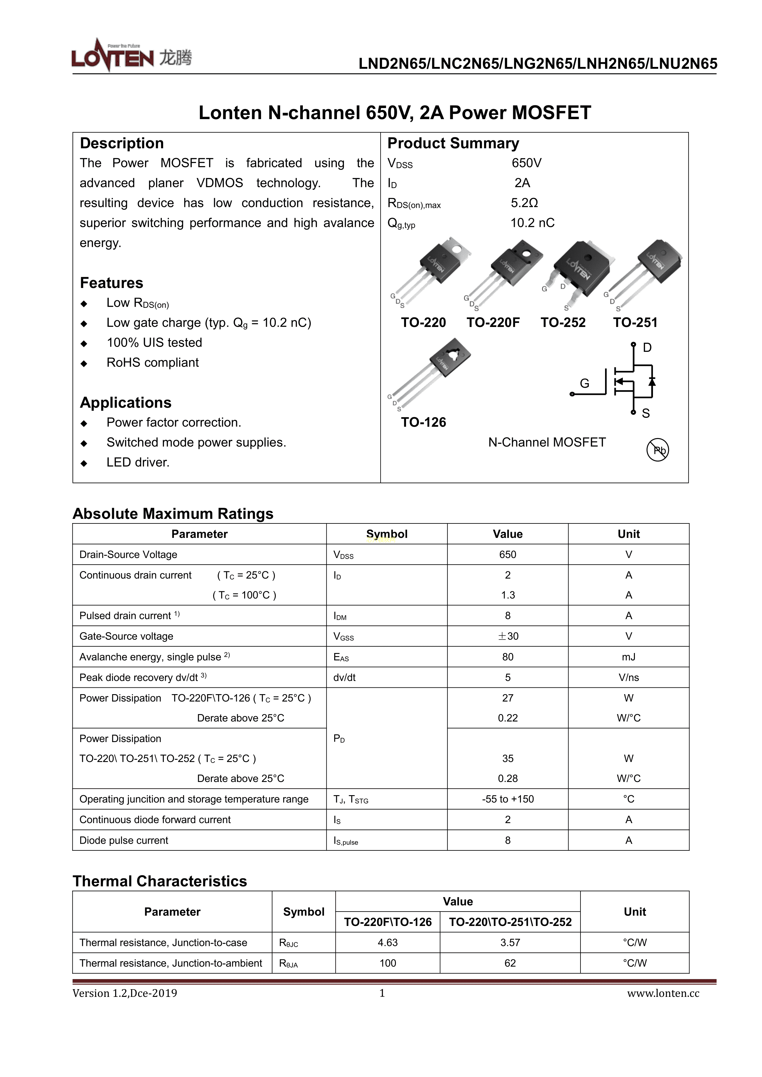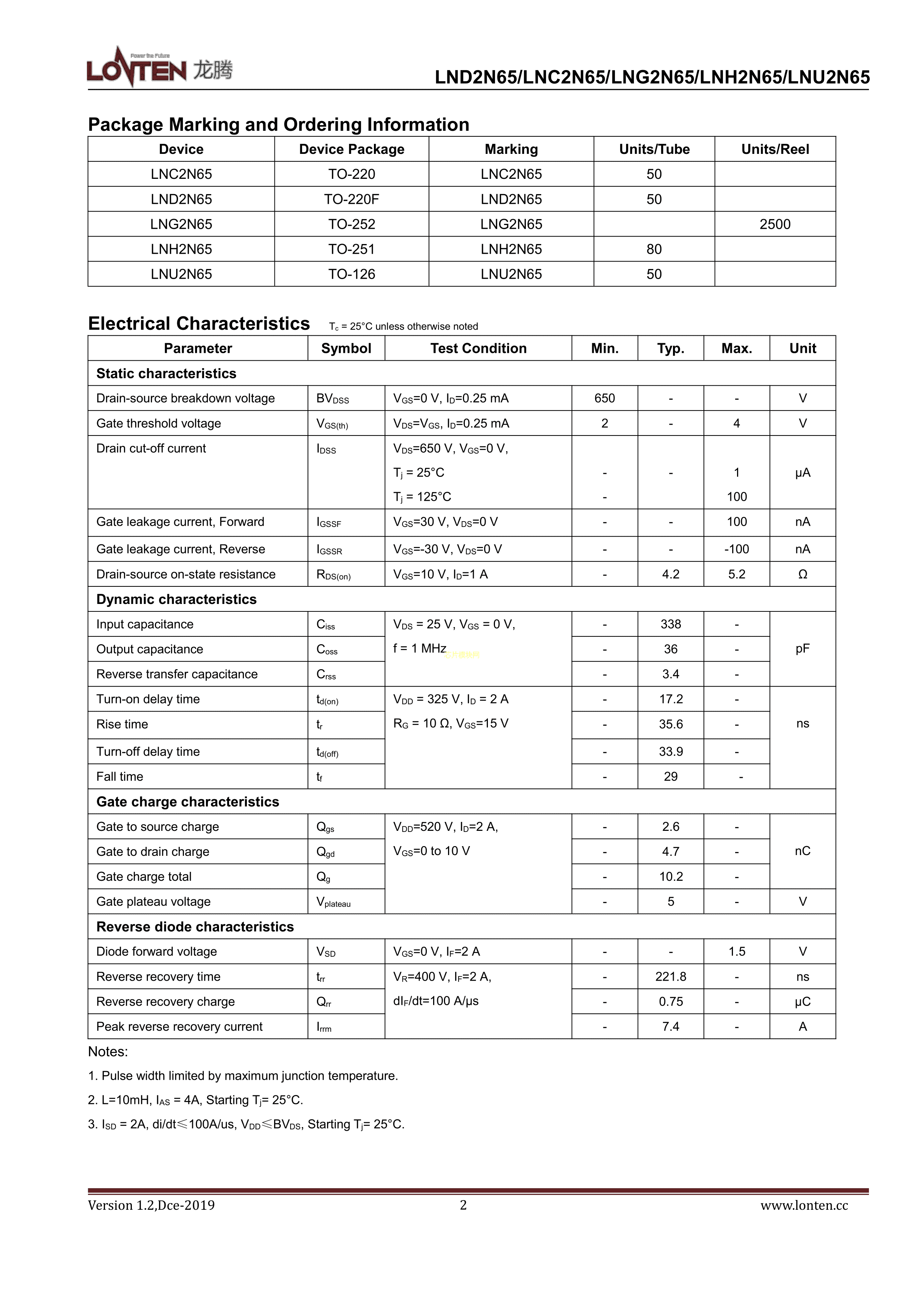 LNU2N65数据手册TO-126封装LONTEN(龙腾半导体)PDF规格书,中英文下载