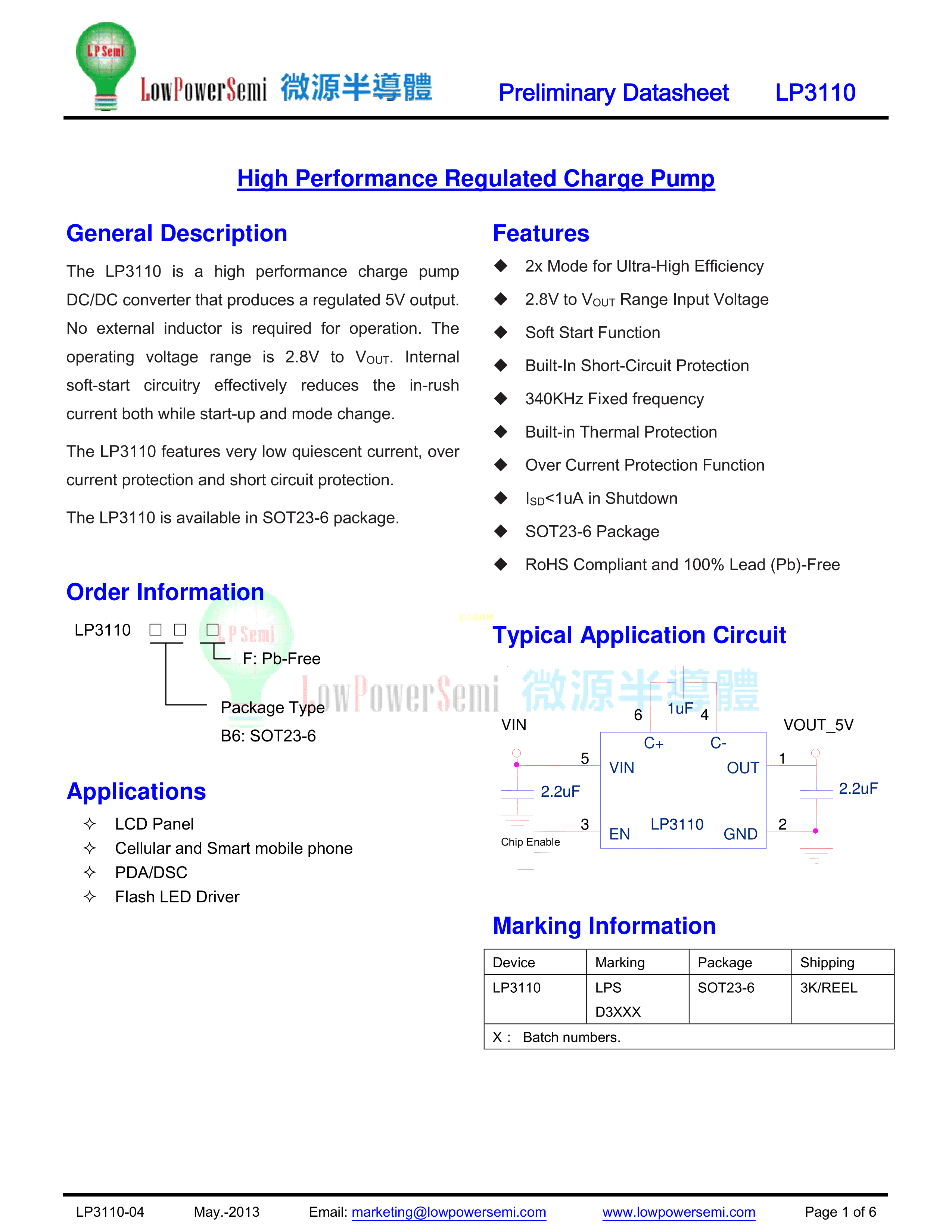 LP3110B6F数据手册SOT-23-6封装LOWPOWER(微源半导体)PDF规格书,中英文下载