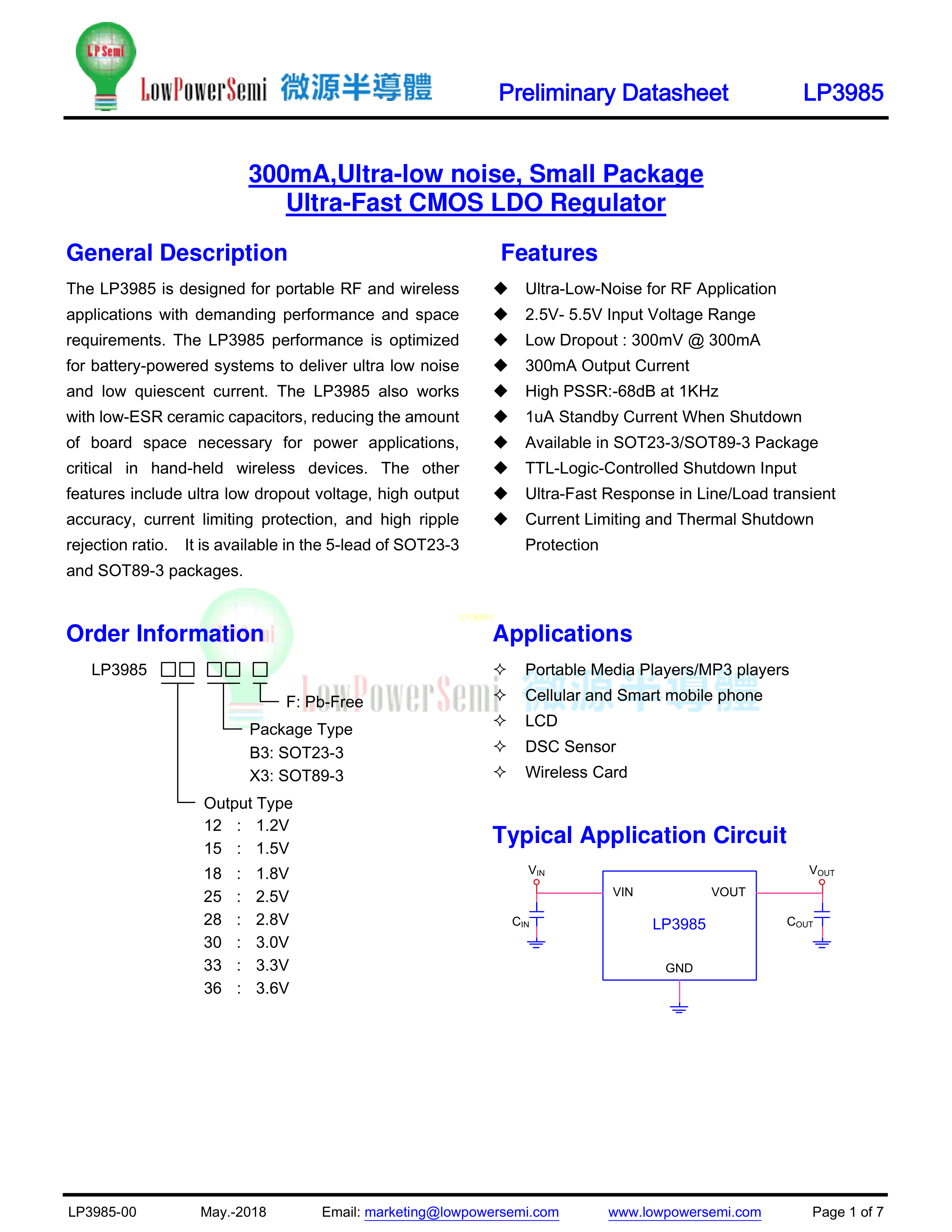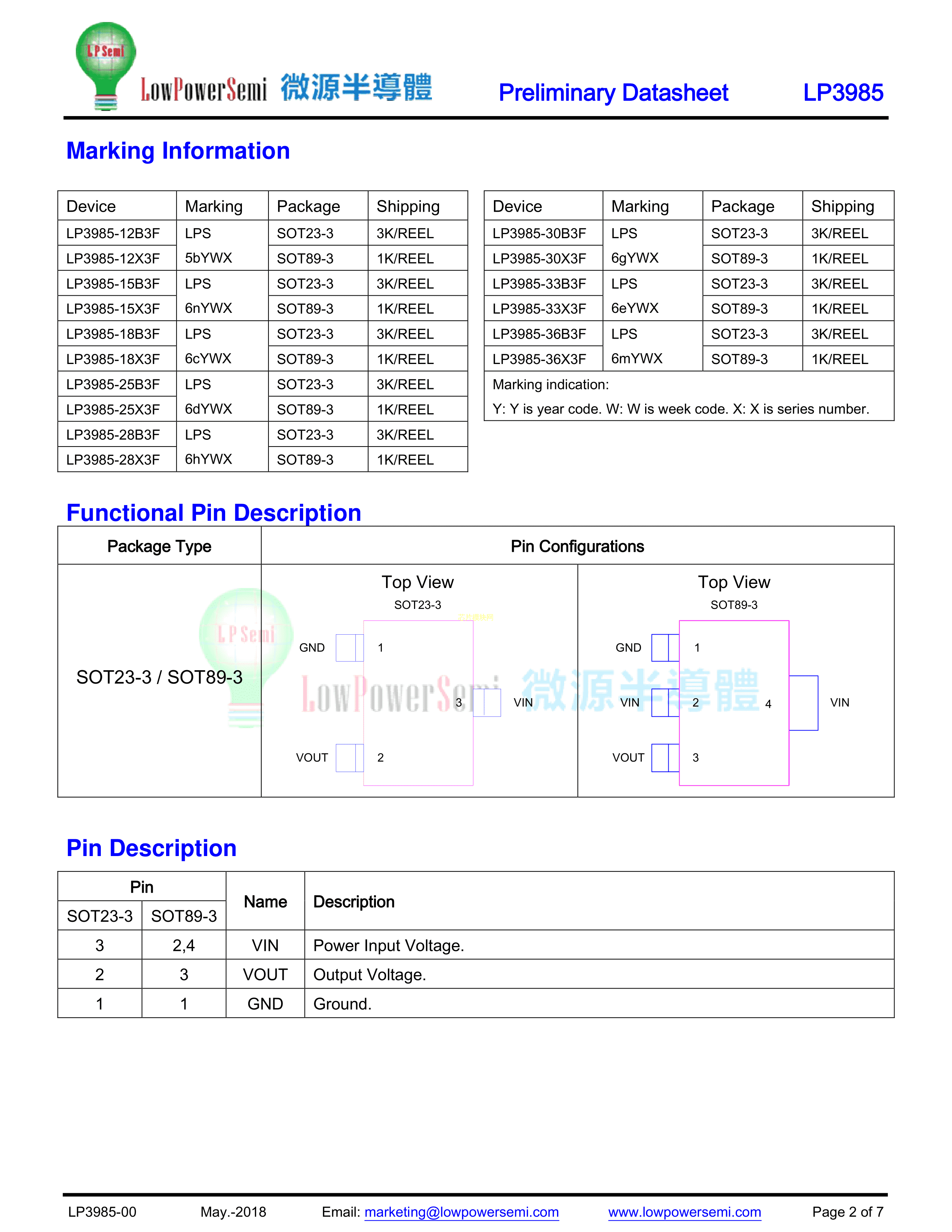 LP3985-25B3F数据手册SOT-23-3封装LOWPOWER(微源半导体)PDF规格书,中英