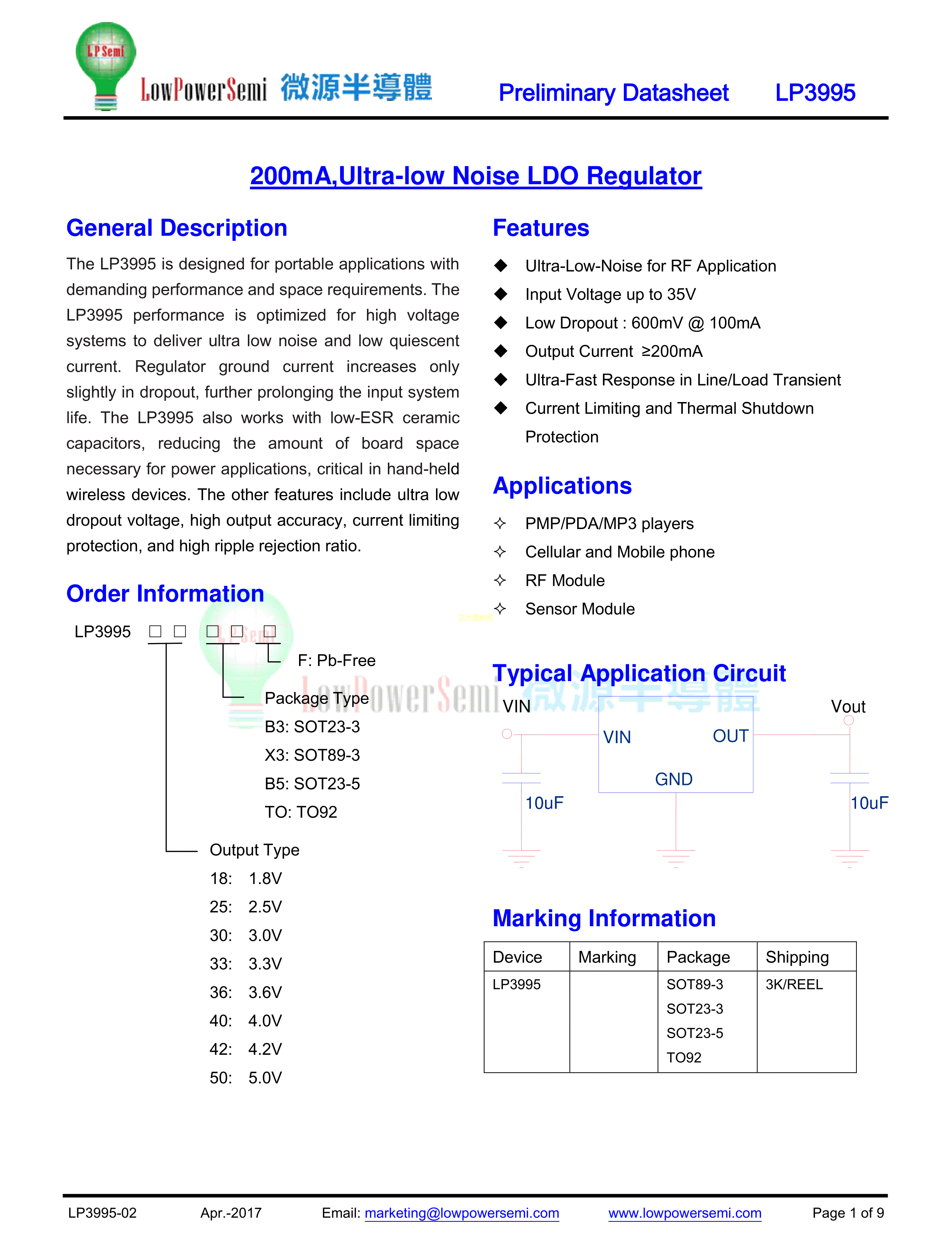 LP3995-50B3F数据手册SOT-23-3封装LOWPOWER(微源半导体)PDF规格书,中英