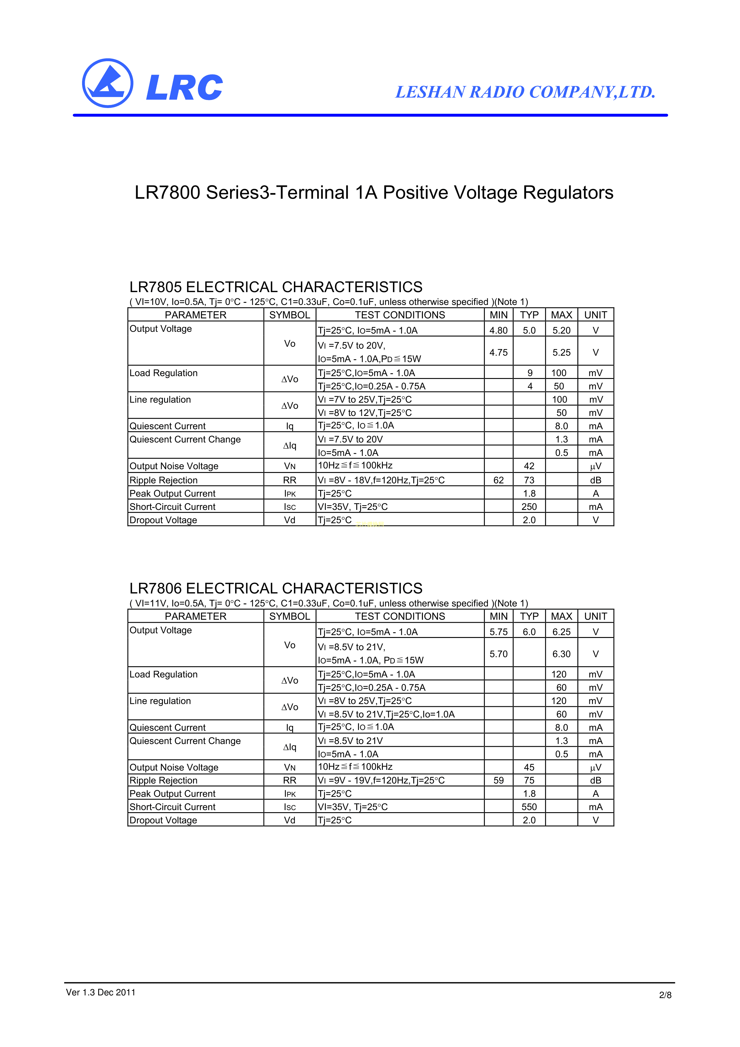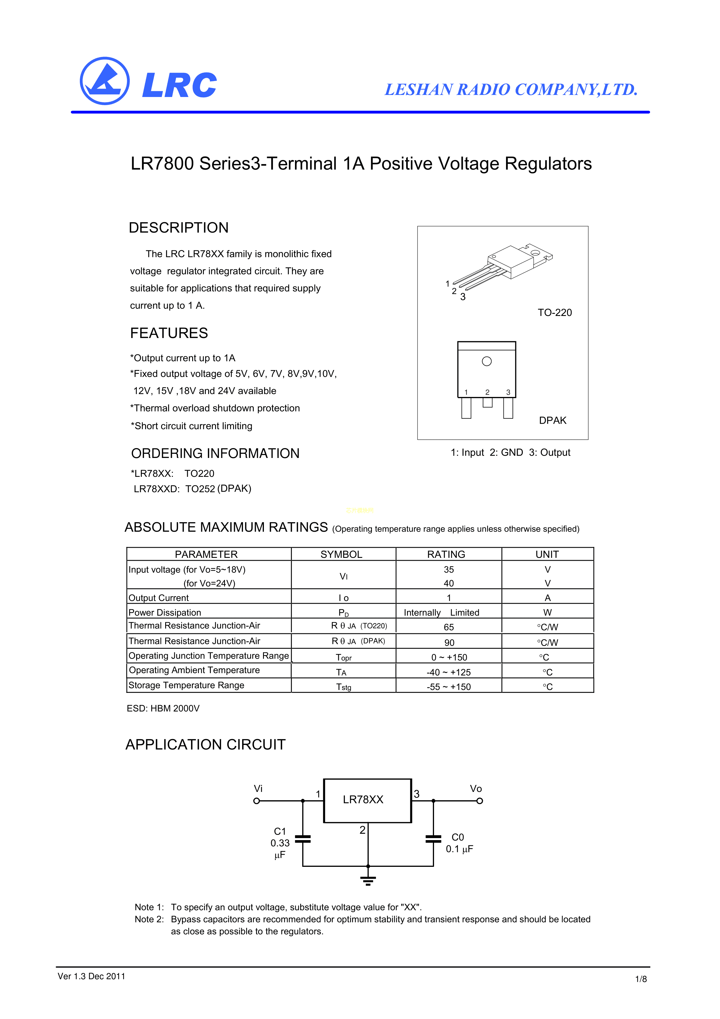 LR7805数据手册TO-220封装LRC(乐山无线电)PDF规格书,中英文下载