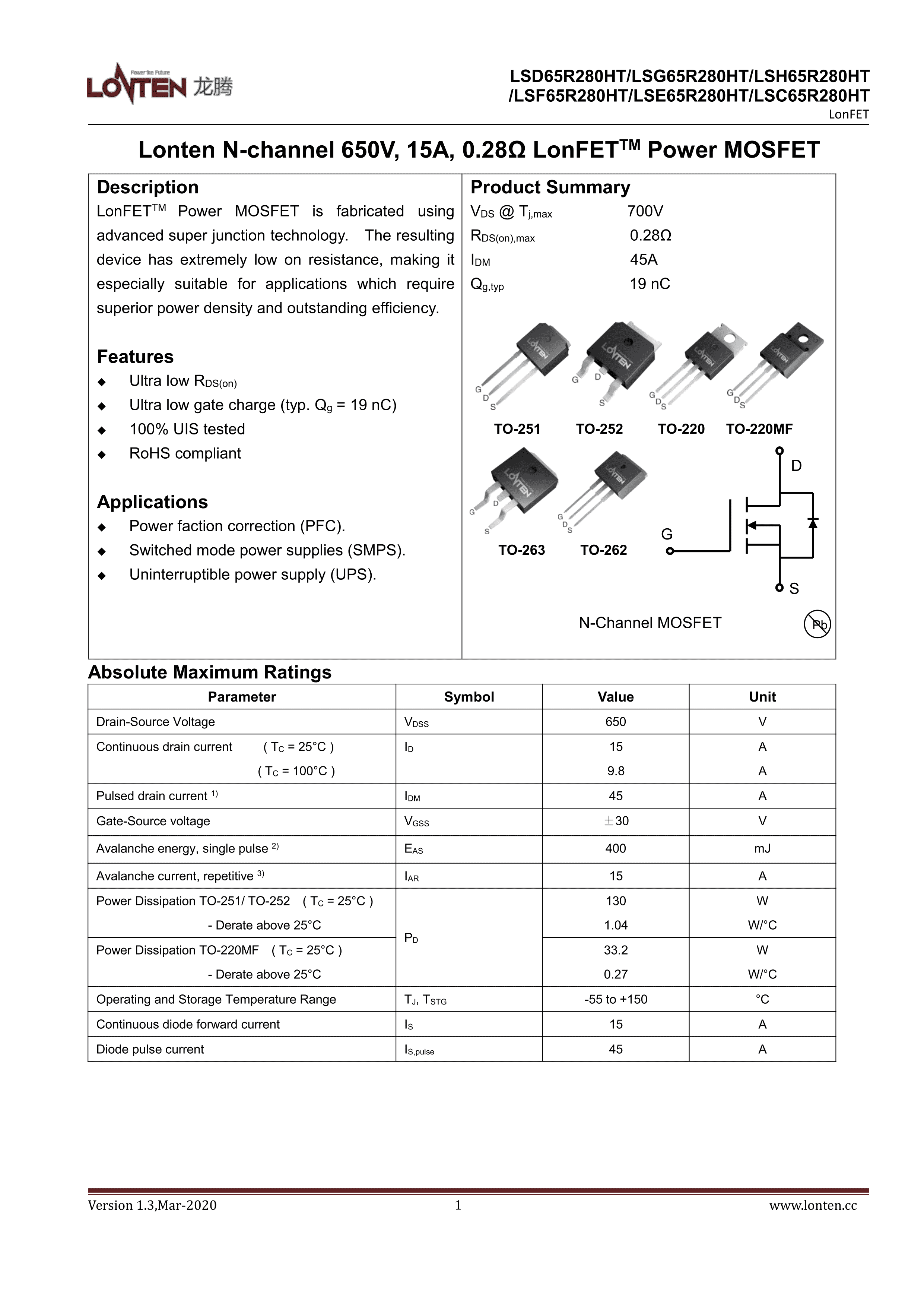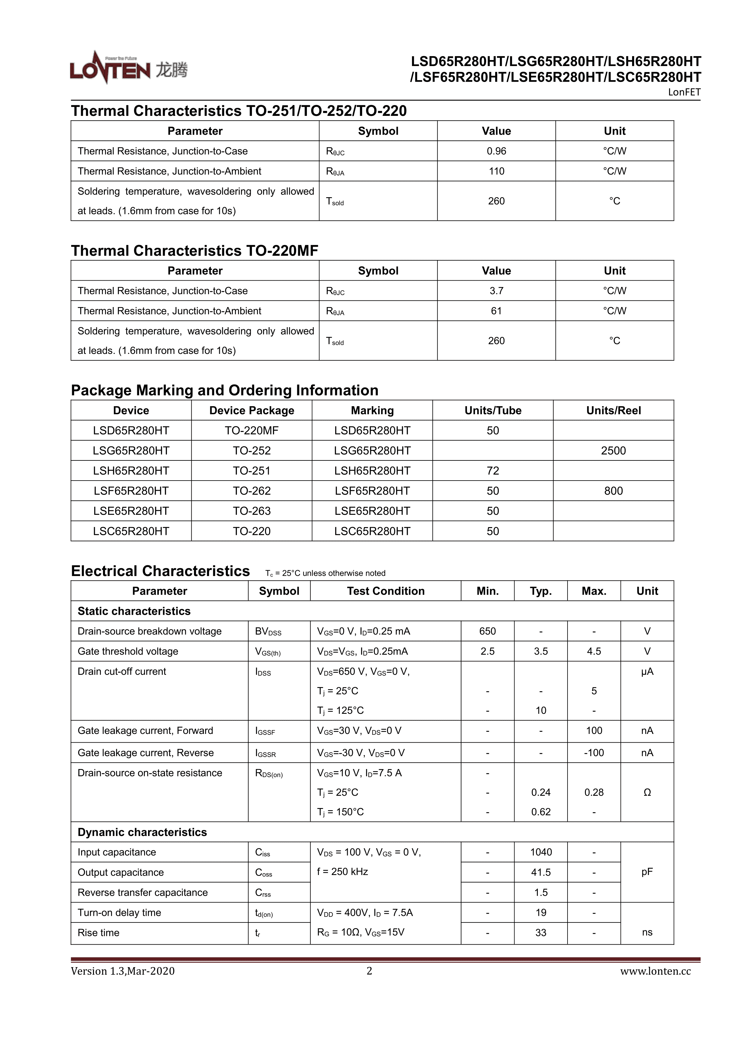 LSC65R280HT数据手册TO-220封装LONTEN(龙腾半导体)PDF规格书,中英文下载