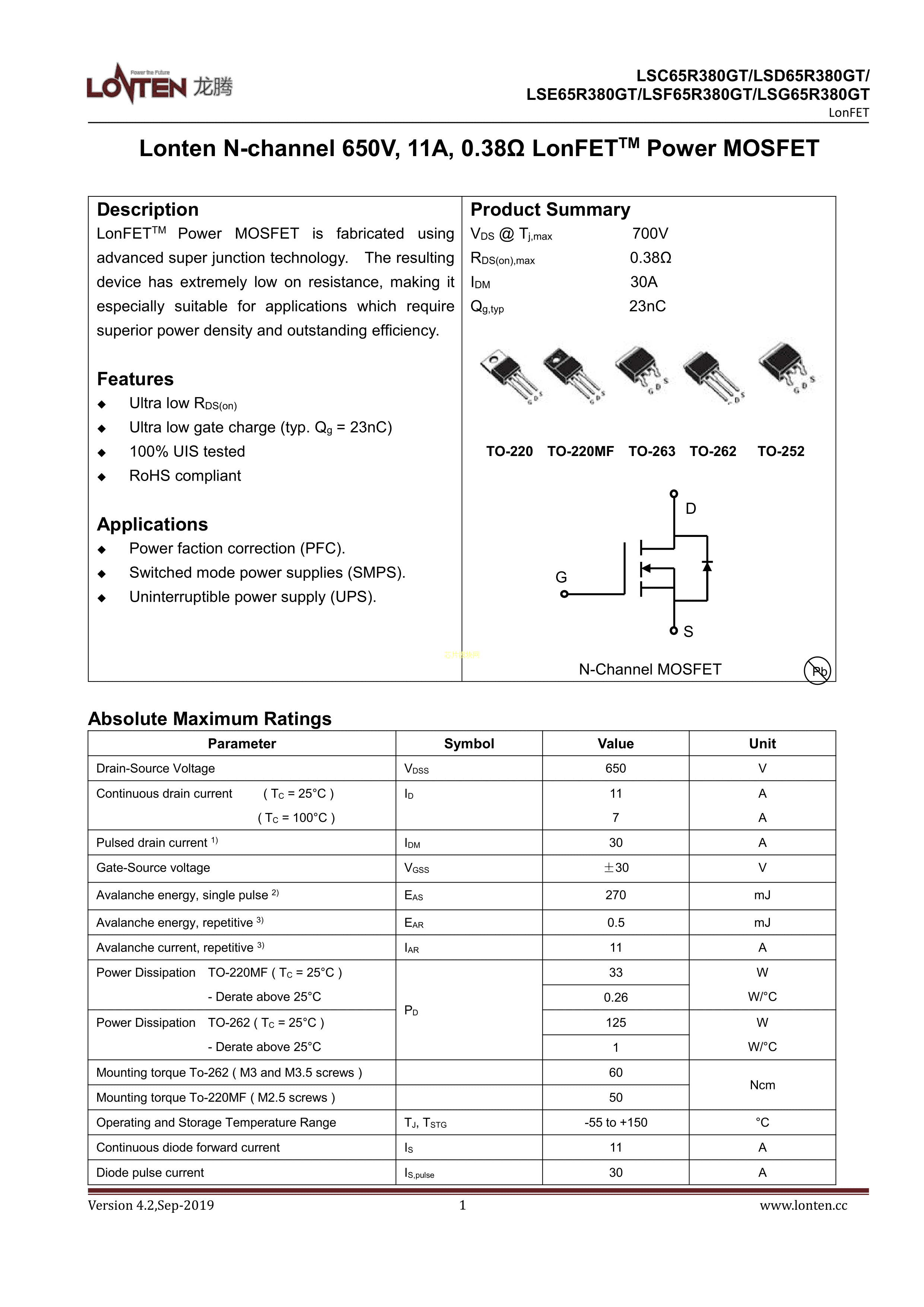 LSD65R380GT数据手册TO-220MF封装LONTEN(龙腾半导体)PDF规格书,中英文下载
