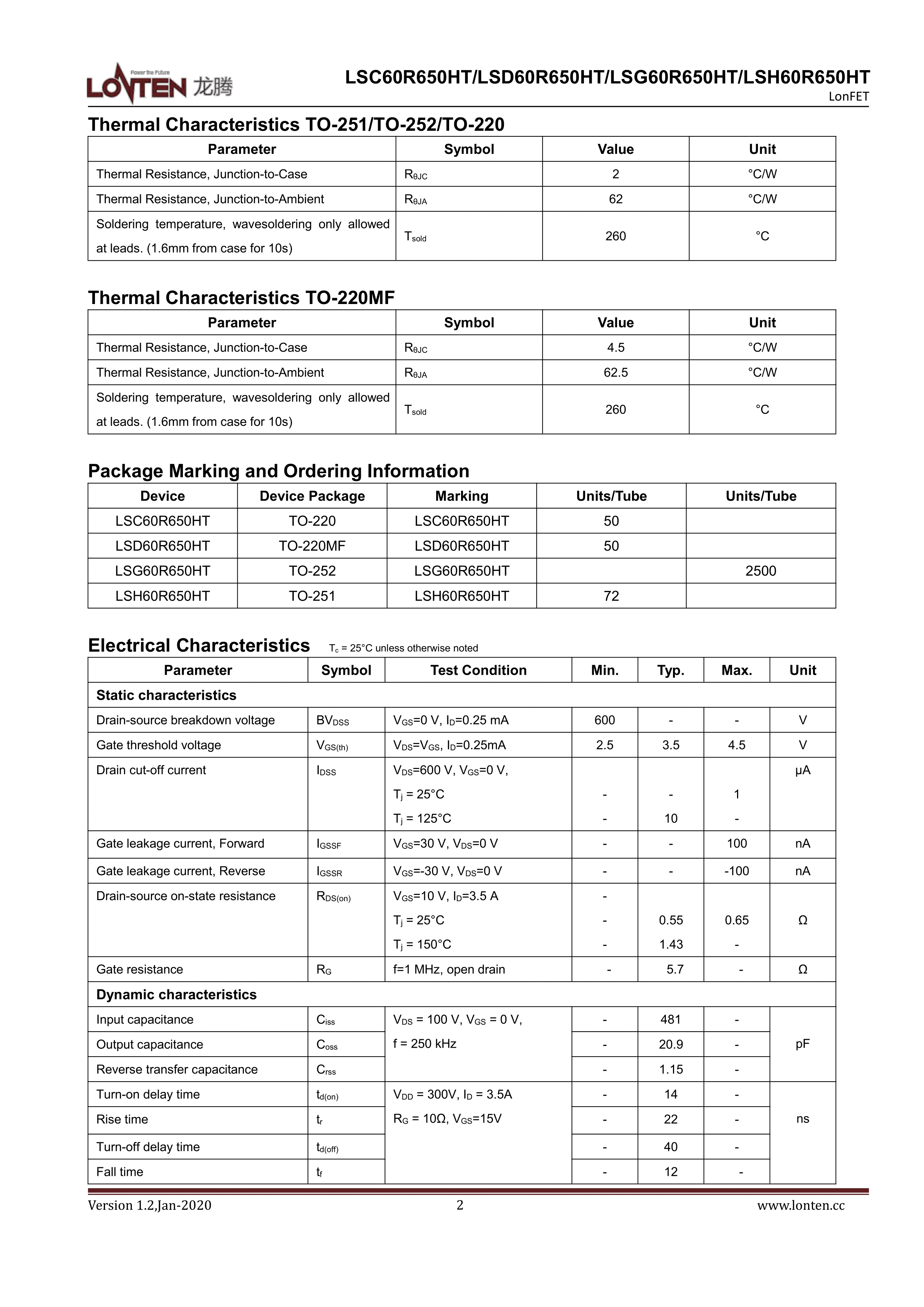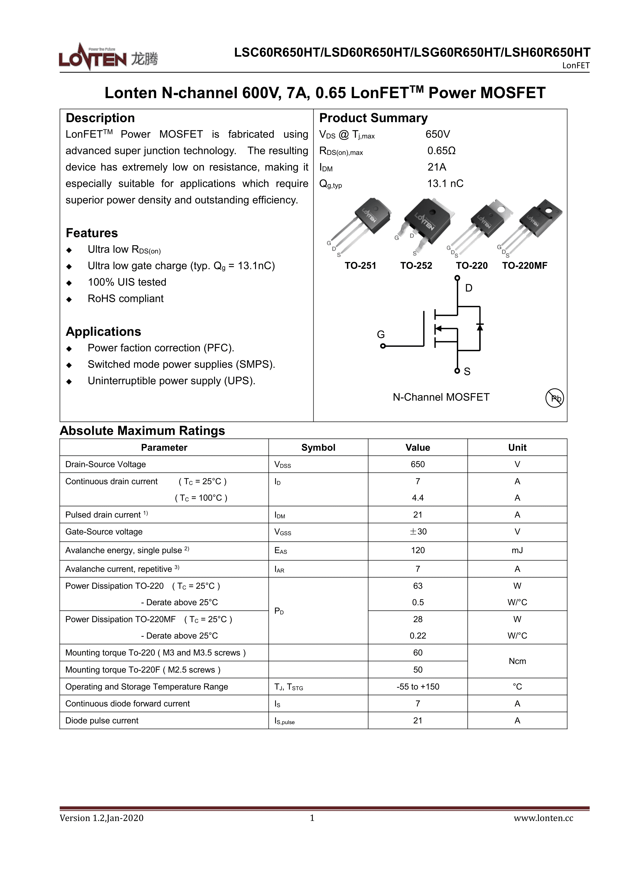 LSG60R650HT数据手册TO-252封装LONTEN(龙腾半导体)PDF规格书,中英文下载