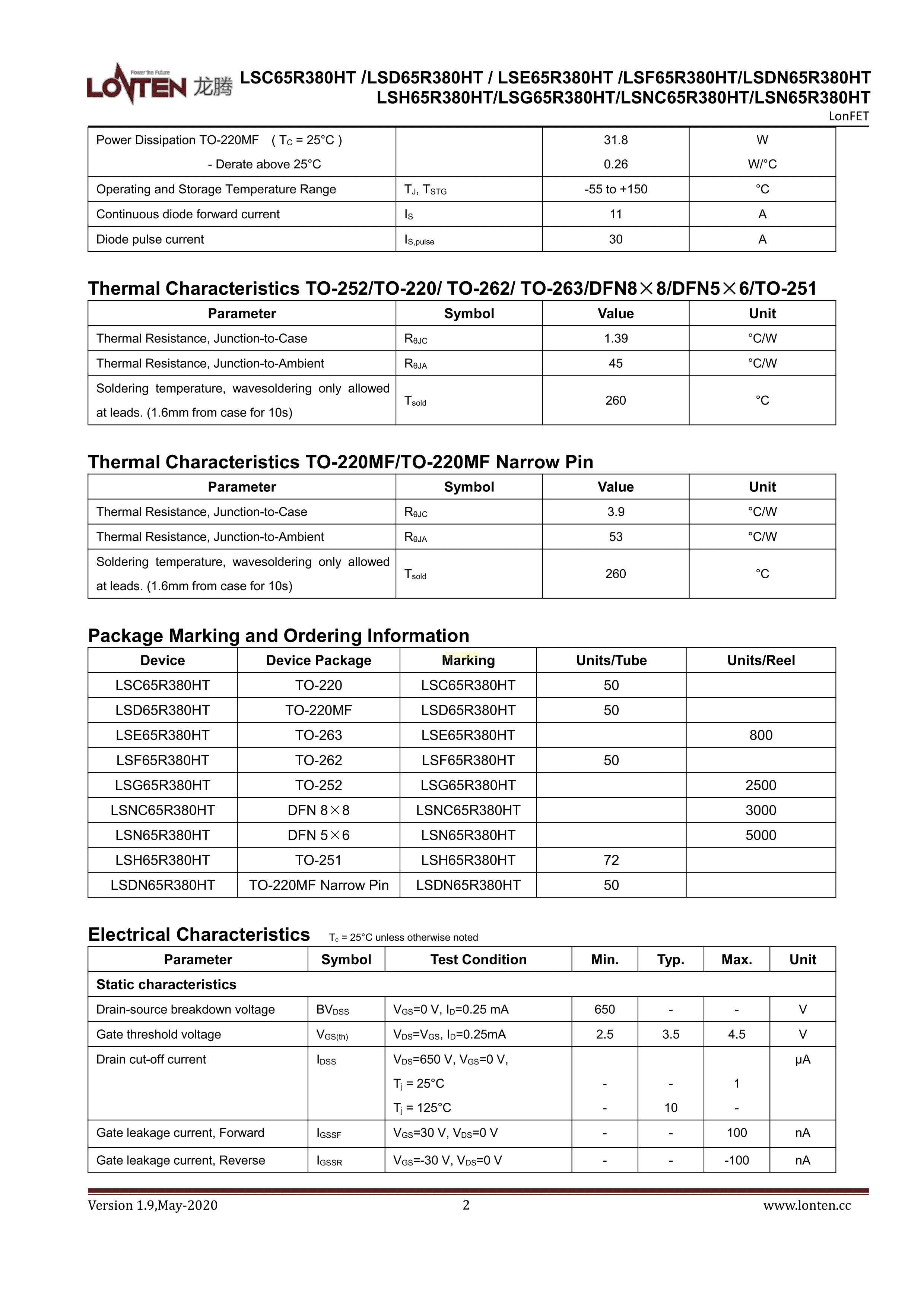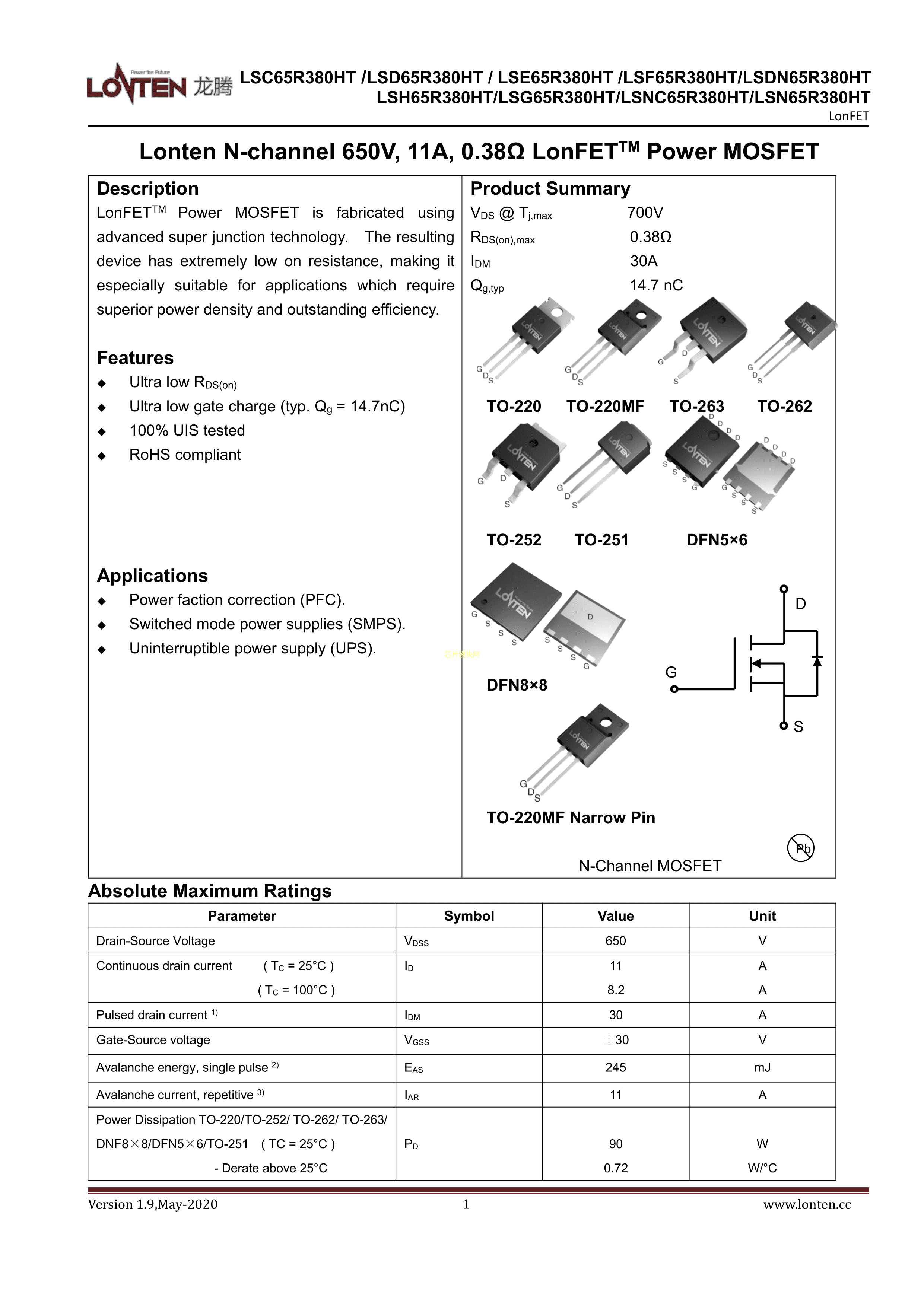 LSN65R380HT数据手册DFN(5x6)封装LONTEN(龙腾半导体)PDF规格书,中英文下载