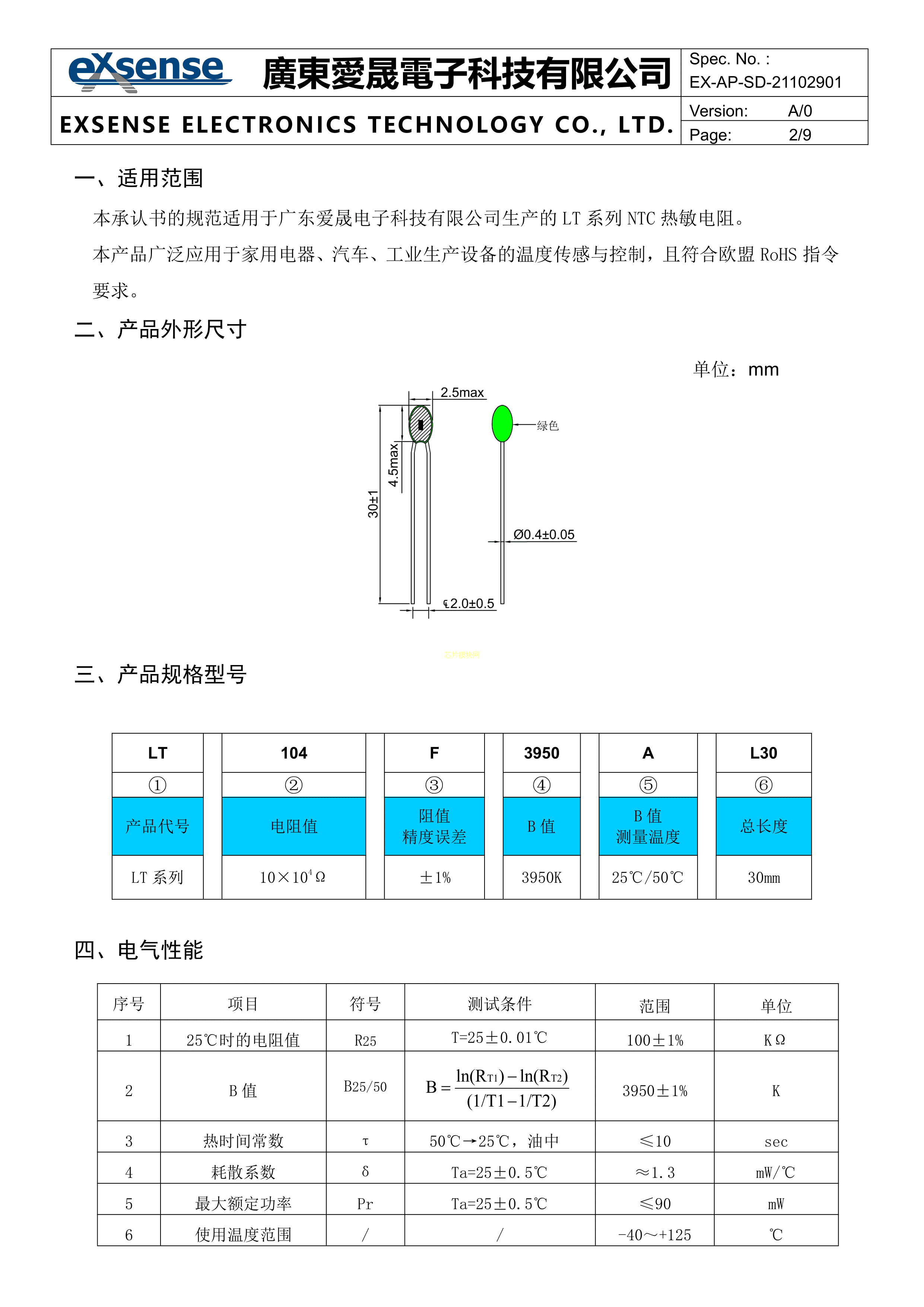 LT104F3950A-L30数据手册径向引线P2mm封装exsense(爱晟)PDF规格书,中英文下载