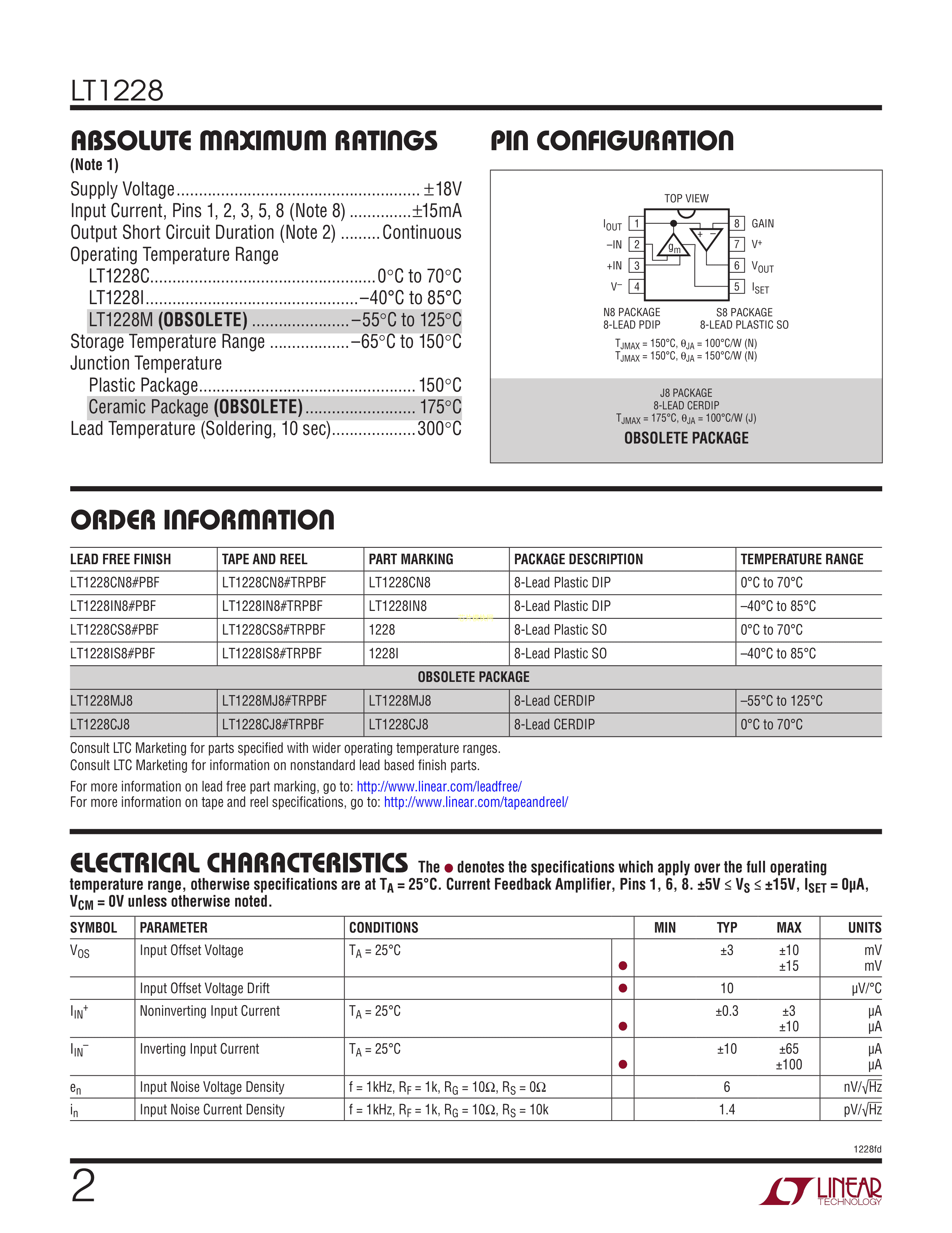 LT1228IN8#PBF数据手册PDIP-8封装ADI(亚德诺)-LINEARPDF规格书,中英文