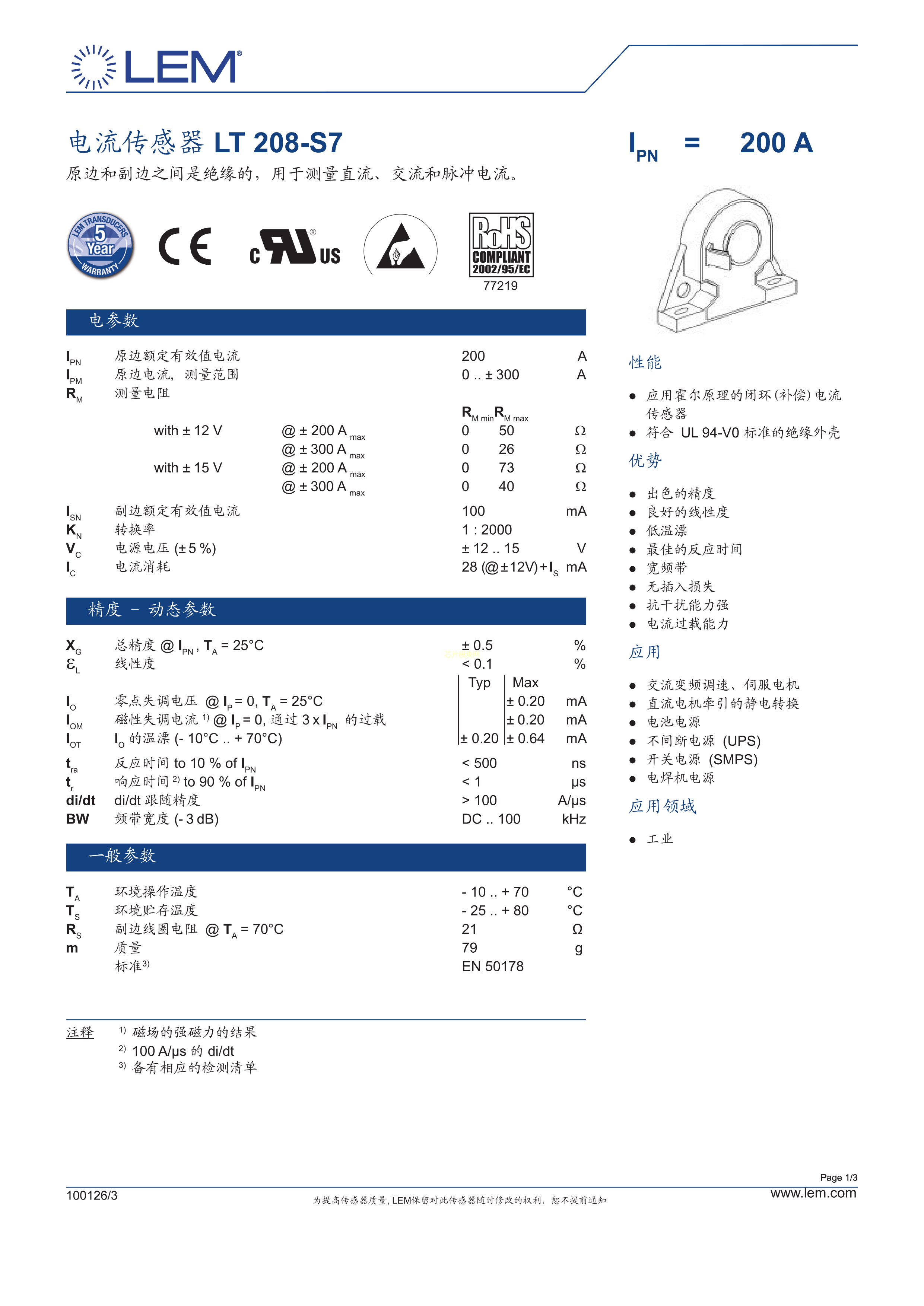 LT208-S7数据手册-封装LEM(莱姆)PDF规格书,中英文下载